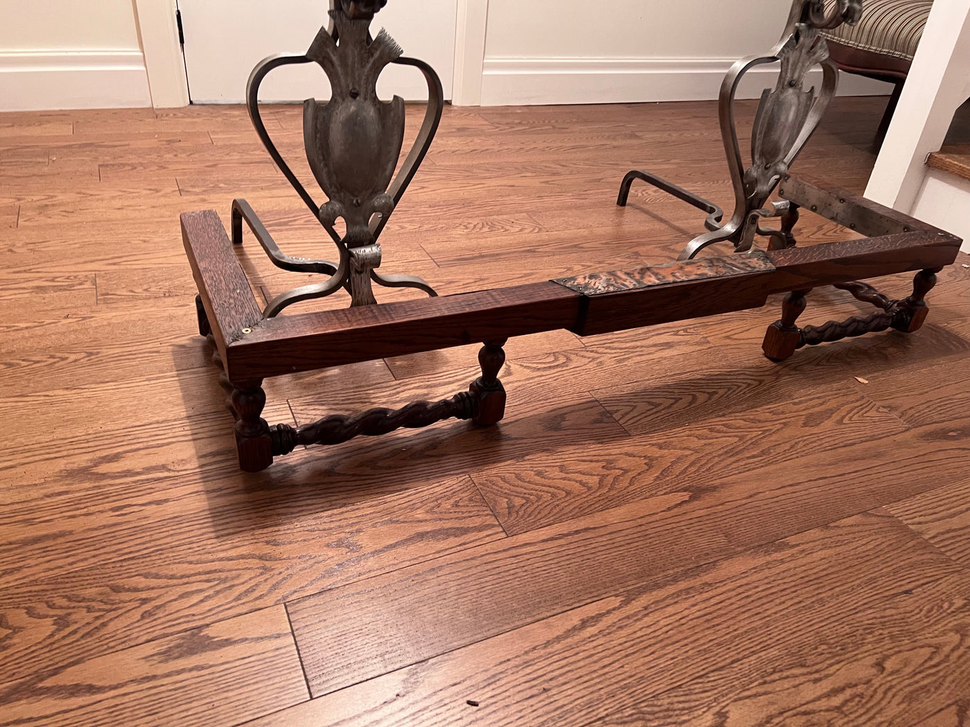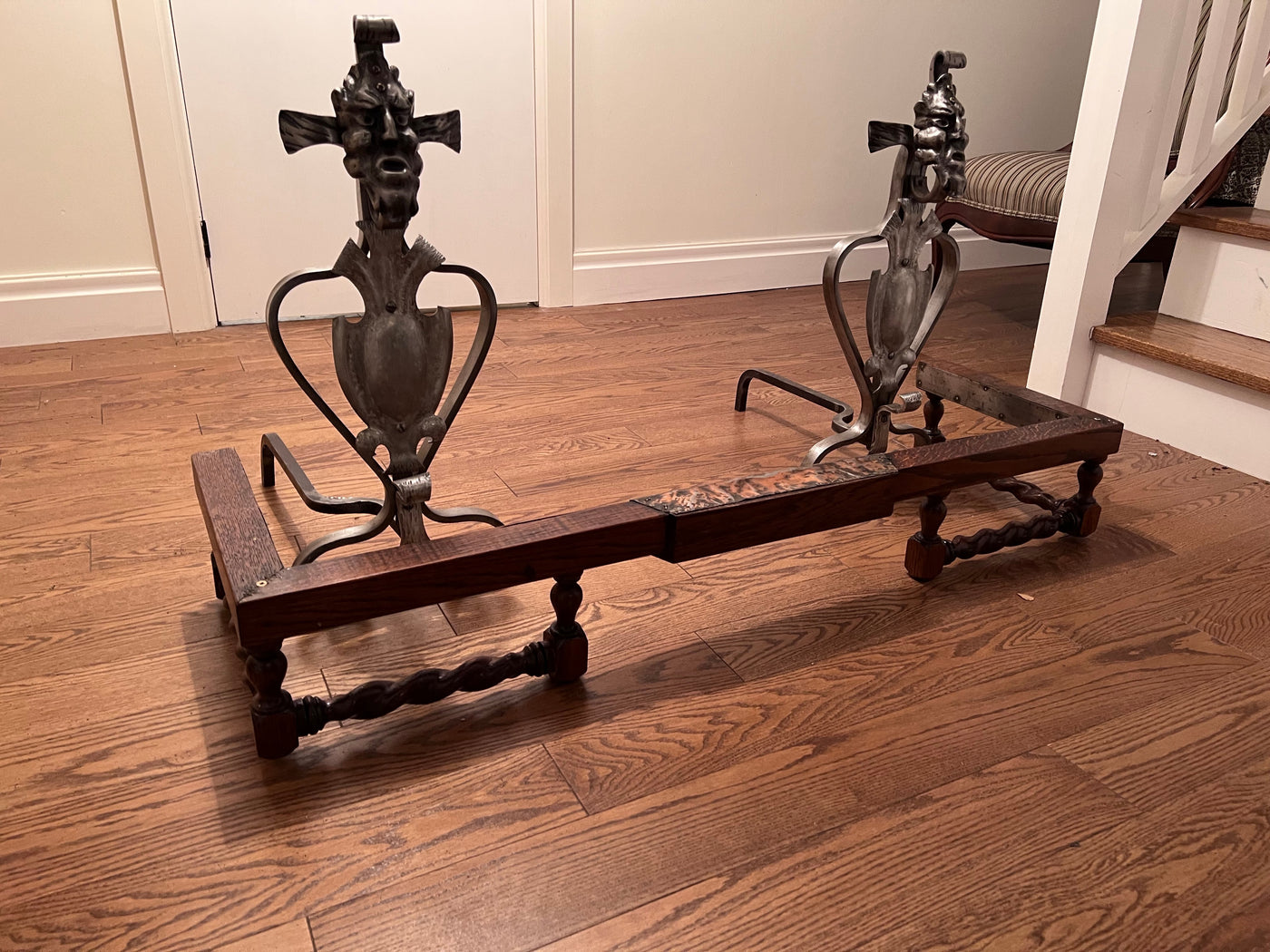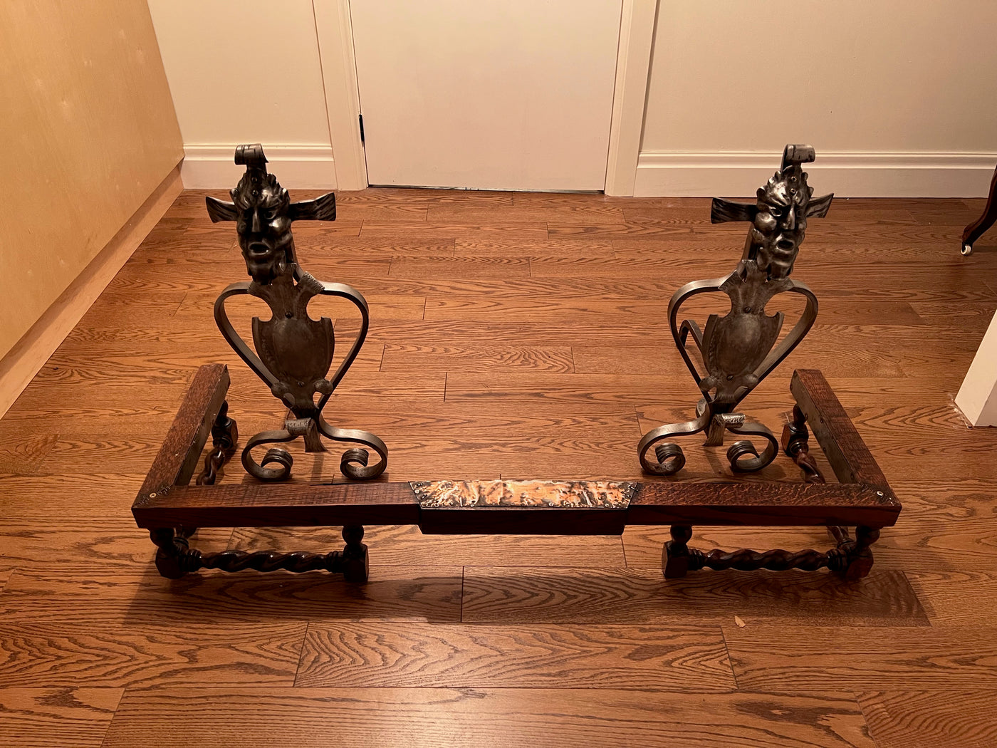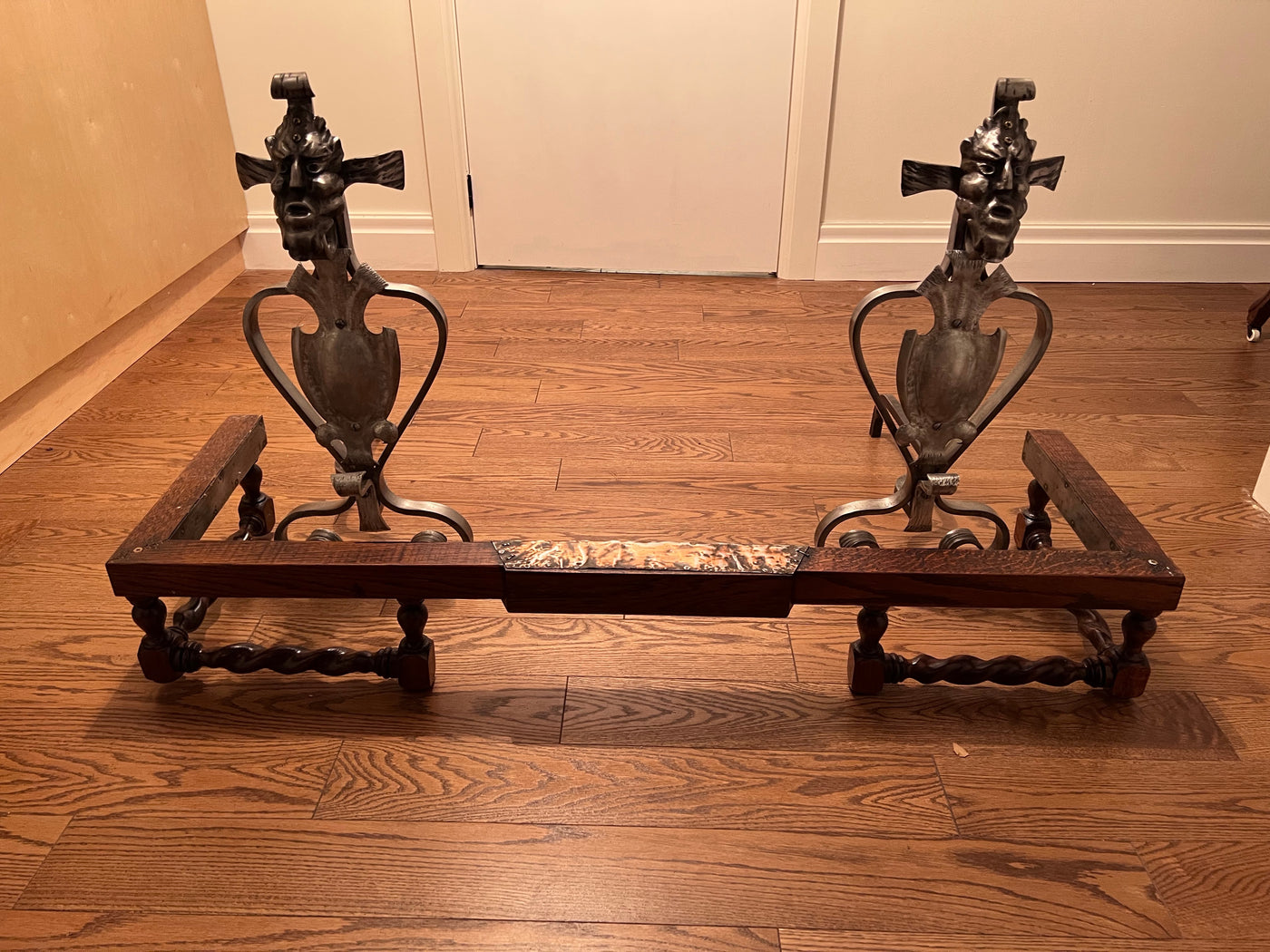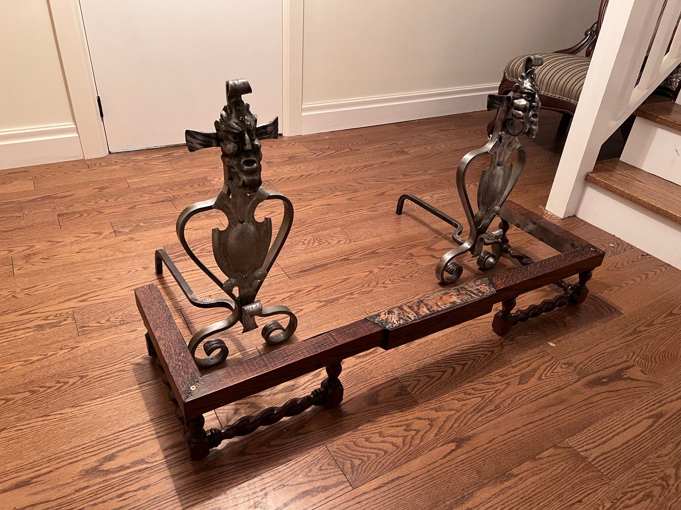Antique Fireplace Curb Fender & 2 Cast Iron Andirons