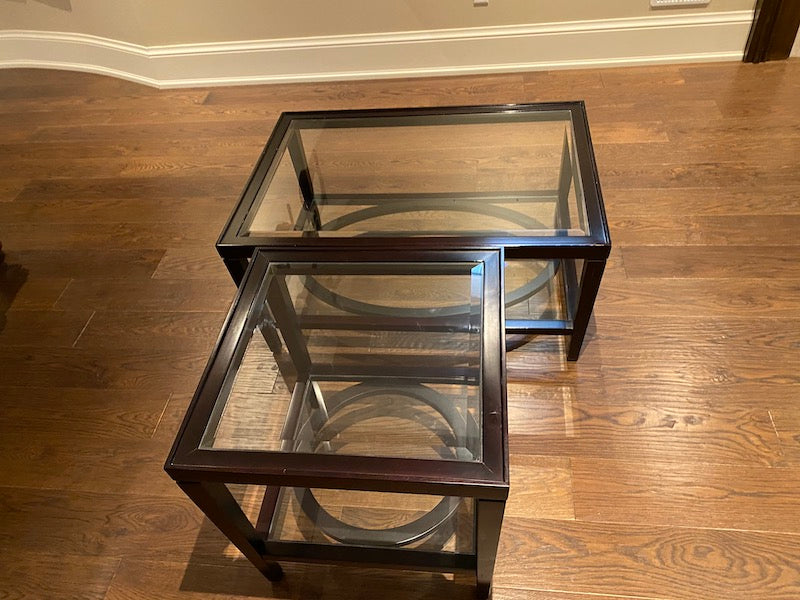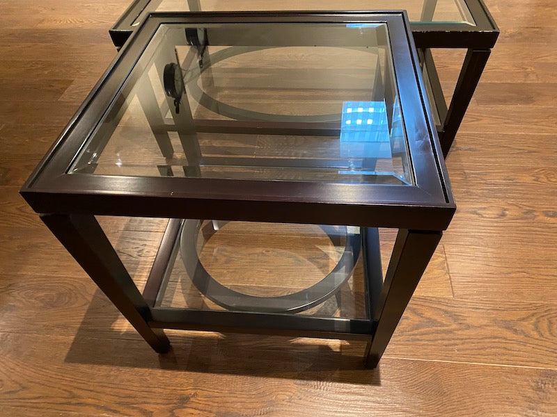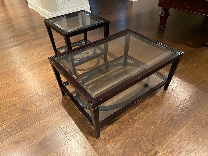 Wood & Glass Coffee Table + Matching Side Table, Brown Finish.