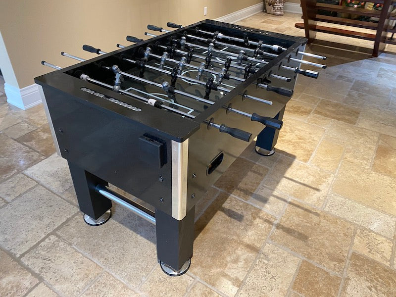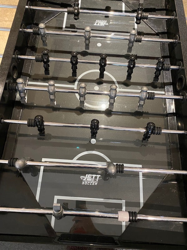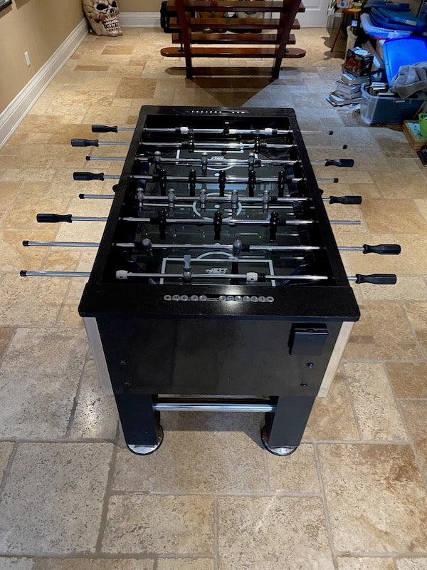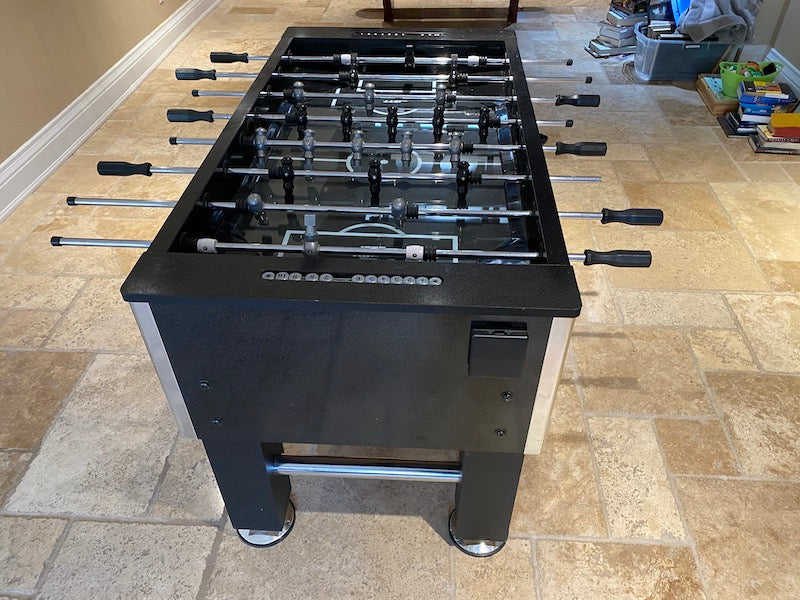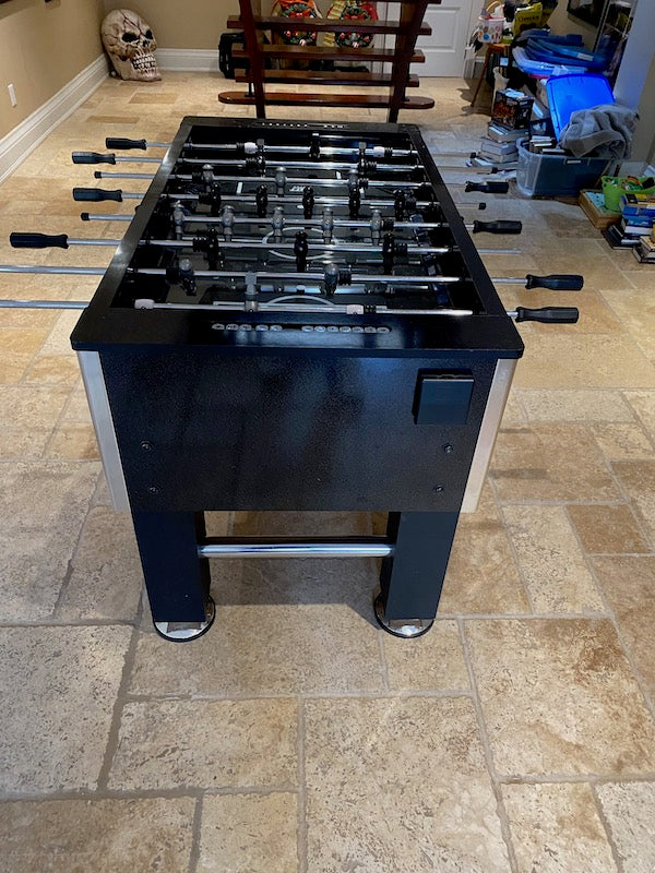 55" x 30" x 34"h (dimensions of just the table. Add a few inches on either side factoring in the poles).