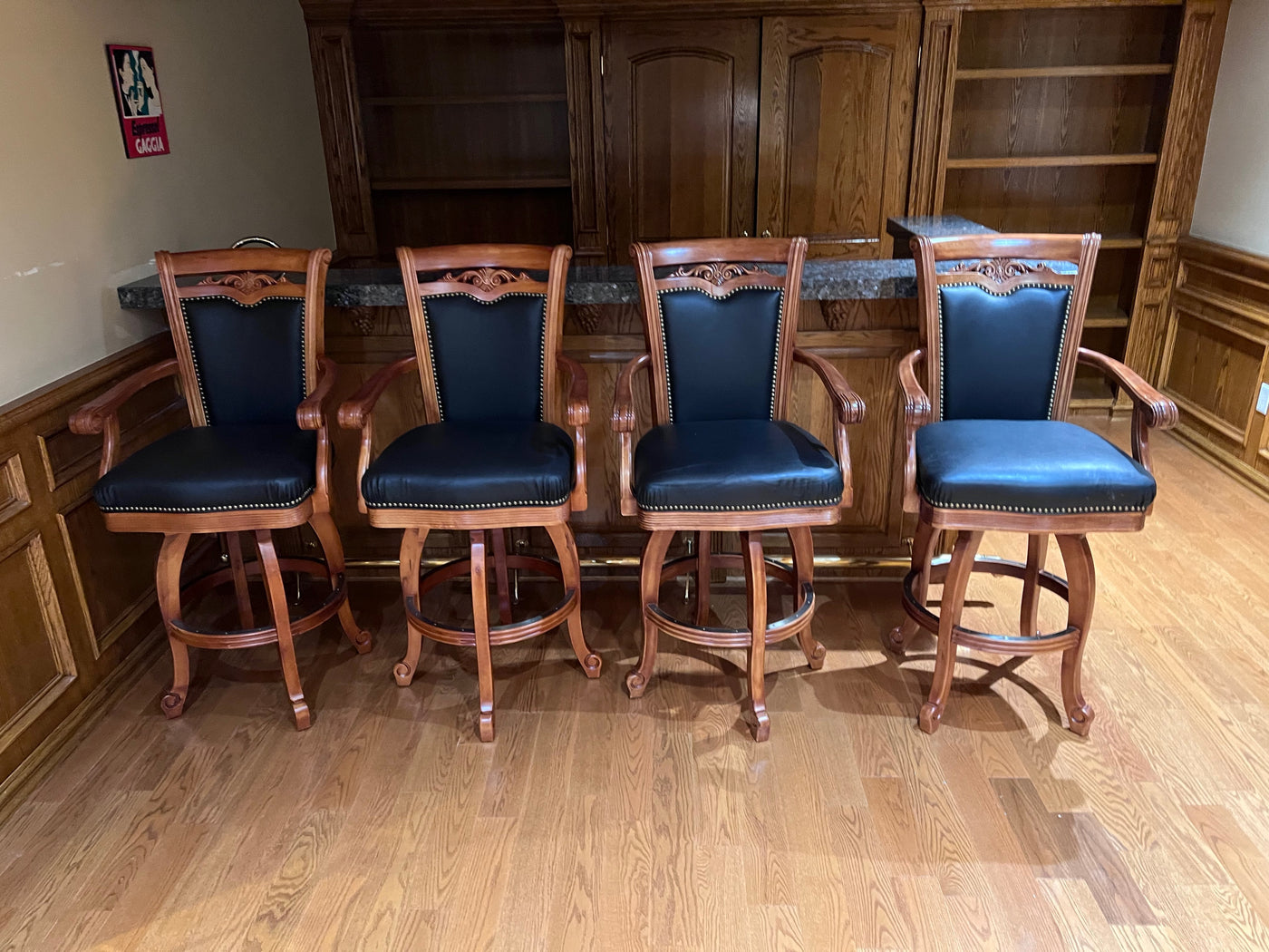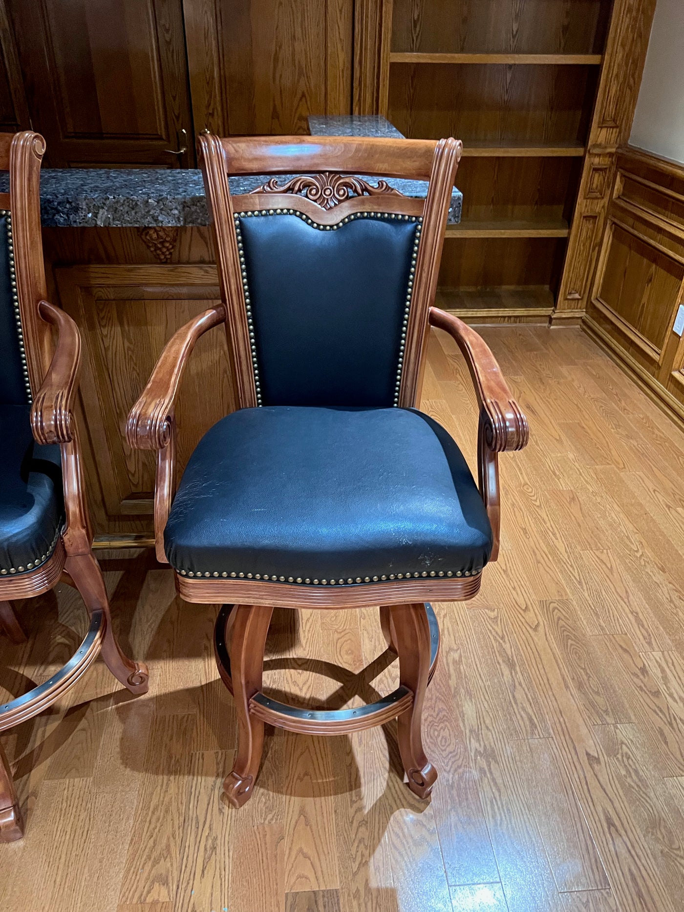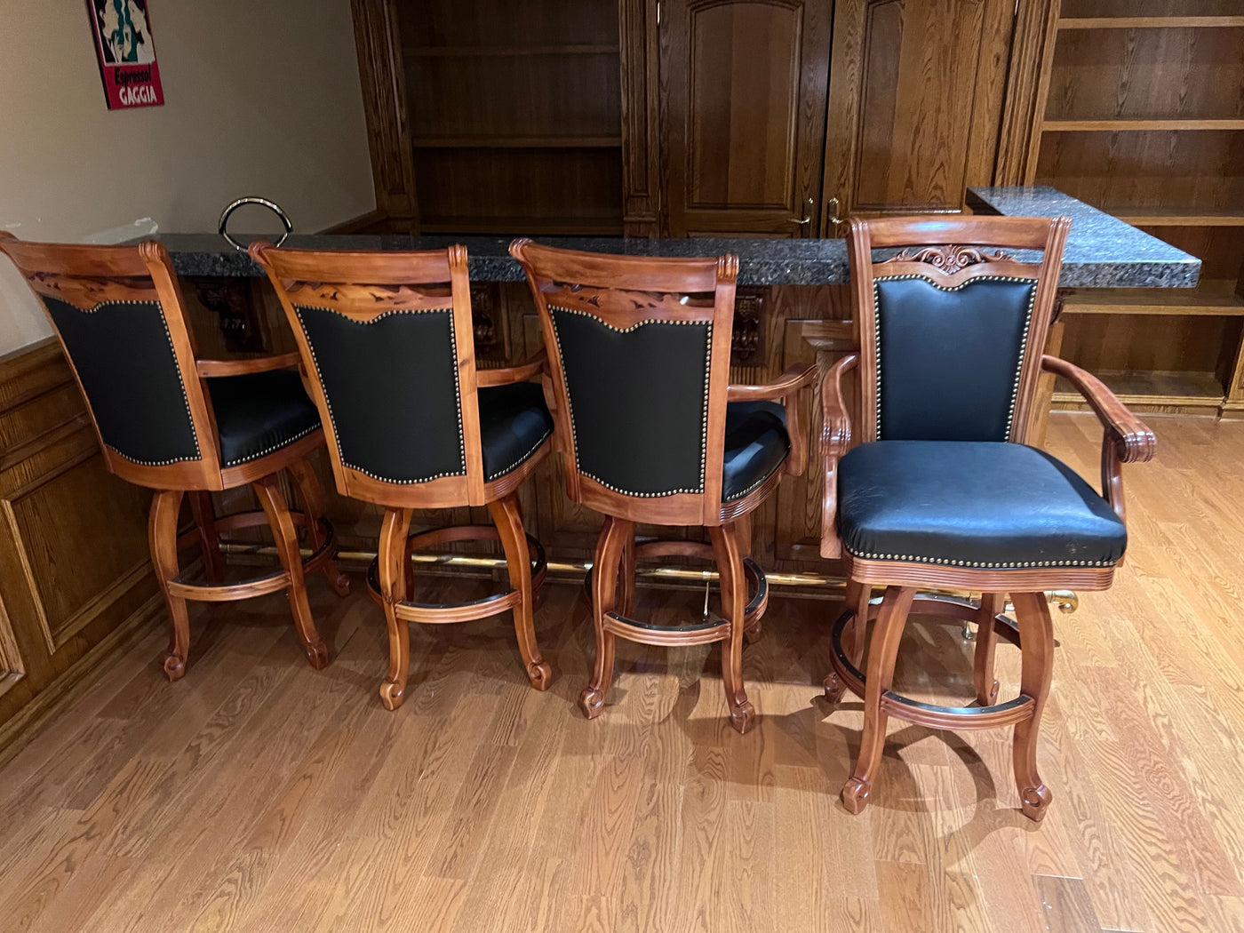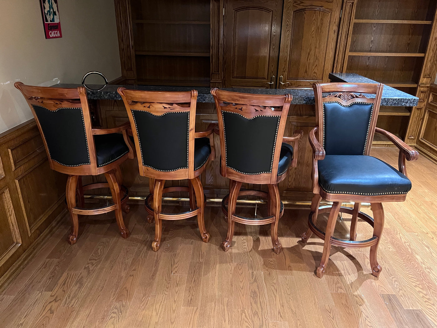 4 Wood and Black Leather Bar Stools. 1/4 chairs has some minor wear on the left side of the seat as shown in the pictures.