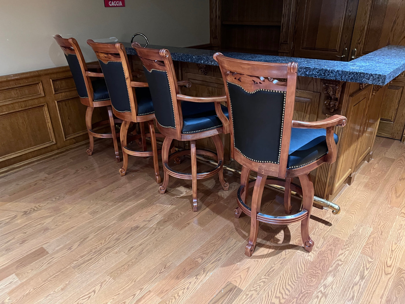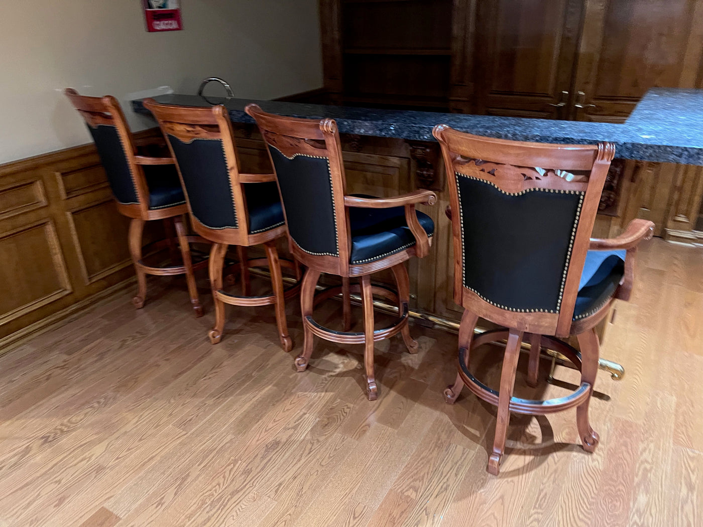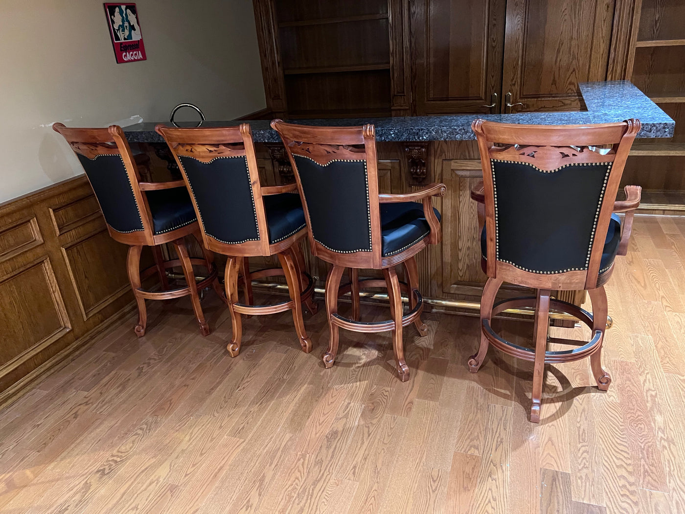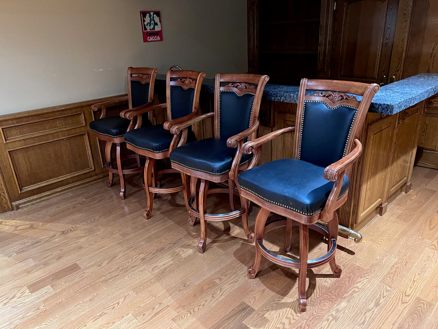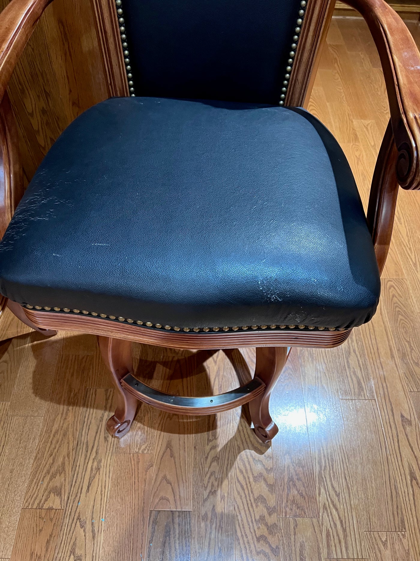 4 Wood and Black Leather Bar Stools. 1/4 chairs has some minor wear on the left side of the seat as shown in the pictures.