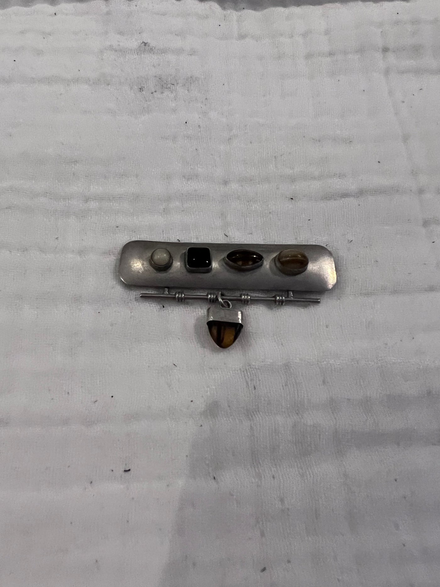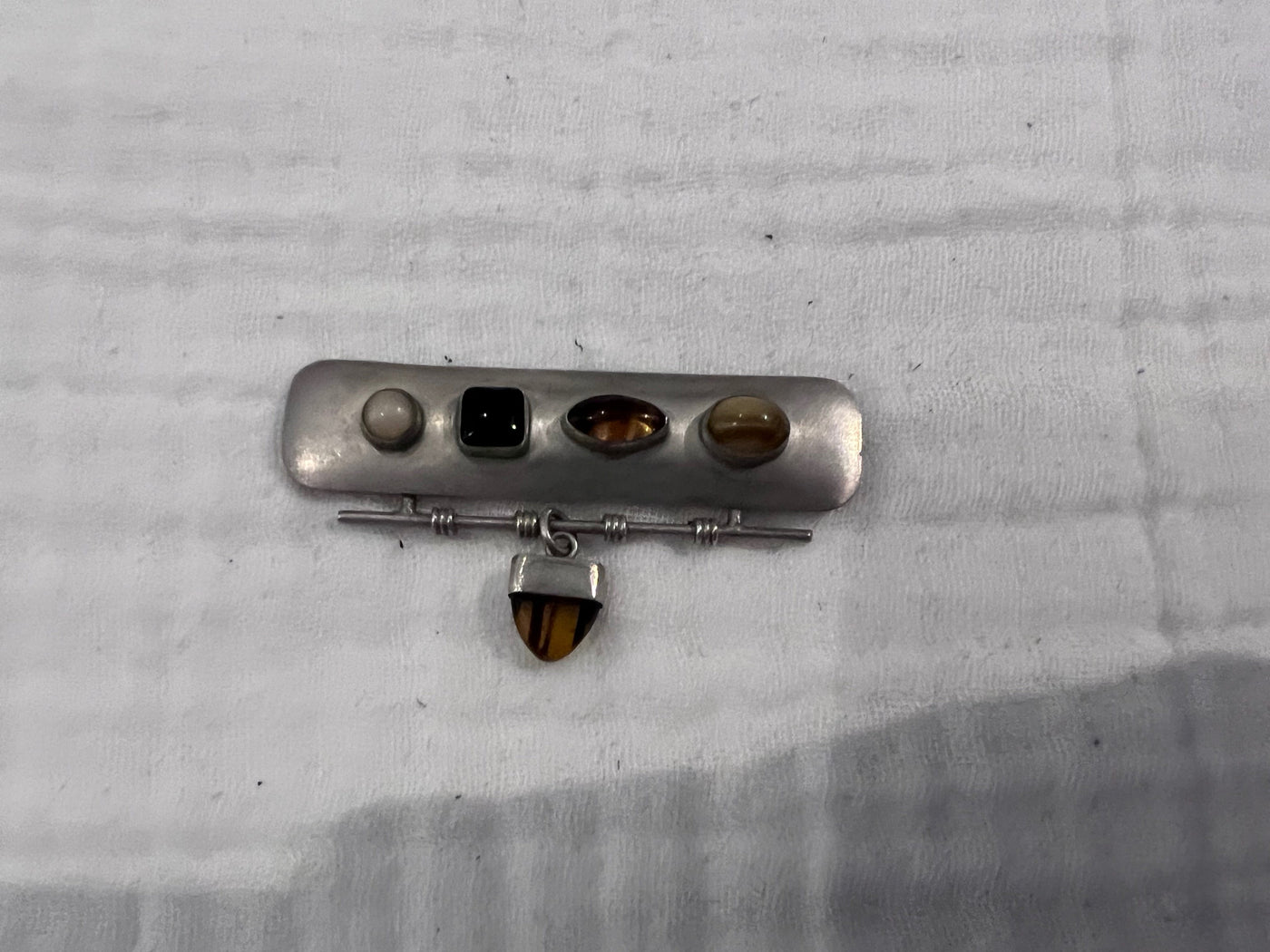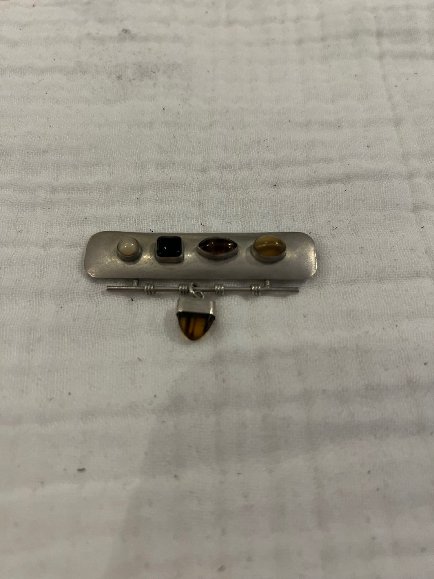 Juventino Lopez Reyes Sterling Silver Brooch Pin (white opal, onyx, tigers eye, butterscotch amber)