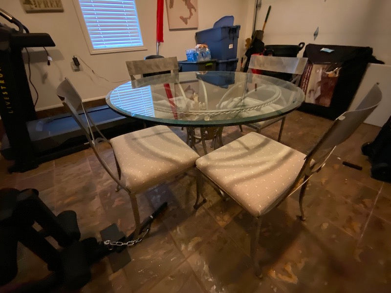 Round Glass Dining Table, Metal Base + 4 Chairs.