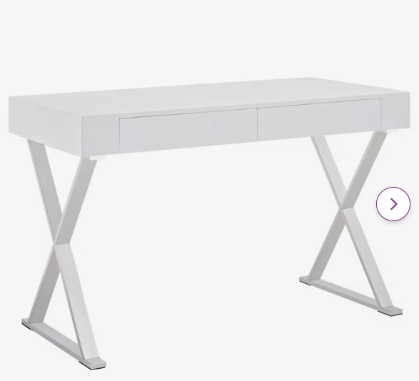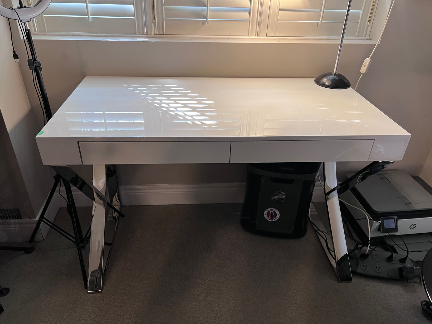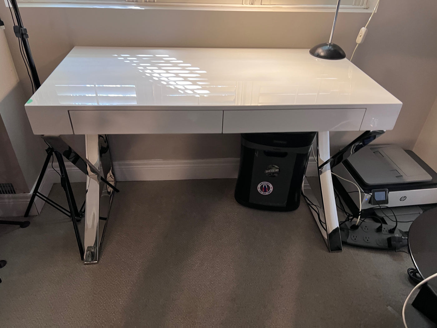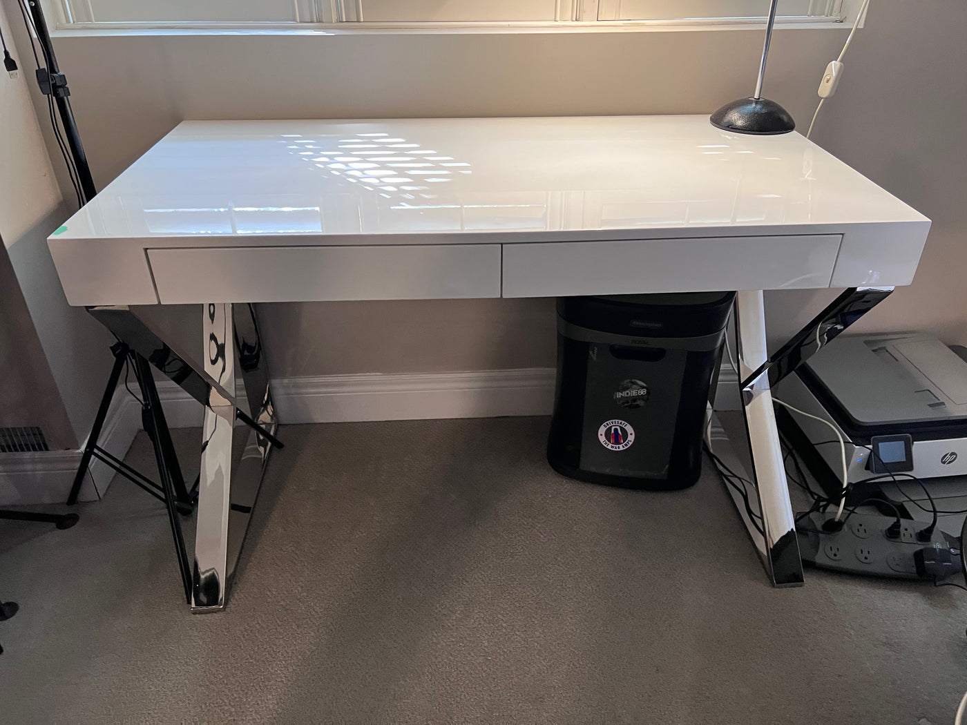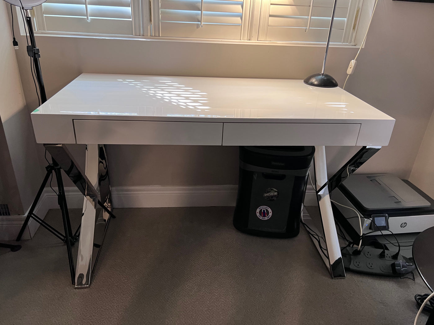 Parker Modern White High Gloss Writing Desk with Chrome Legs.