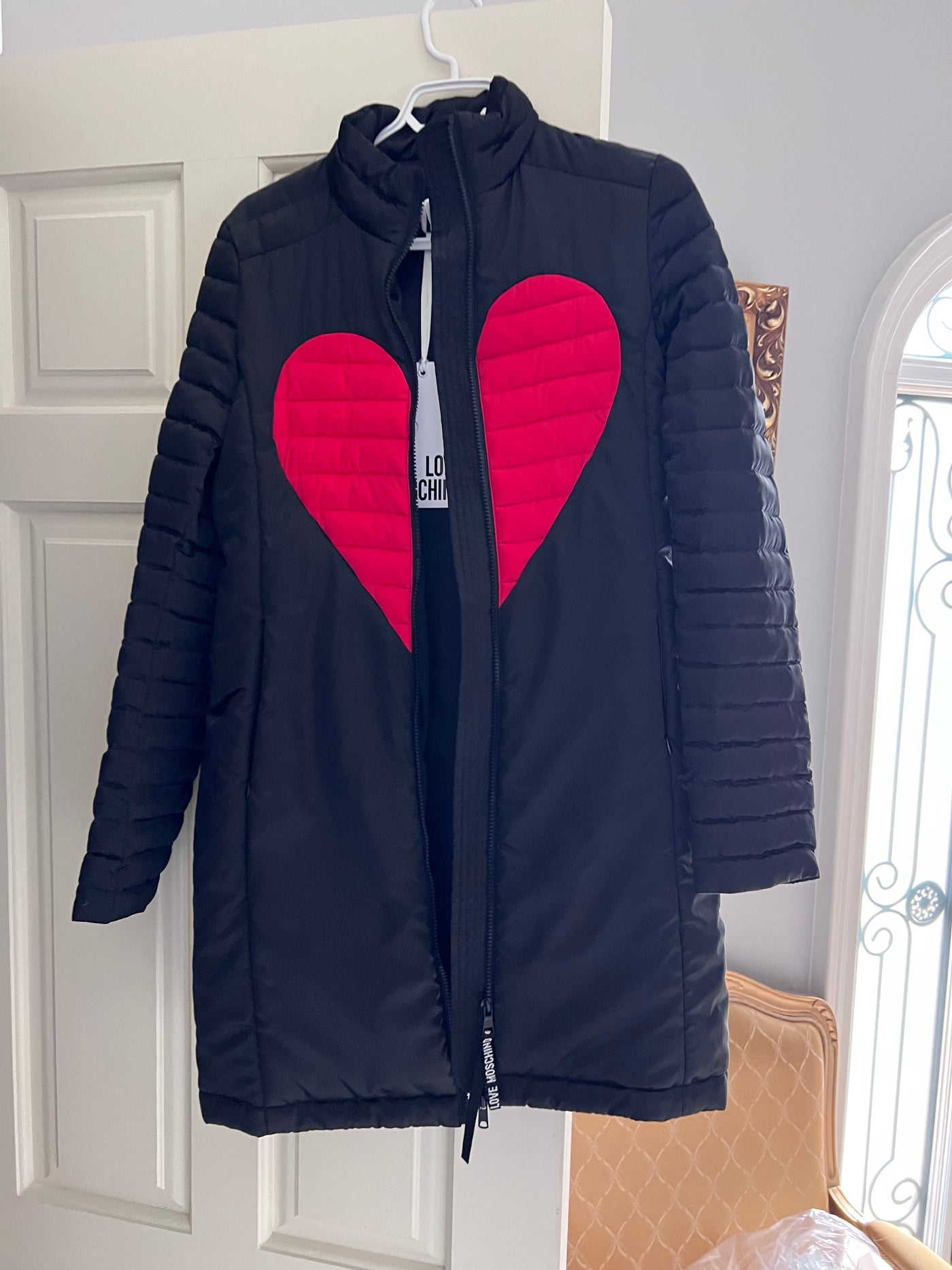 Love Moschino Red Heart Quilted Coat - Black- Size 42.