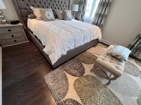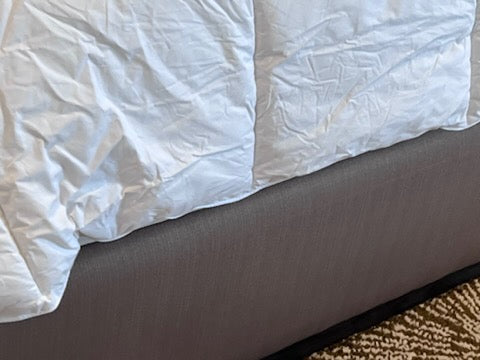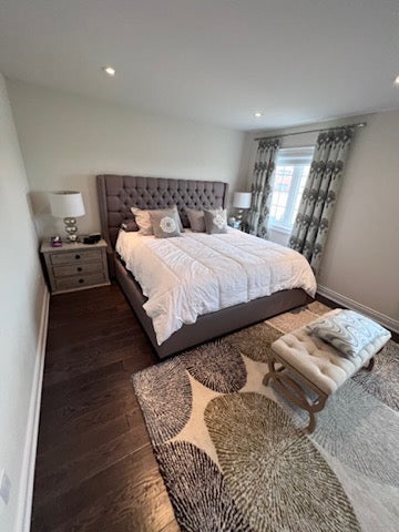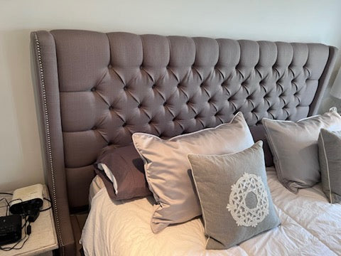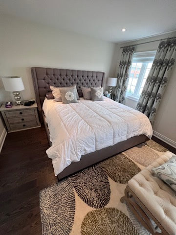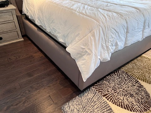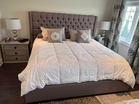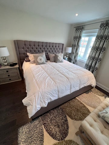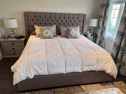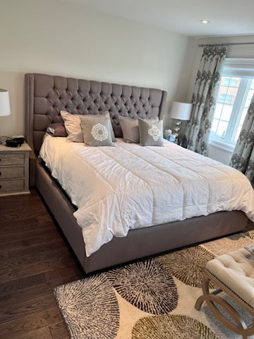 Decorium King Grey Fabric Bed Frame. Mattress is included along with linen and pillows.