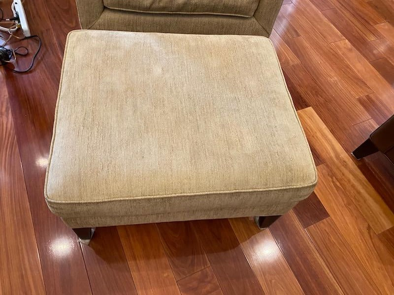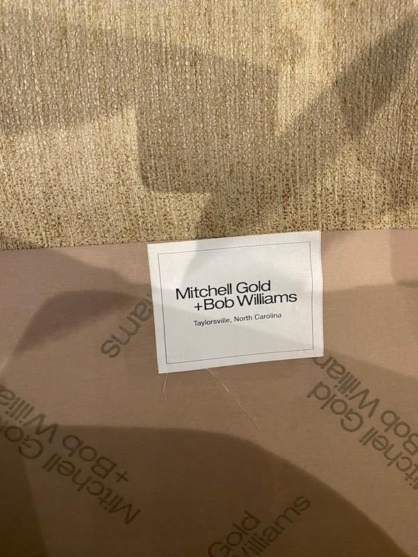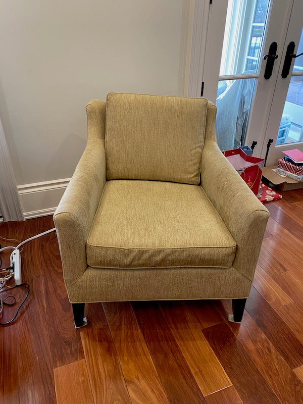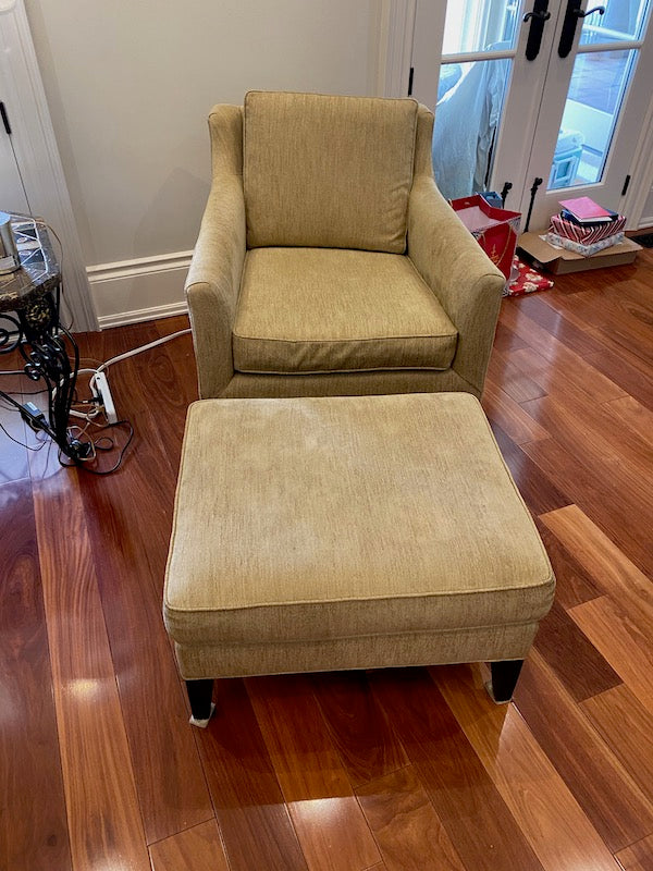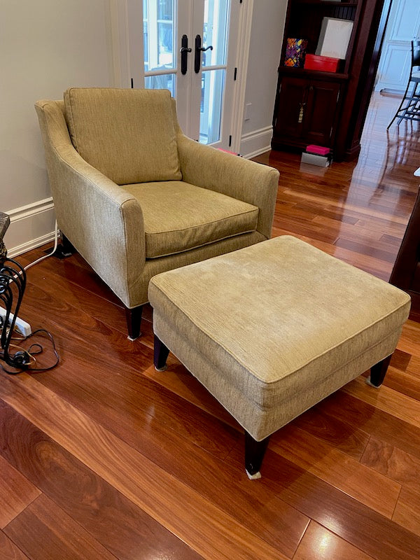 Mitchell Gold + Bob Williams Chair + Ottoman. Sand/Gold upholstery.