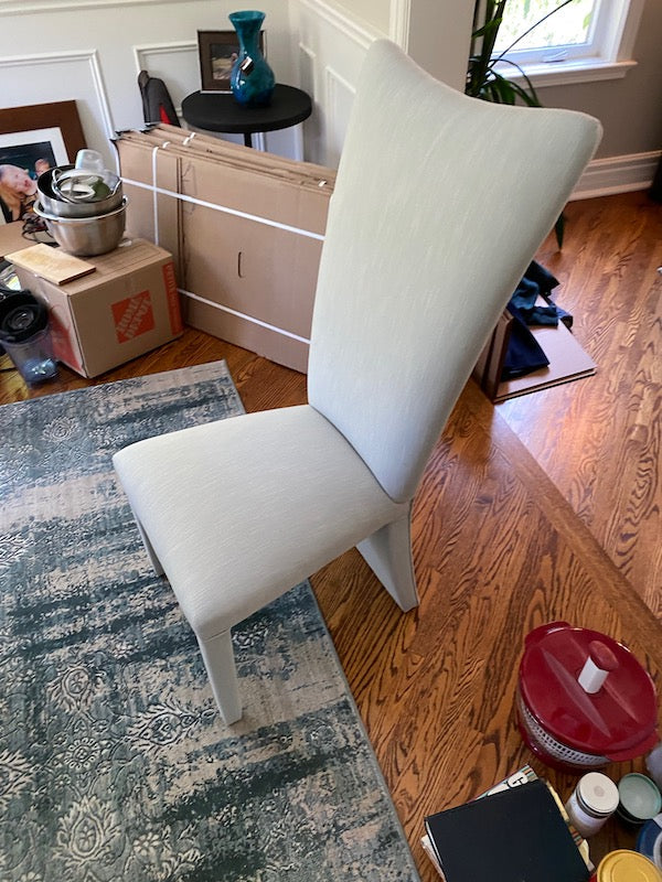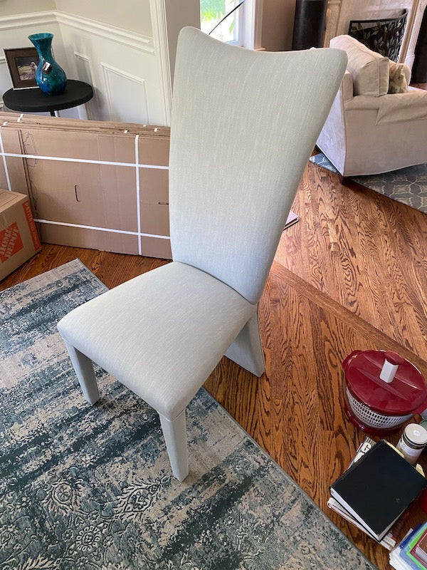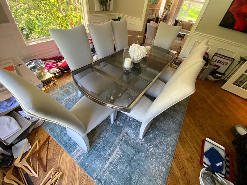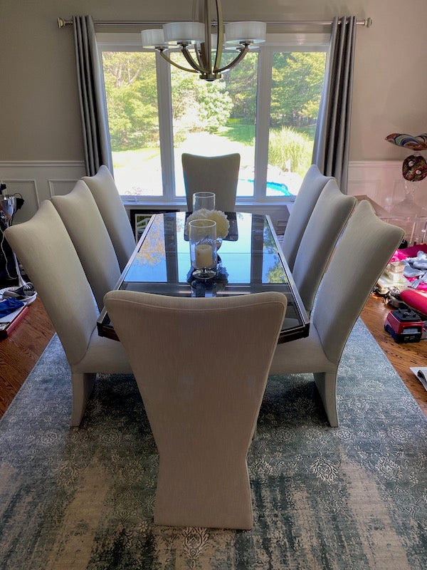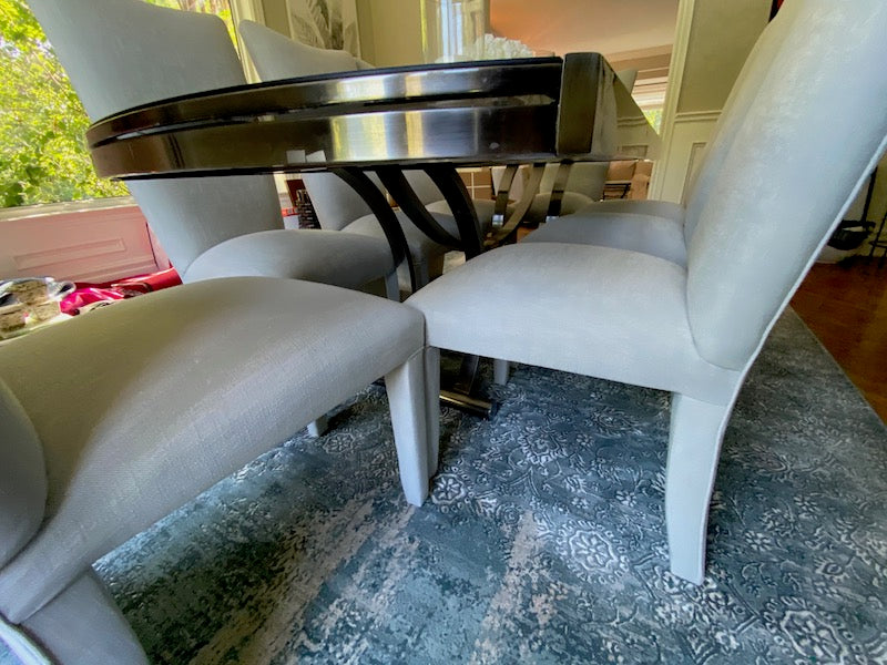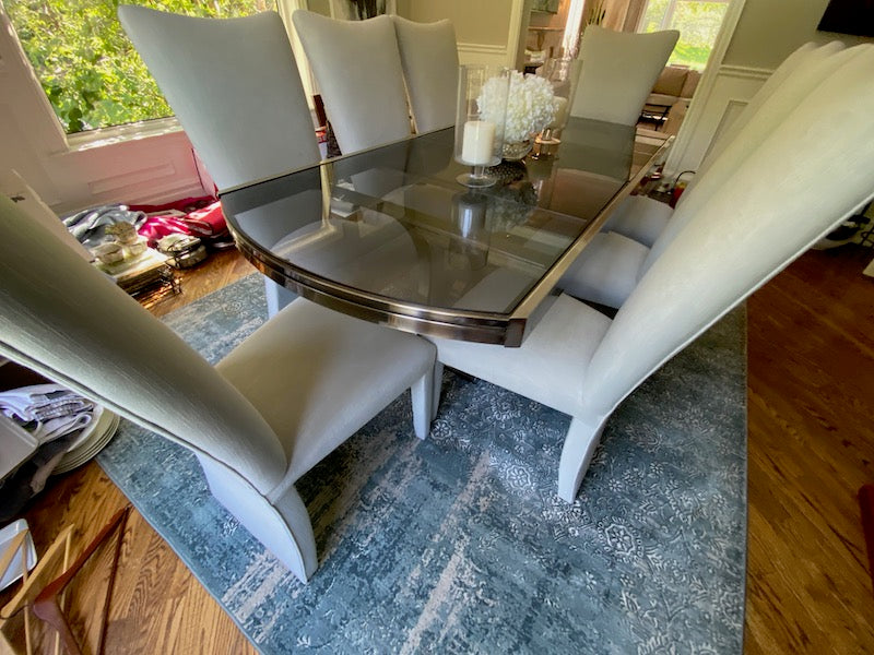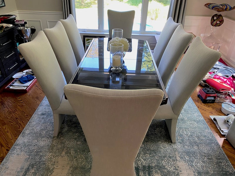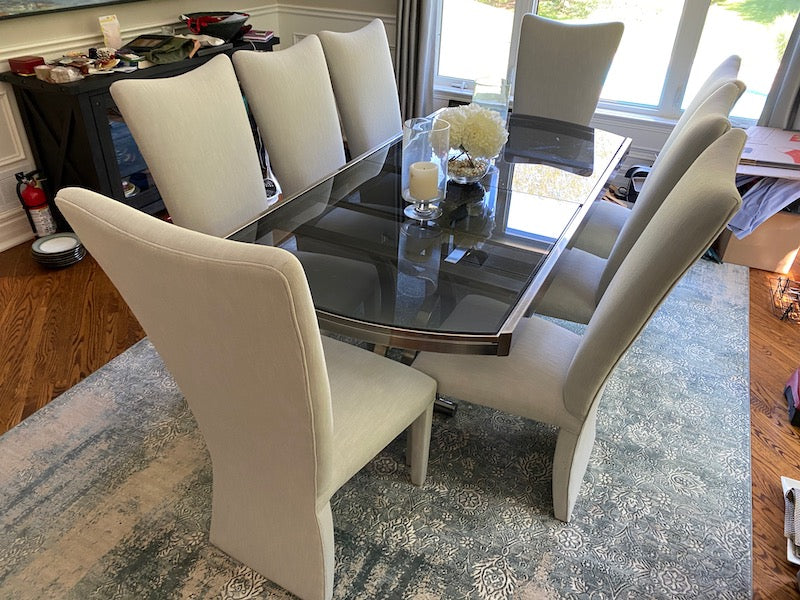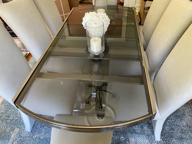 Modern Chrome & Glass Dining Table + 8 High Back Grey Upholstered Chairs