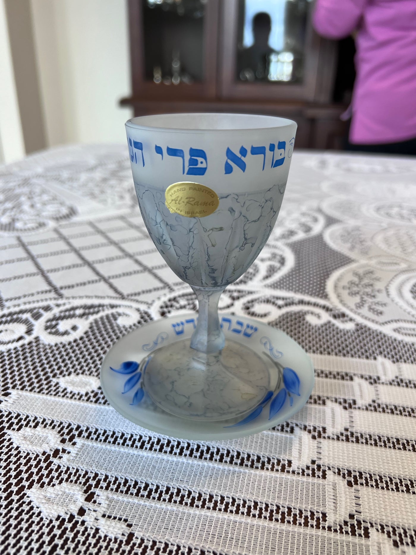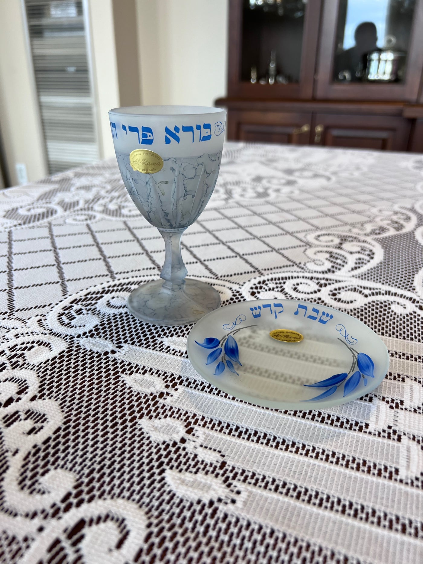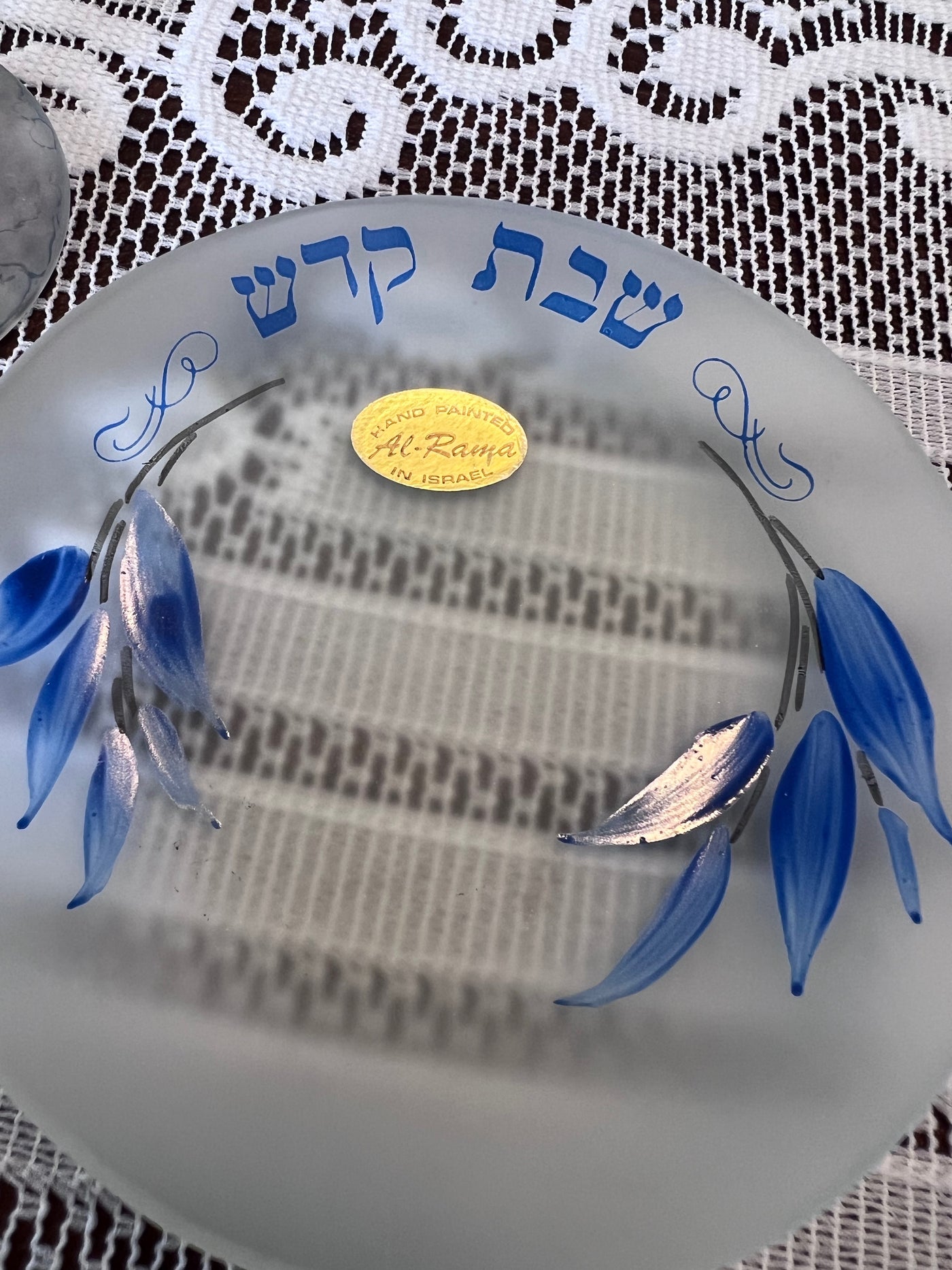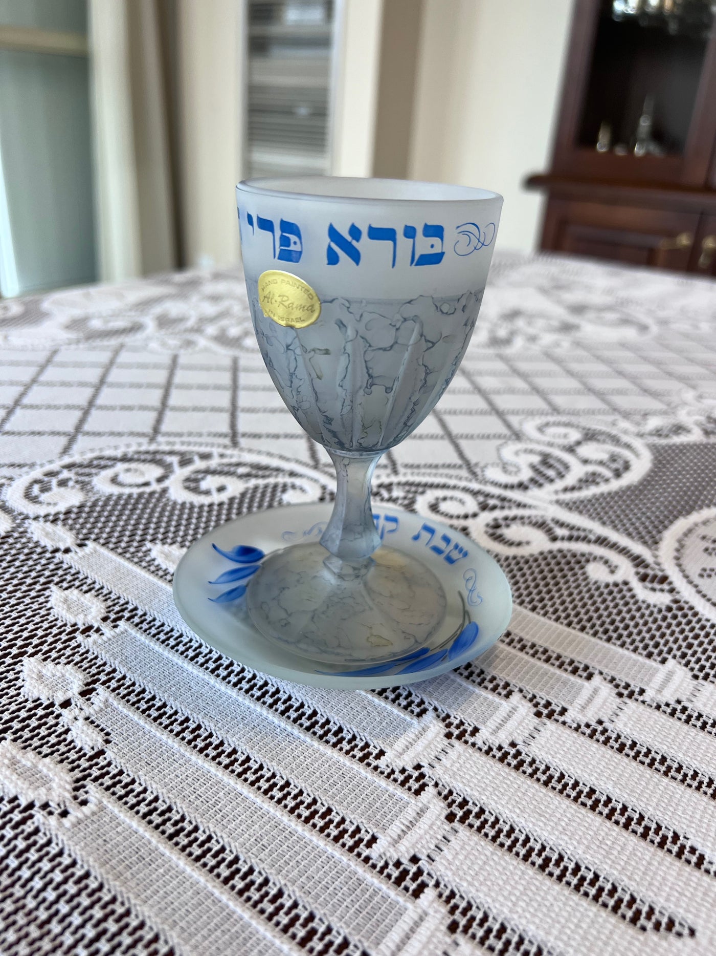 Vintage Al-Rama Frosted Glass Kiddush Cup & Saucer, Hand Painted Israel.