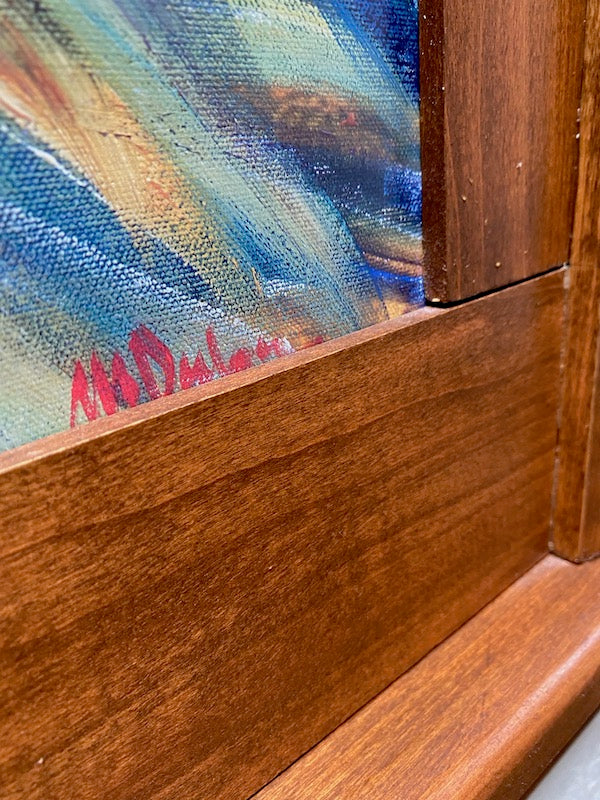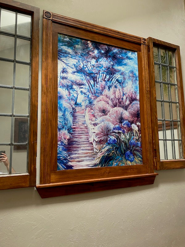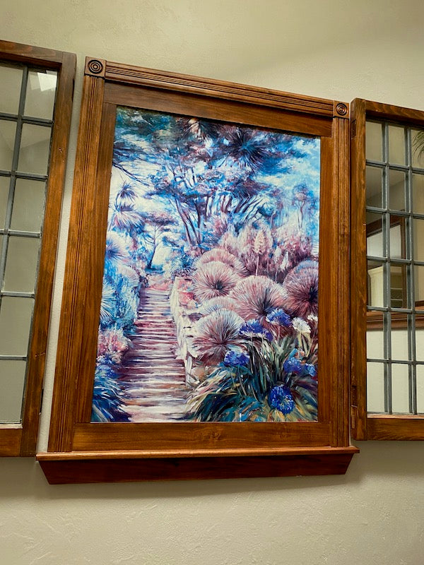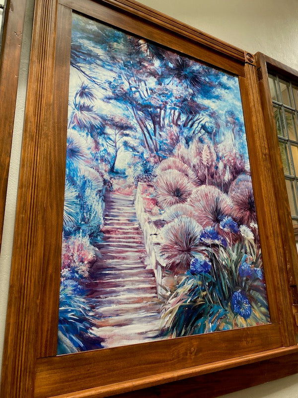 Signed & Framed Print- "Stairway in Floral Garden". Beautiful thick wood frame.