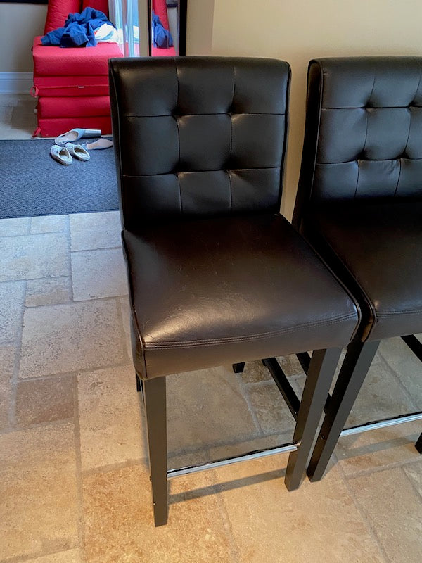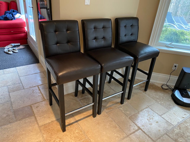 Some cracking in the material on the seat of 1/3 chairs. A few minor chips on the legs of the chairs. *See up close pictures for for disclosure and more details.