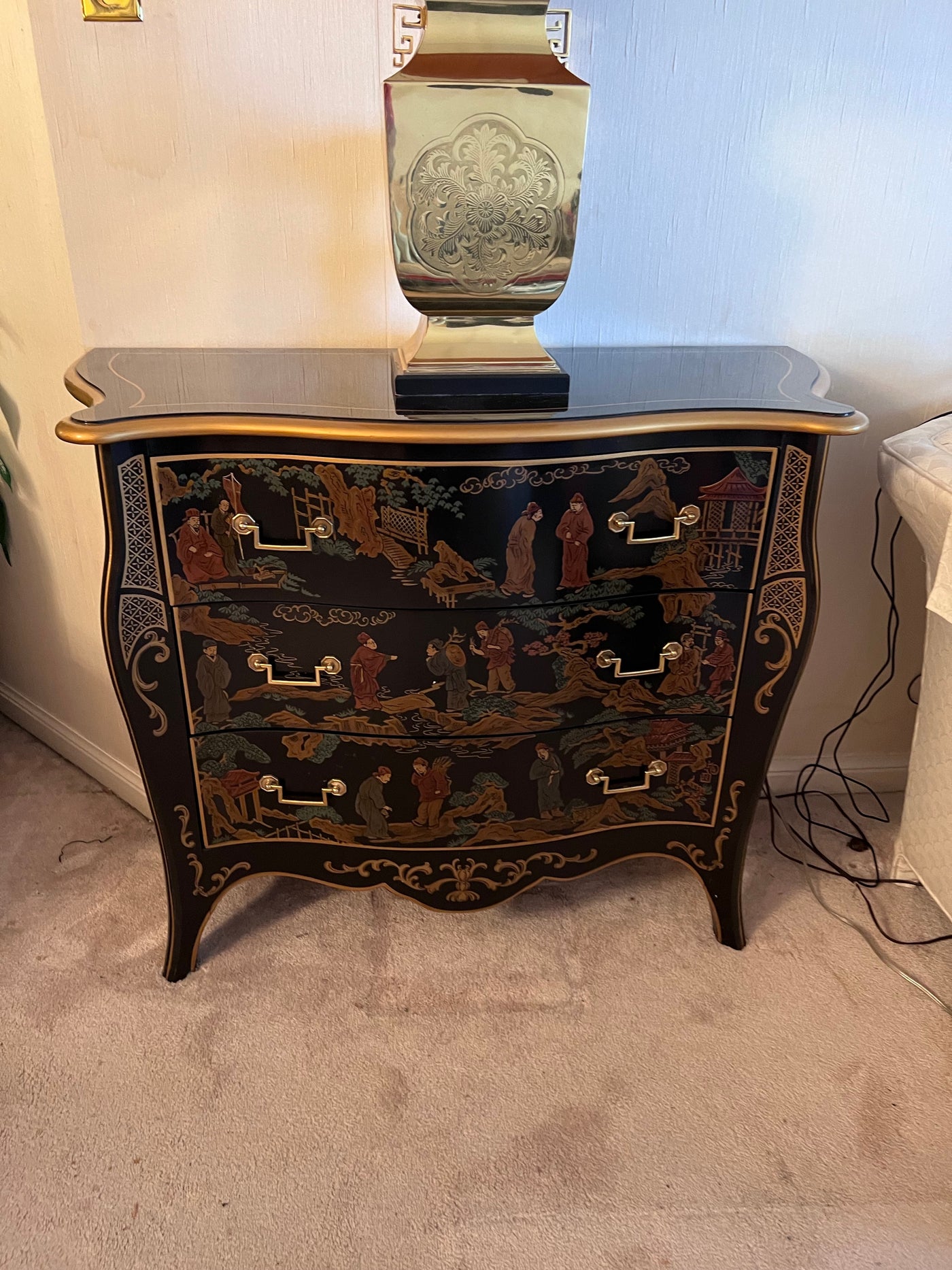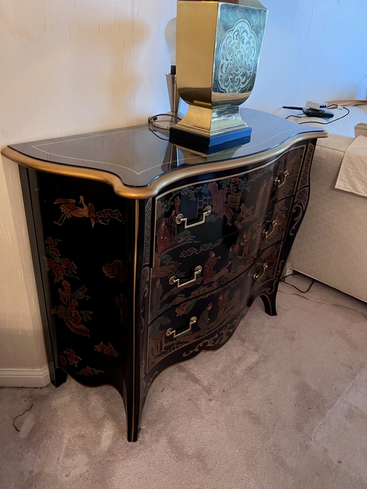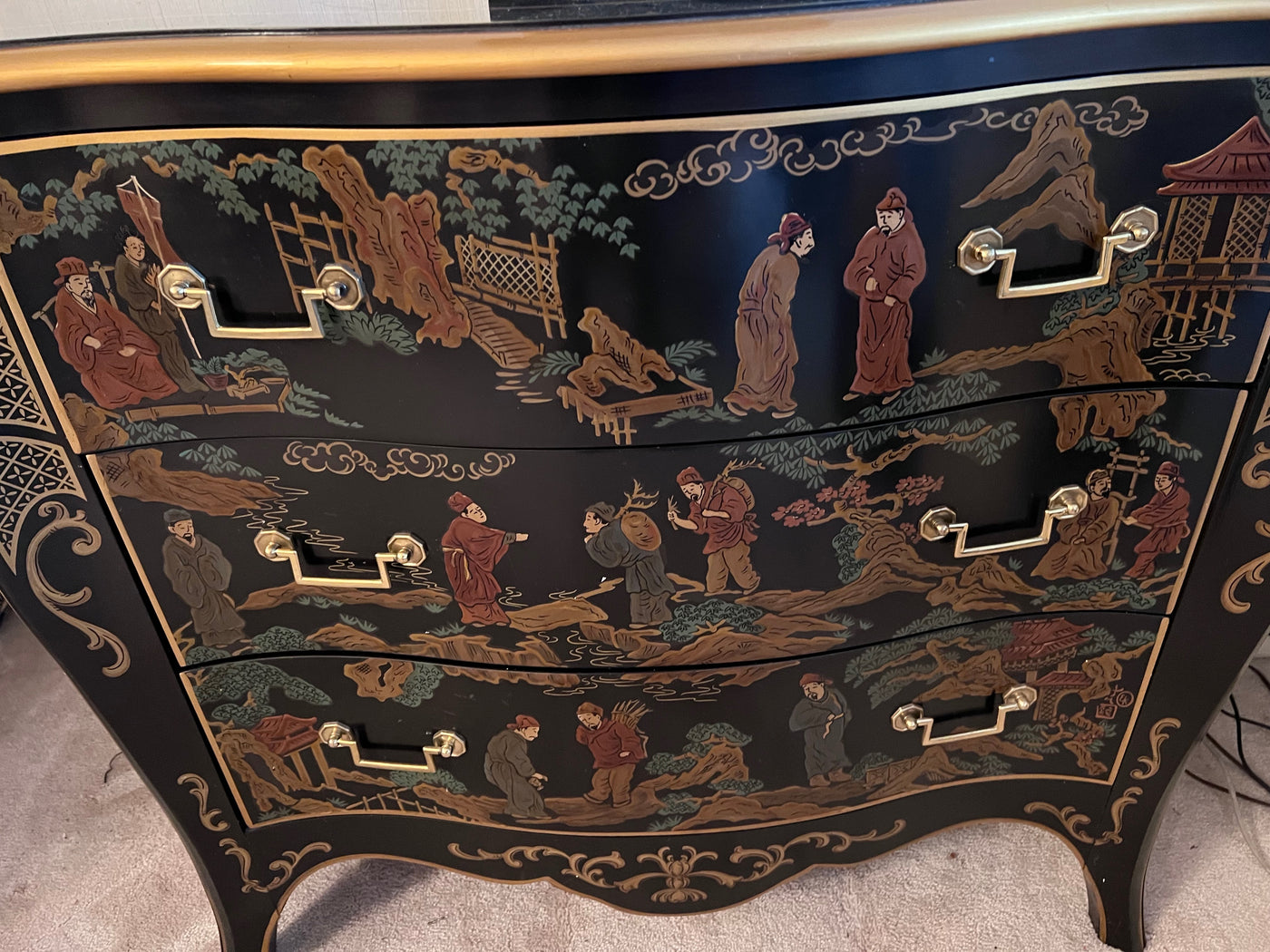 Vintage 'Drexel' Chinoiserie Black Lacquered Chest of Drawers.