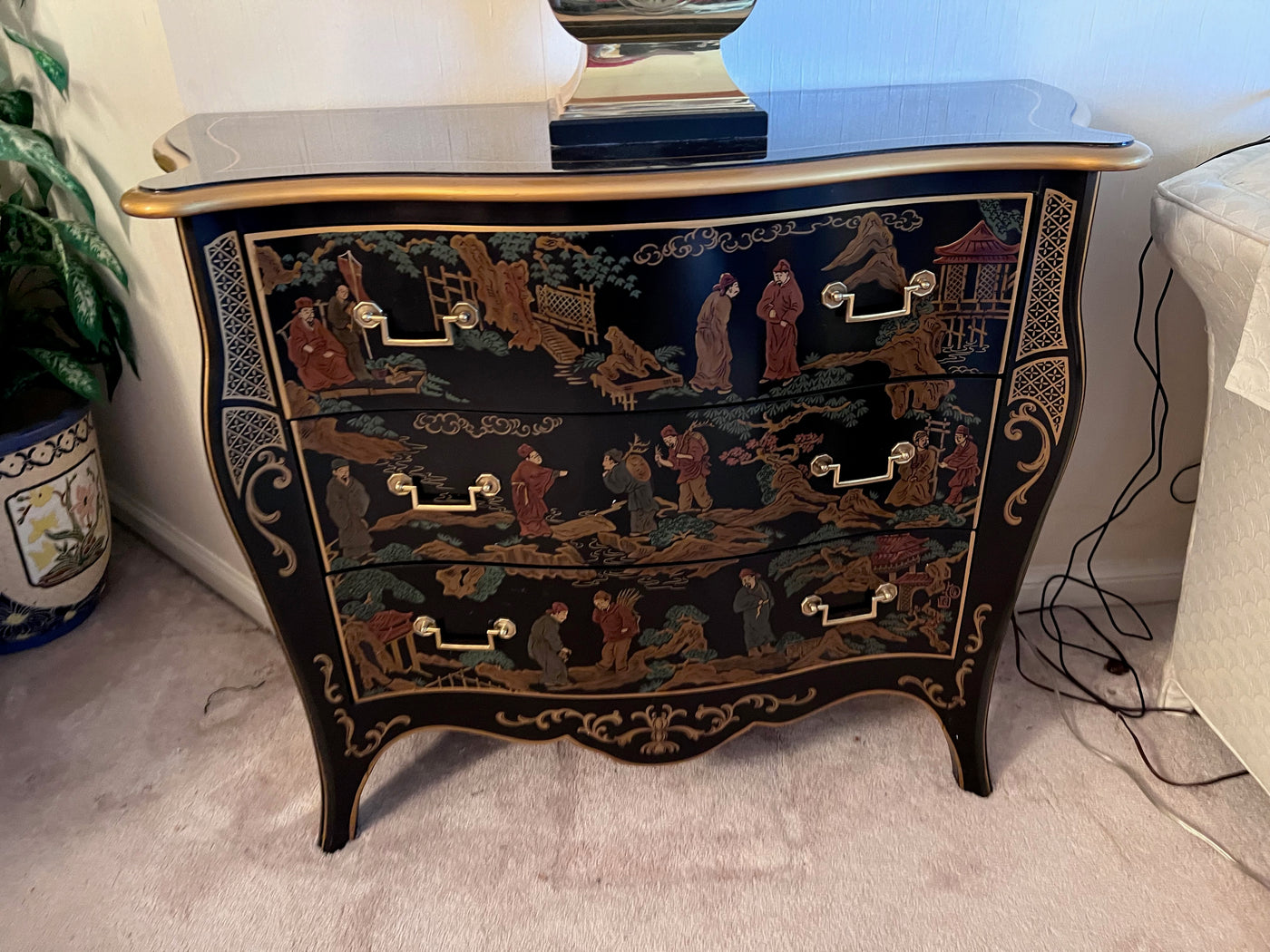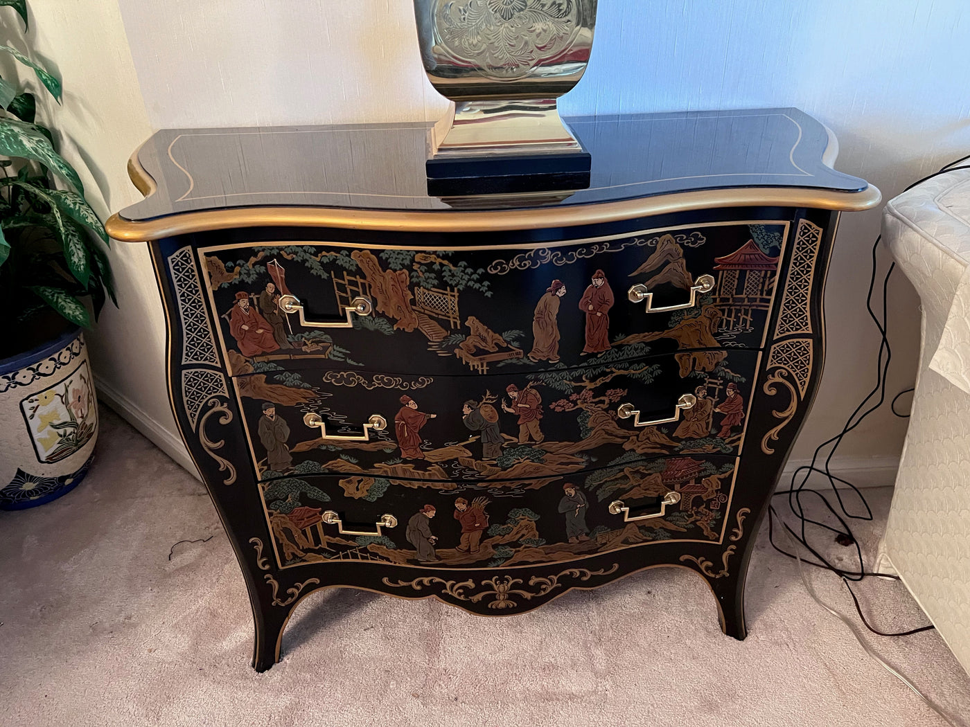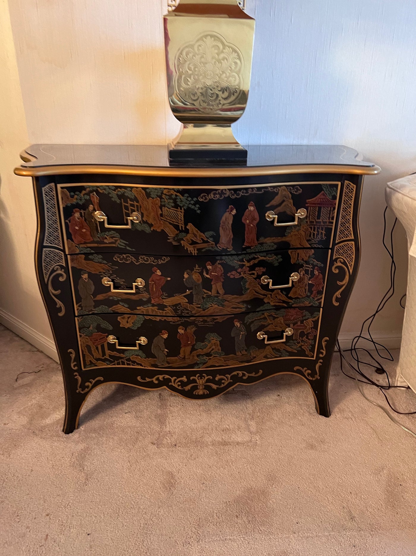 Vintage 'Drexel' Chinoiserie Black Lacquered Chest of Drawers.