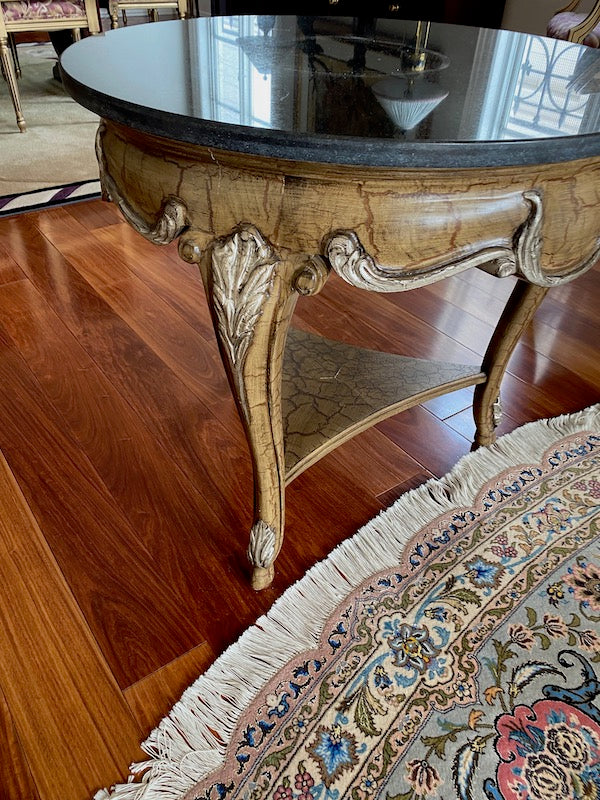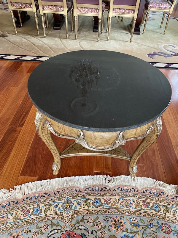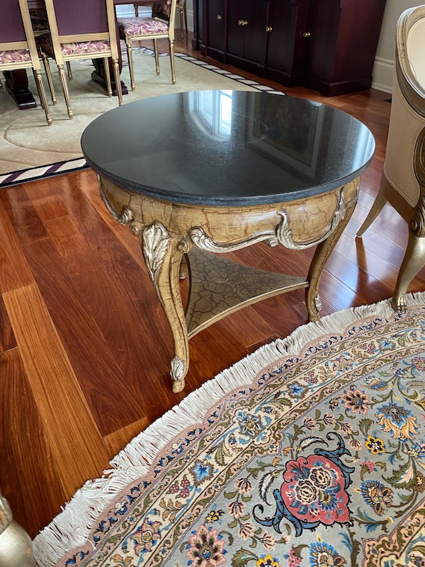 "Shaw-Pezzo" Marble Top Accent Table. Black marble top with a gold wood base. In fabulous condition!!