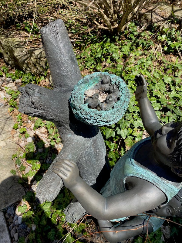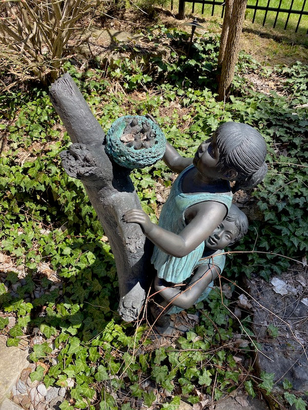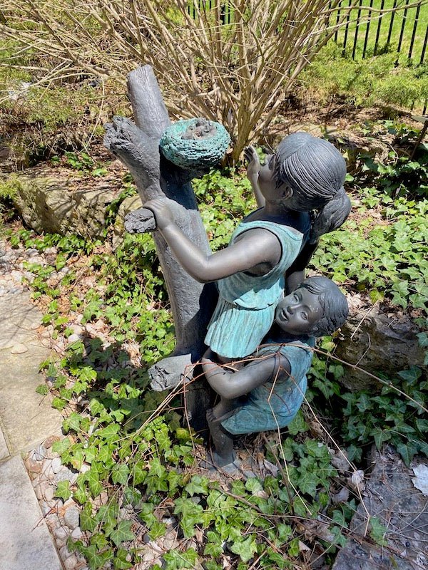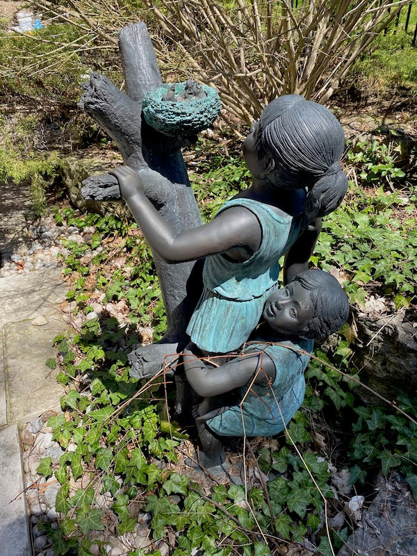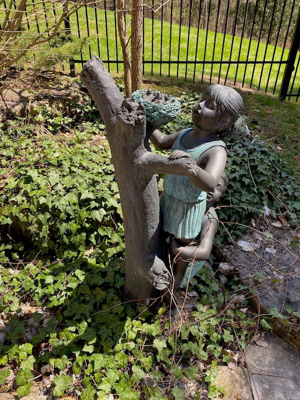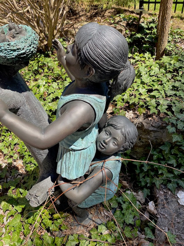 Outdoor Cast Bronze Statue "Baby Rescue"- 2 Girls Rescuing Bird's in a Tree.