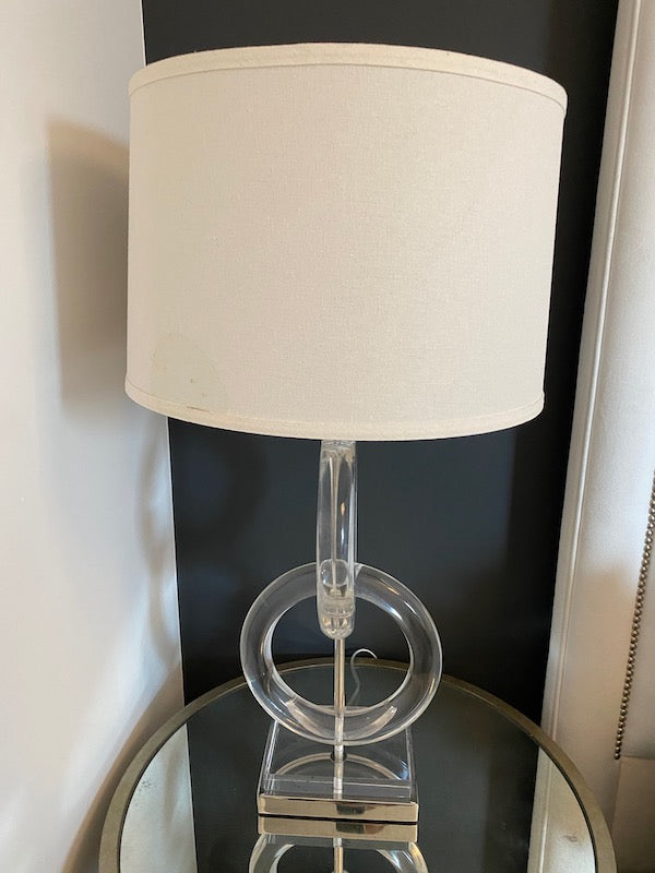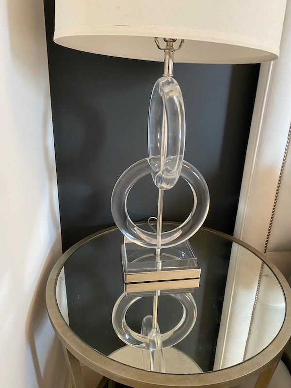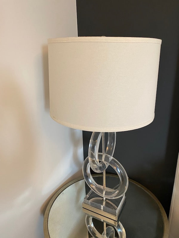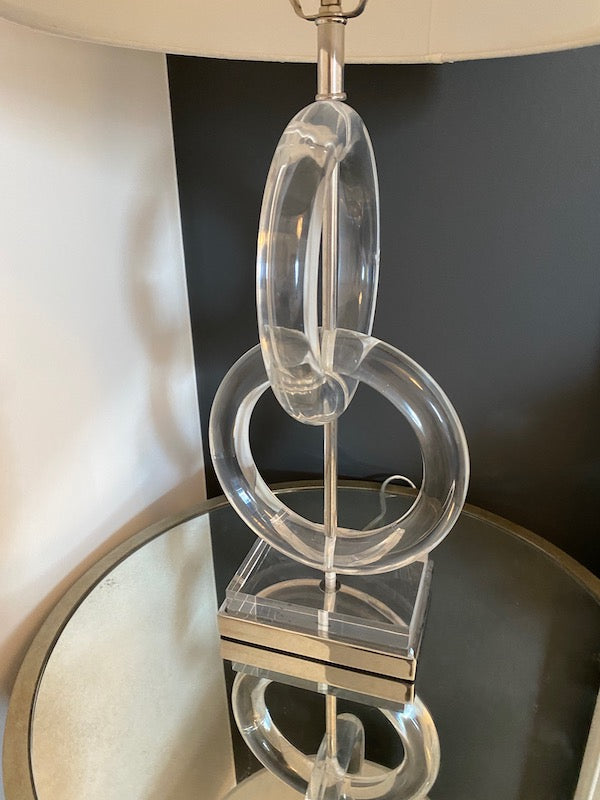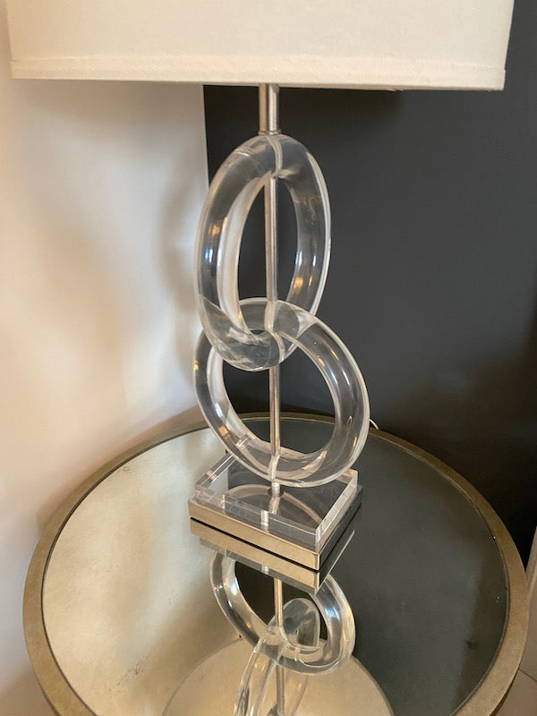 Pair of Whorls Lucite Table Lamps, from Plantation Design. A modern masterpiece. Let the simple design of interconnecting acrylic rings add sleek style to your room. Two rings tower over a coordinated acrylic and nickel pedestal base and are topped by a natural-colored fabric shade. 1-150W maximum, 3-way socket.