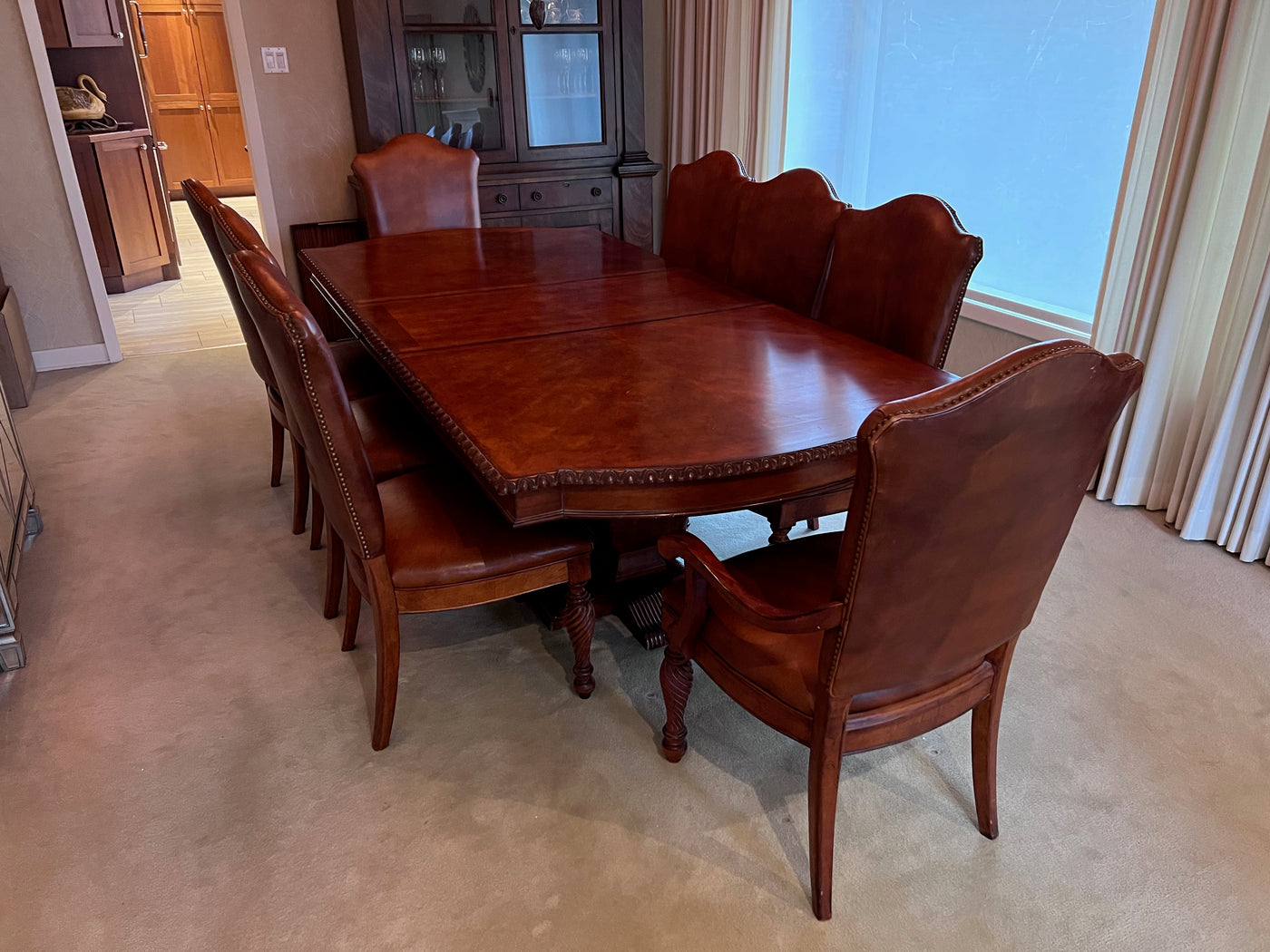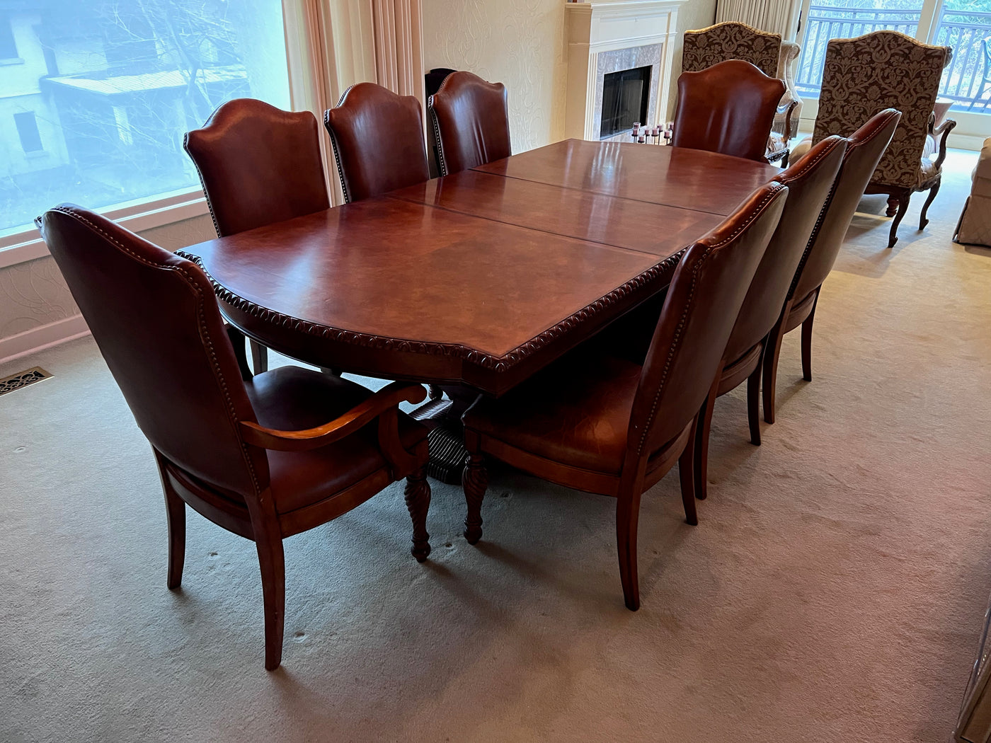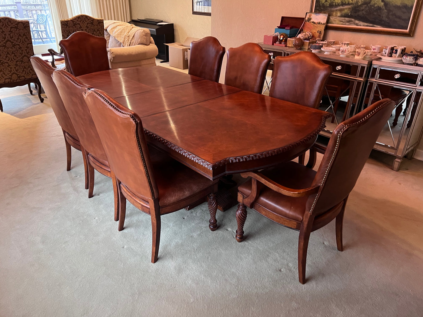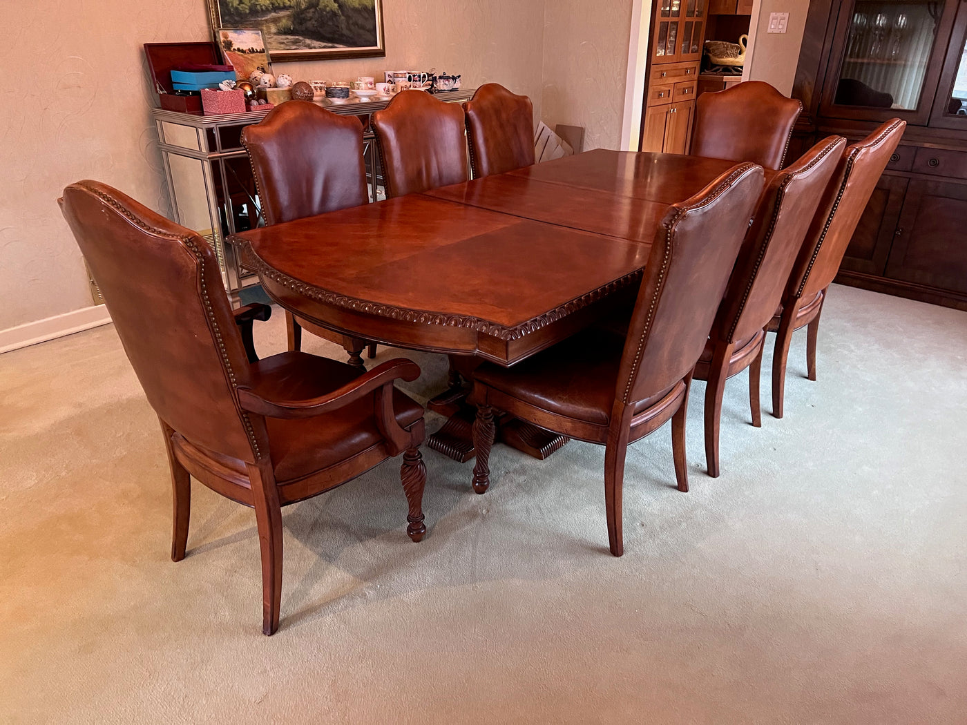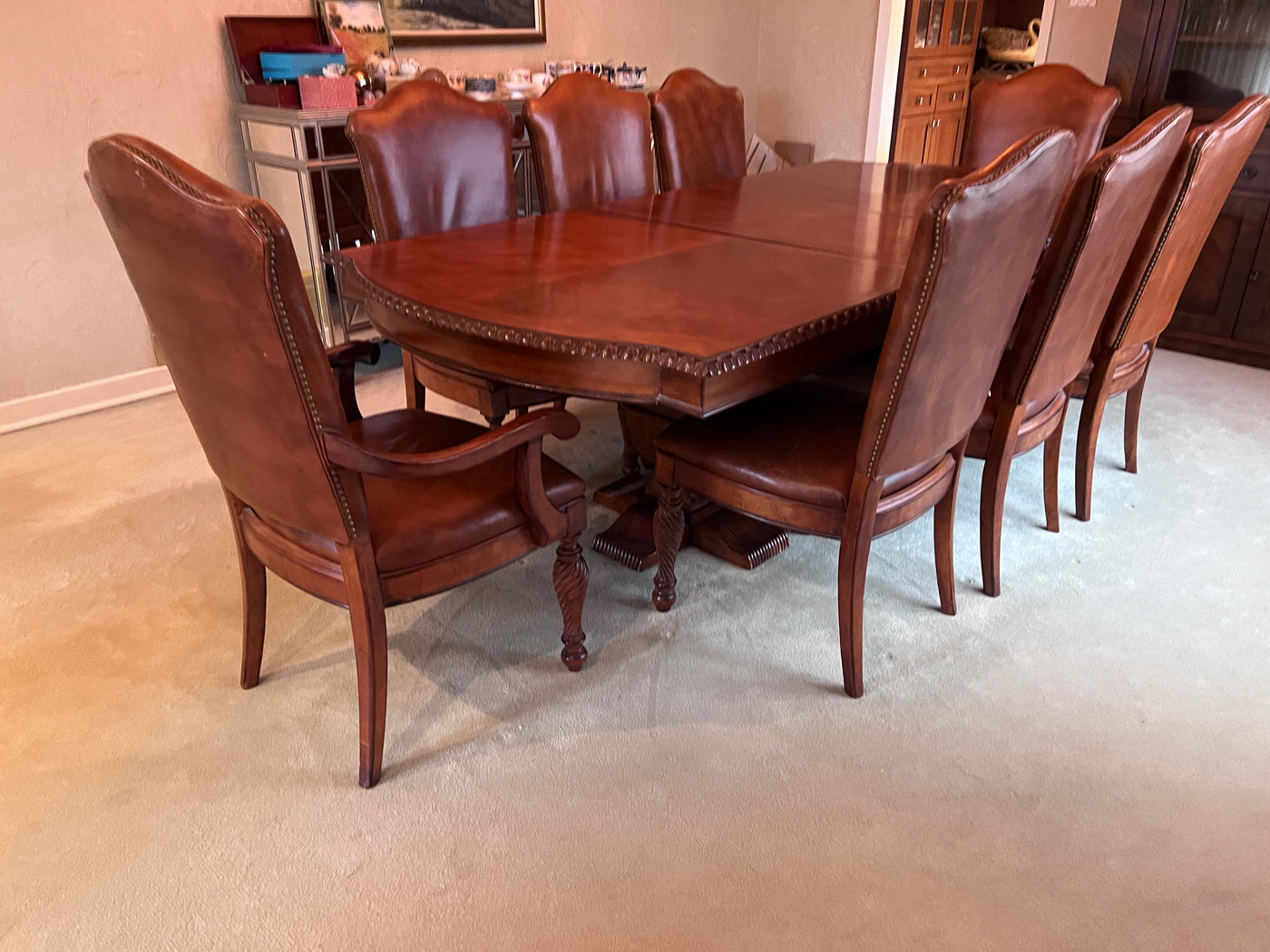The Art Shoppe Double Pedestal Maple Dining Table + 8 Leather Dining Chairs.