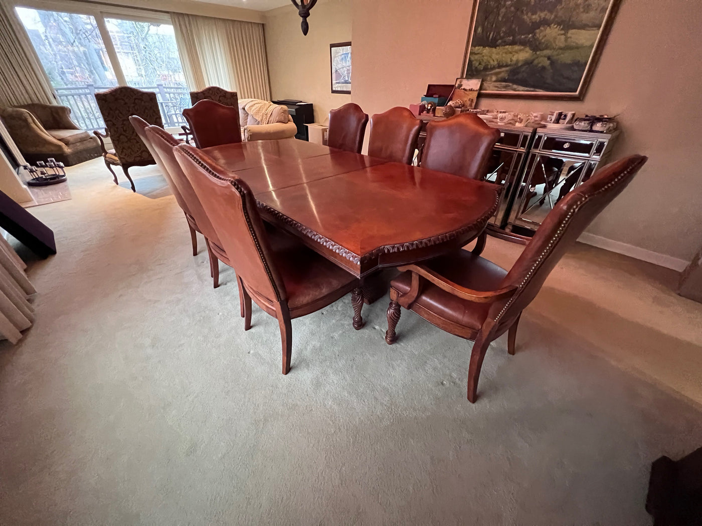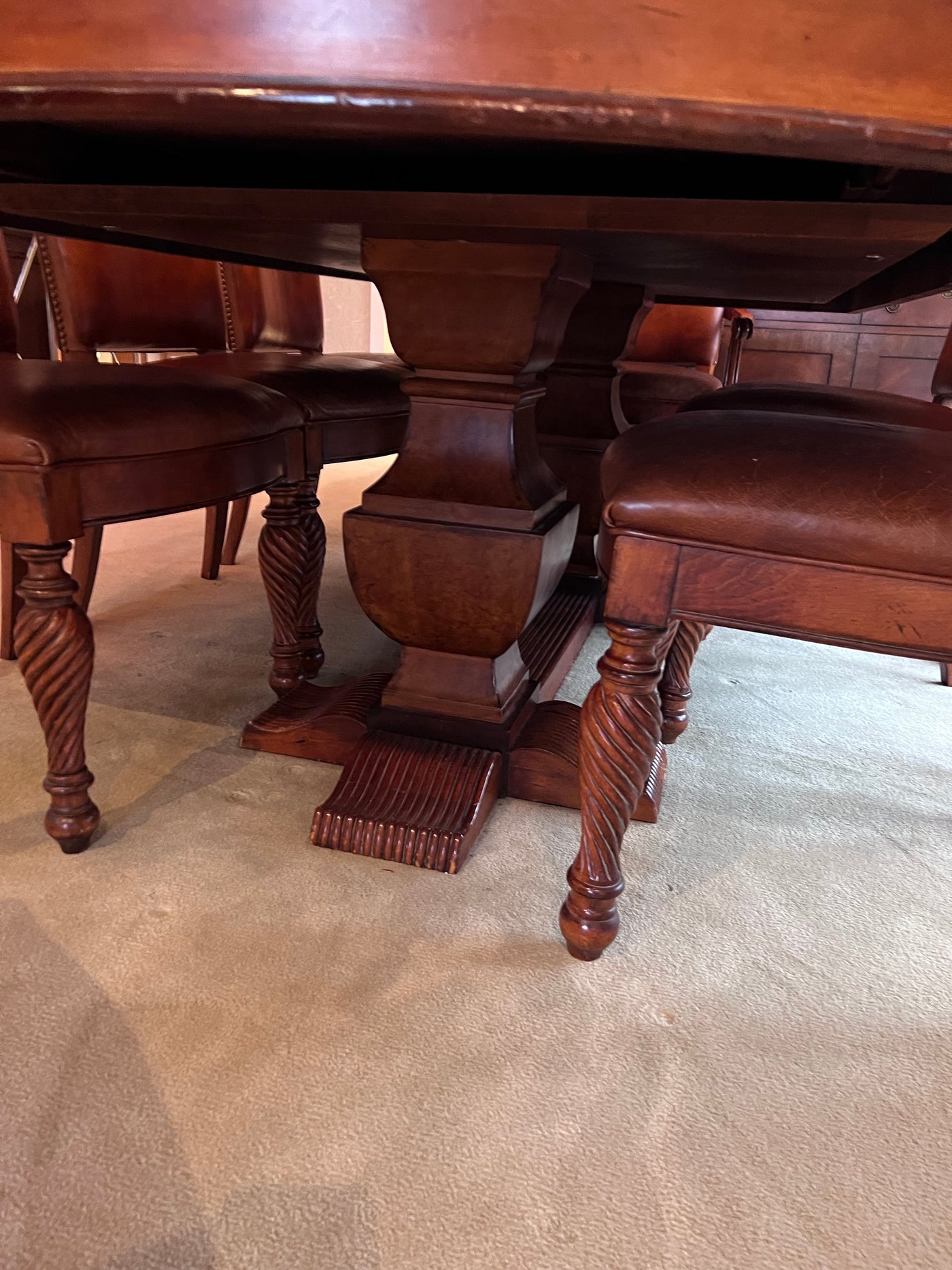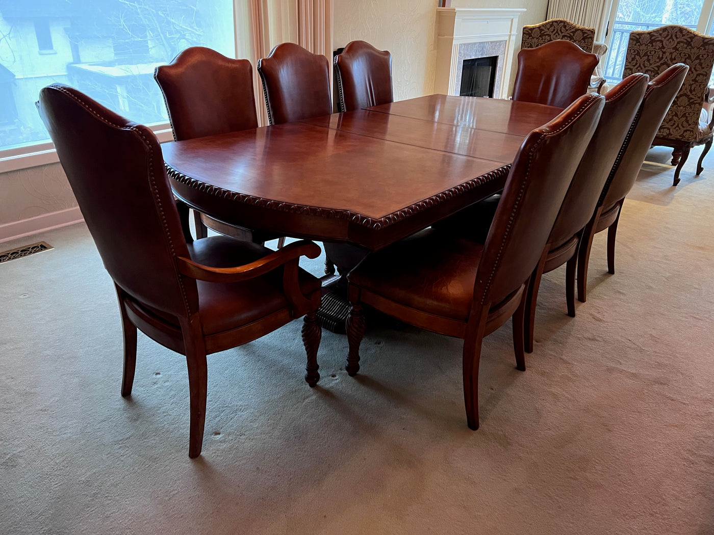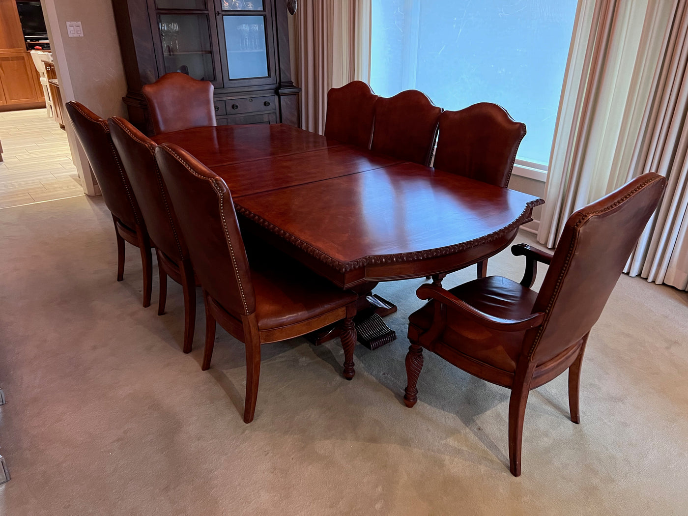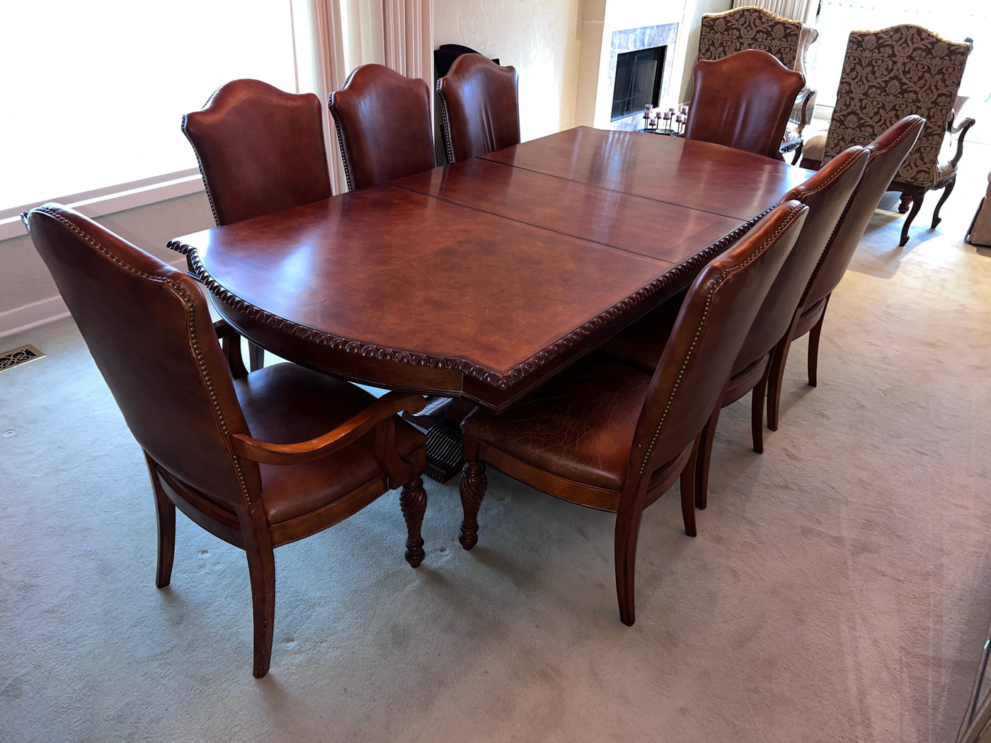 The Art Shoppe Double Pedestal Maple Dining Table + 8 Leather Dining Chairs.