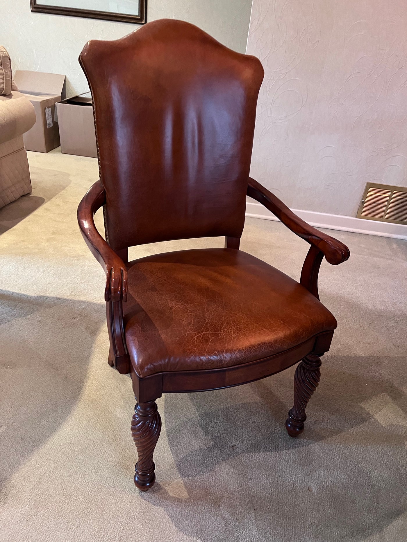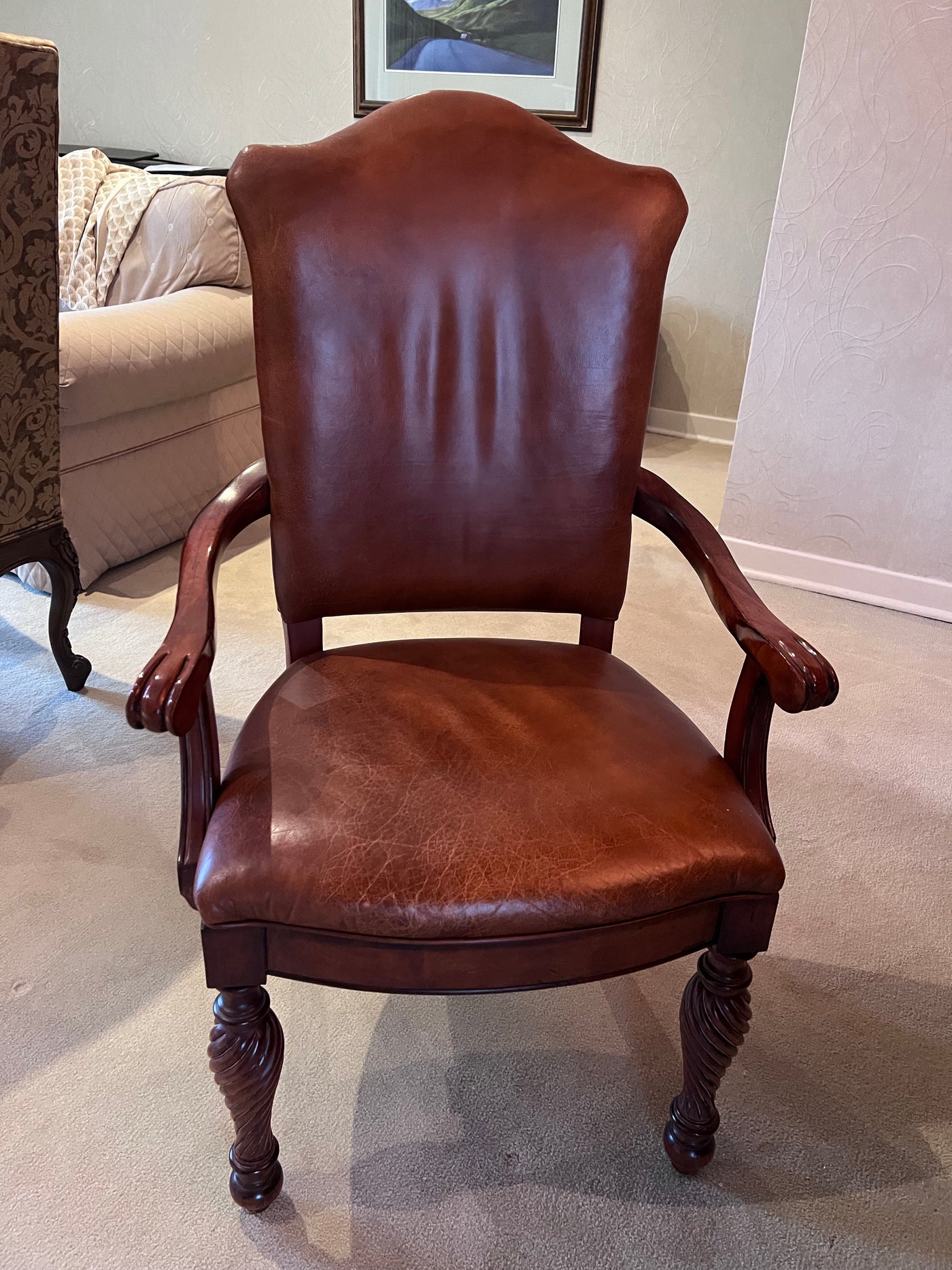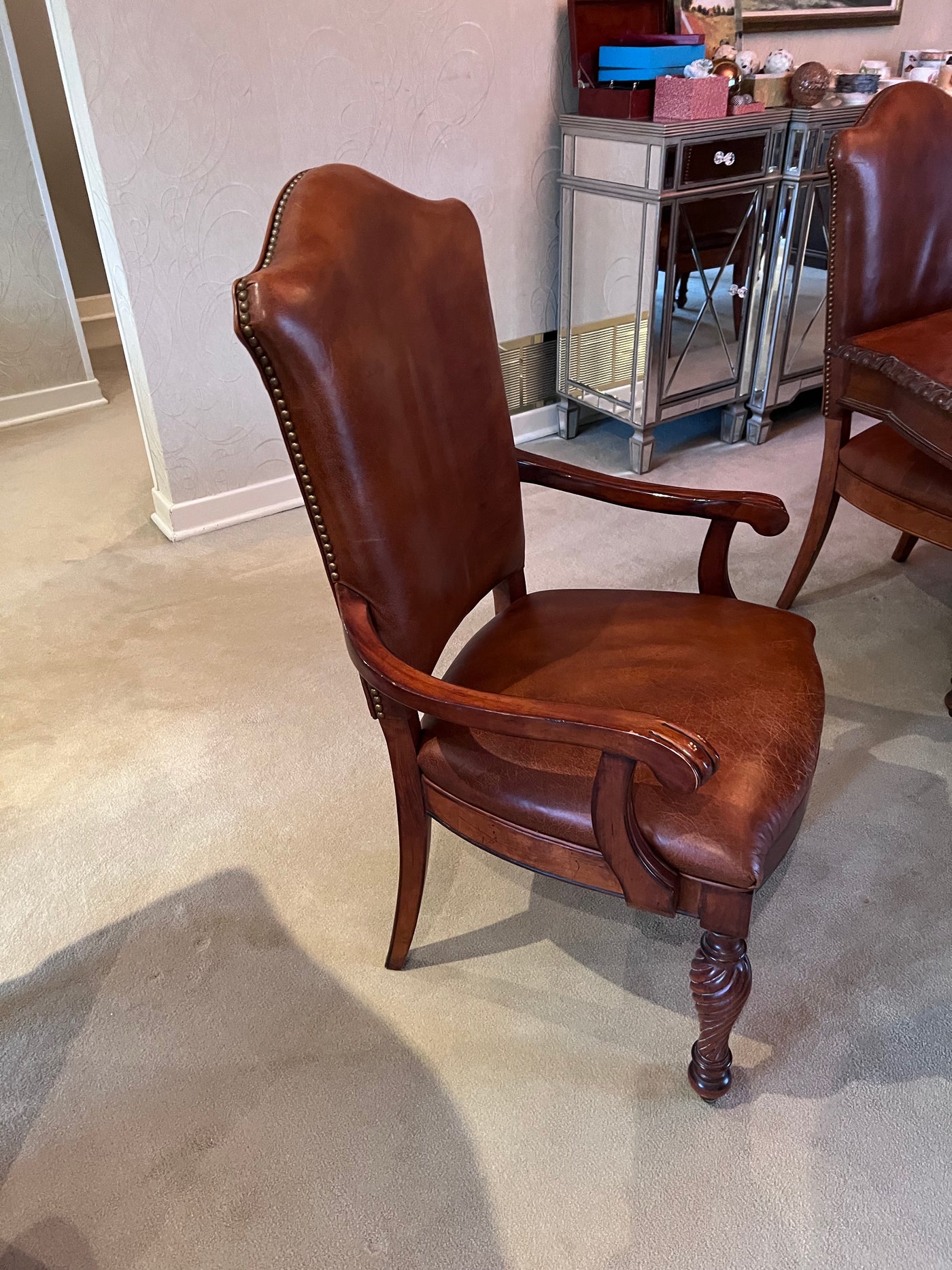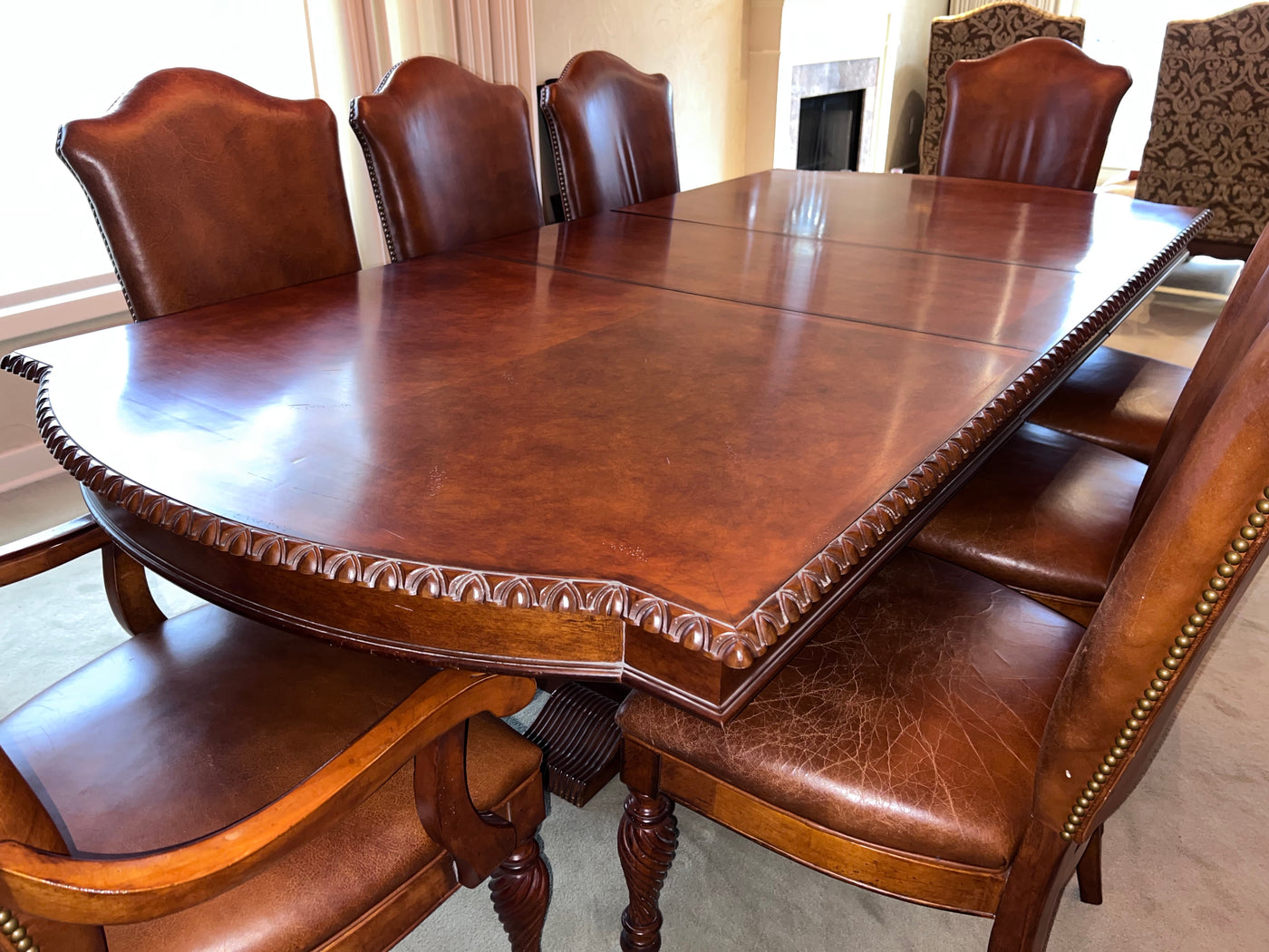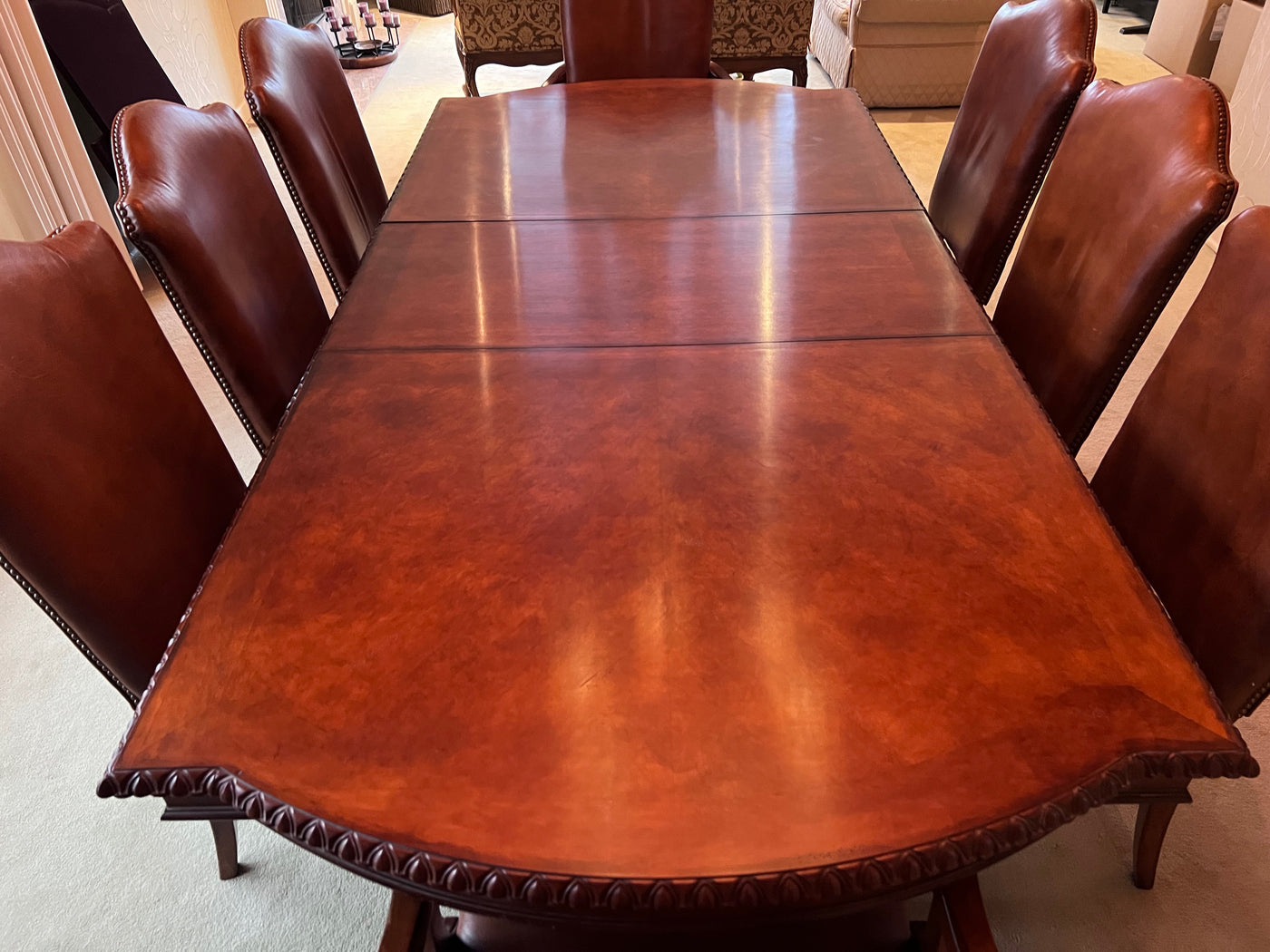 The Art Shoppe Double Pedestal Maple Dining Table + 8 Leather Dining Chairs.