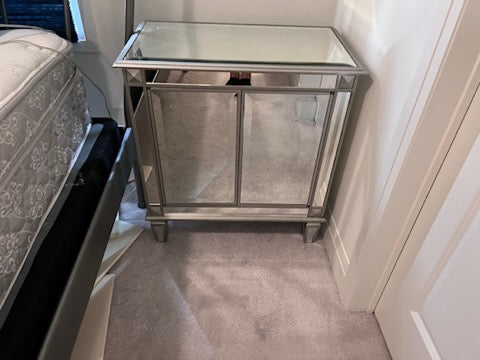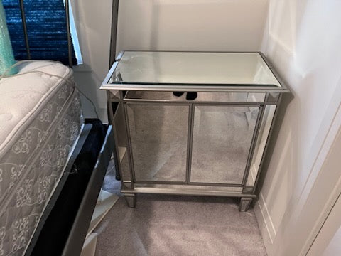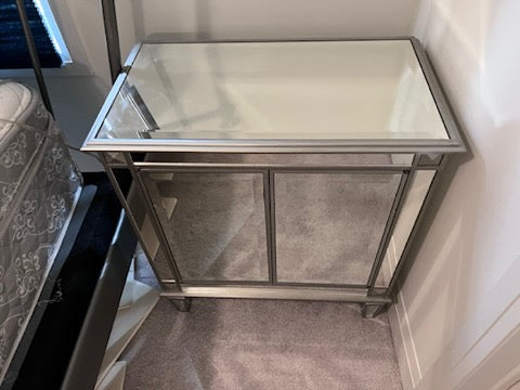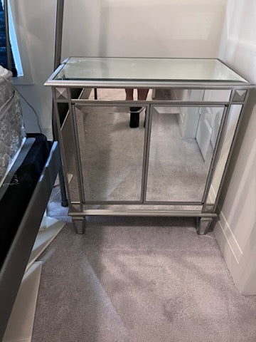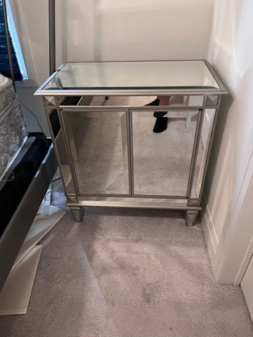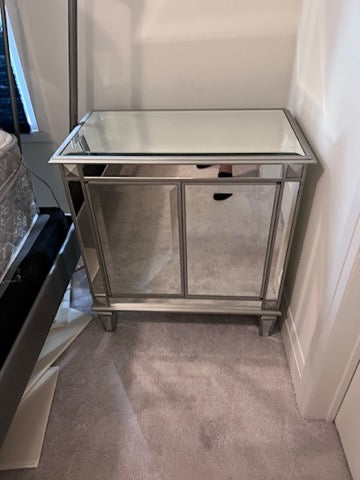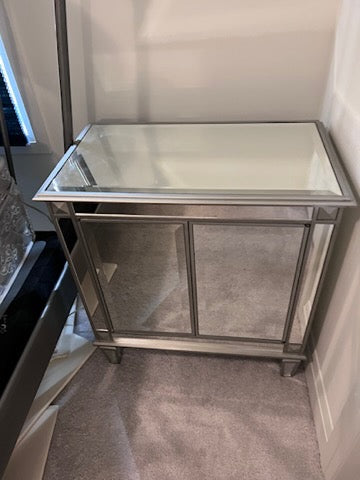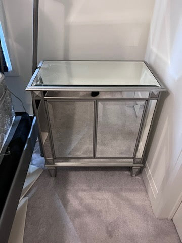 PAIR OF Bombay Company Mirrored Side Tables. Soft push doors that open to offer plenty of storage.