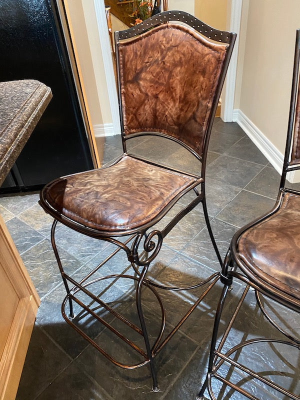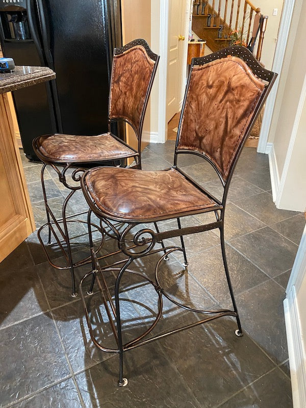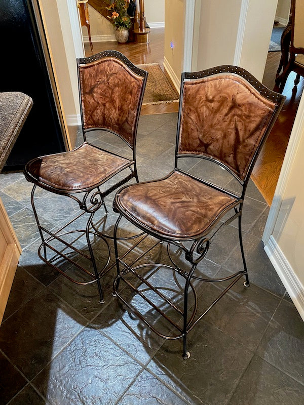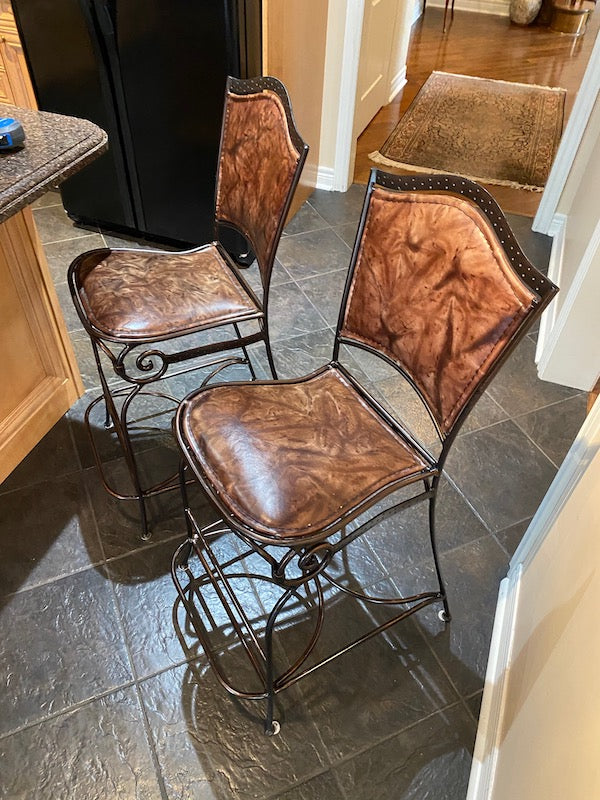 2 Palma Brava Wrought Iron & Leather Bar Stools.