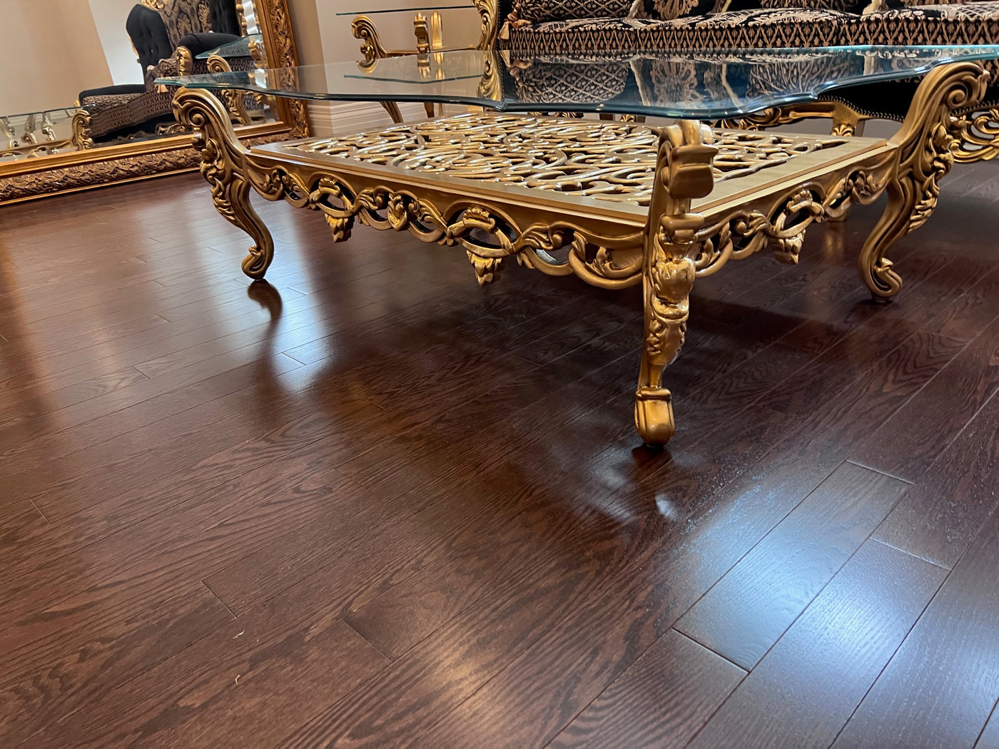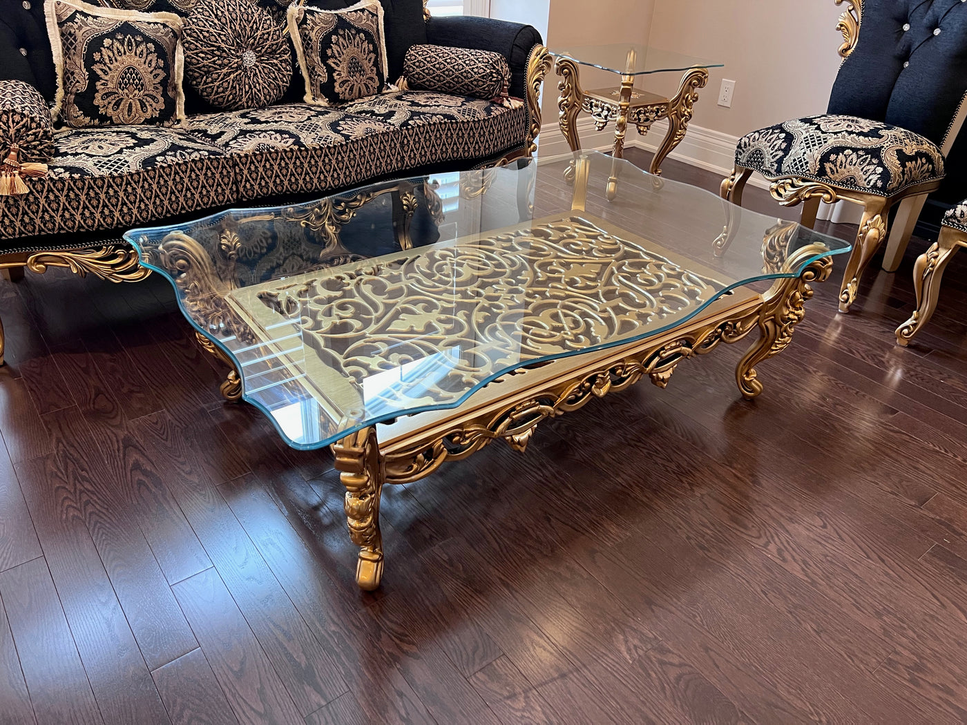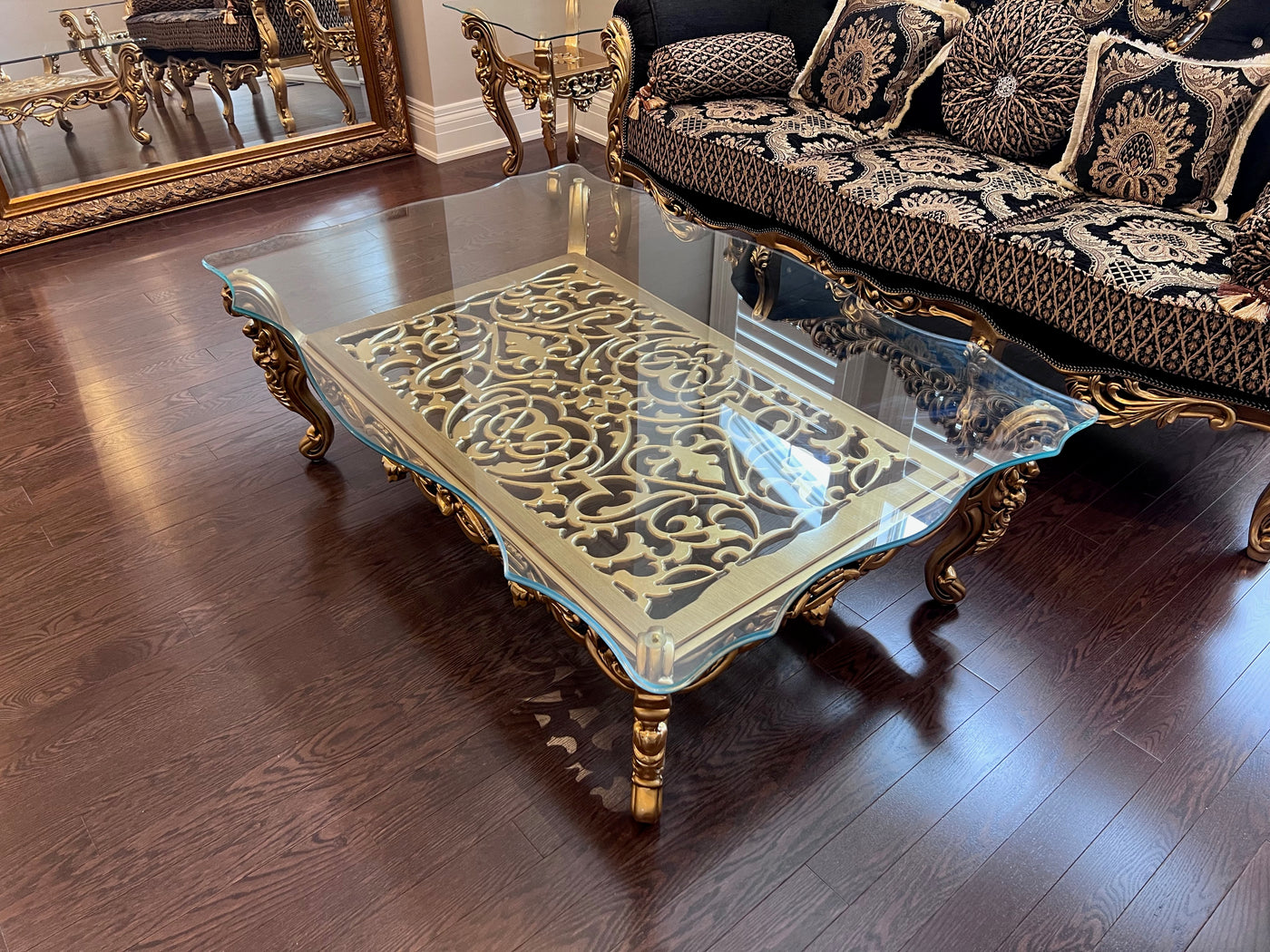 'Paradise Home Decor Furniture' Gold Wood Carved Glass Top Coffee Table.