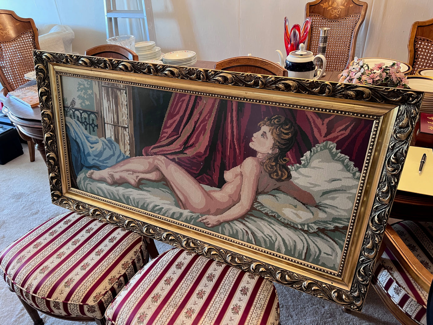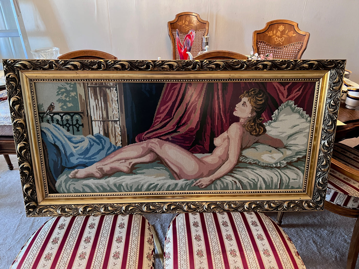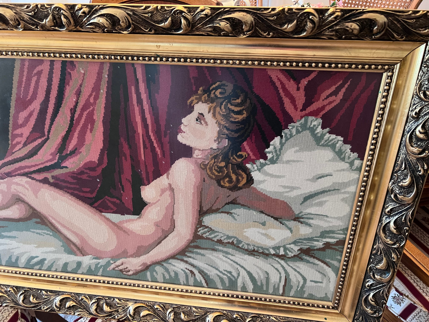 Large Gold Framed Needlepoint- Nude Lady Posing.