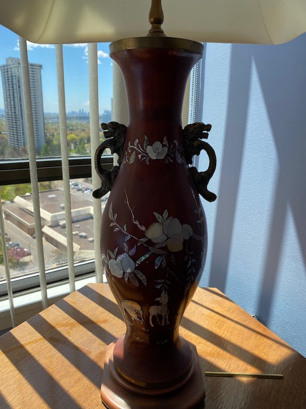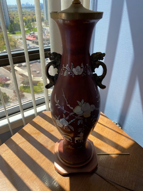 Red/Brass Mother of Pearl Inlay Table Lamp.