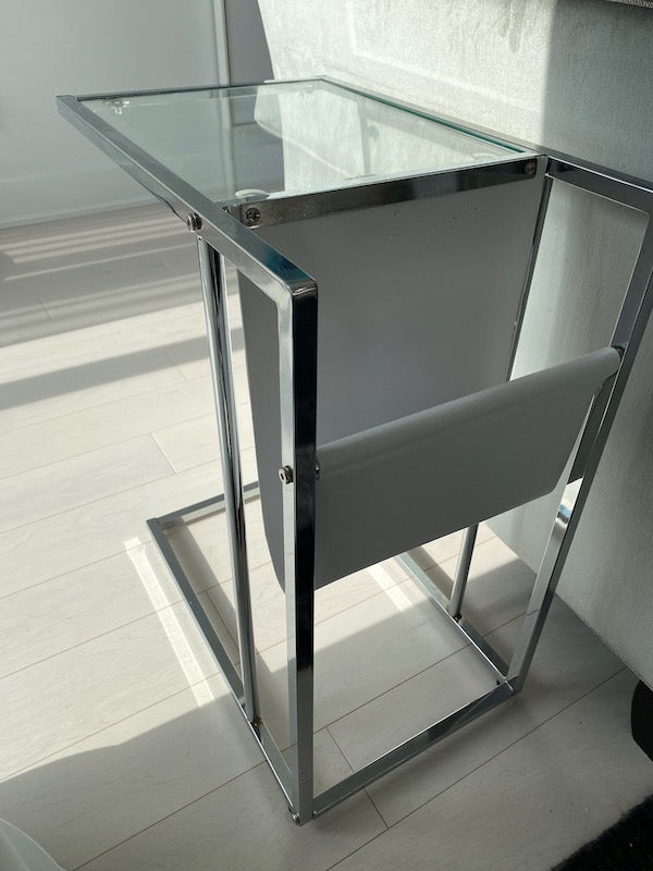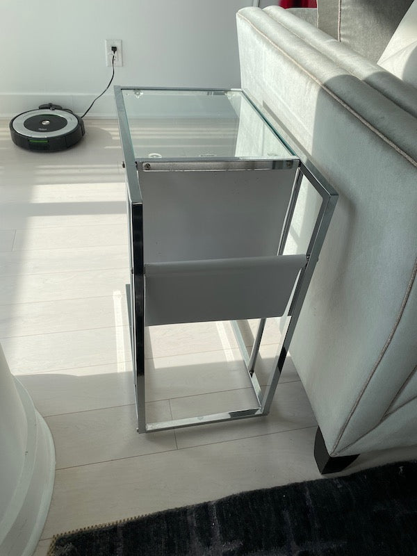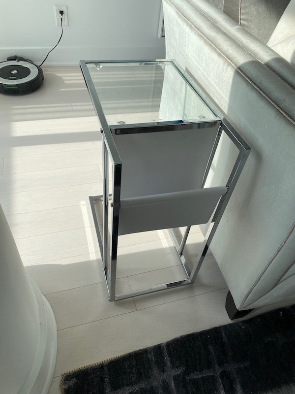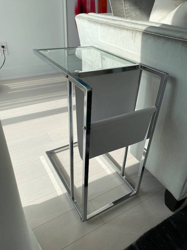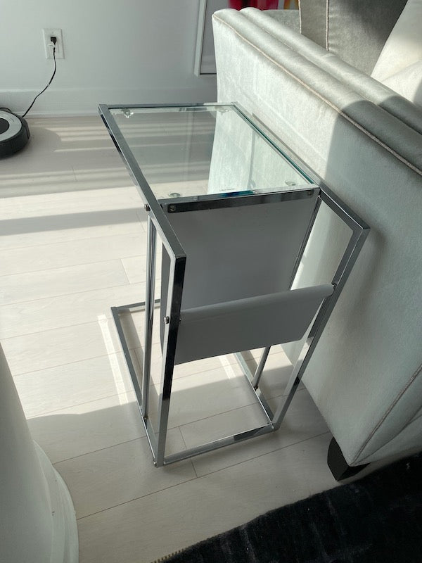 White/Chrome Metal Accent Table with Magazine Holder. Add a pop of modern allure to your home with this Durham accent table. The table's C-shape lets you easily slide the base under your sofa to bring your drinks and snacks within arm's reach. Corral newspapers, brochures and magazines in the holder to keep the tabletop free for snacks and drinks. The shiny chrome base and glass tabletop make this accent table a modern must-have.