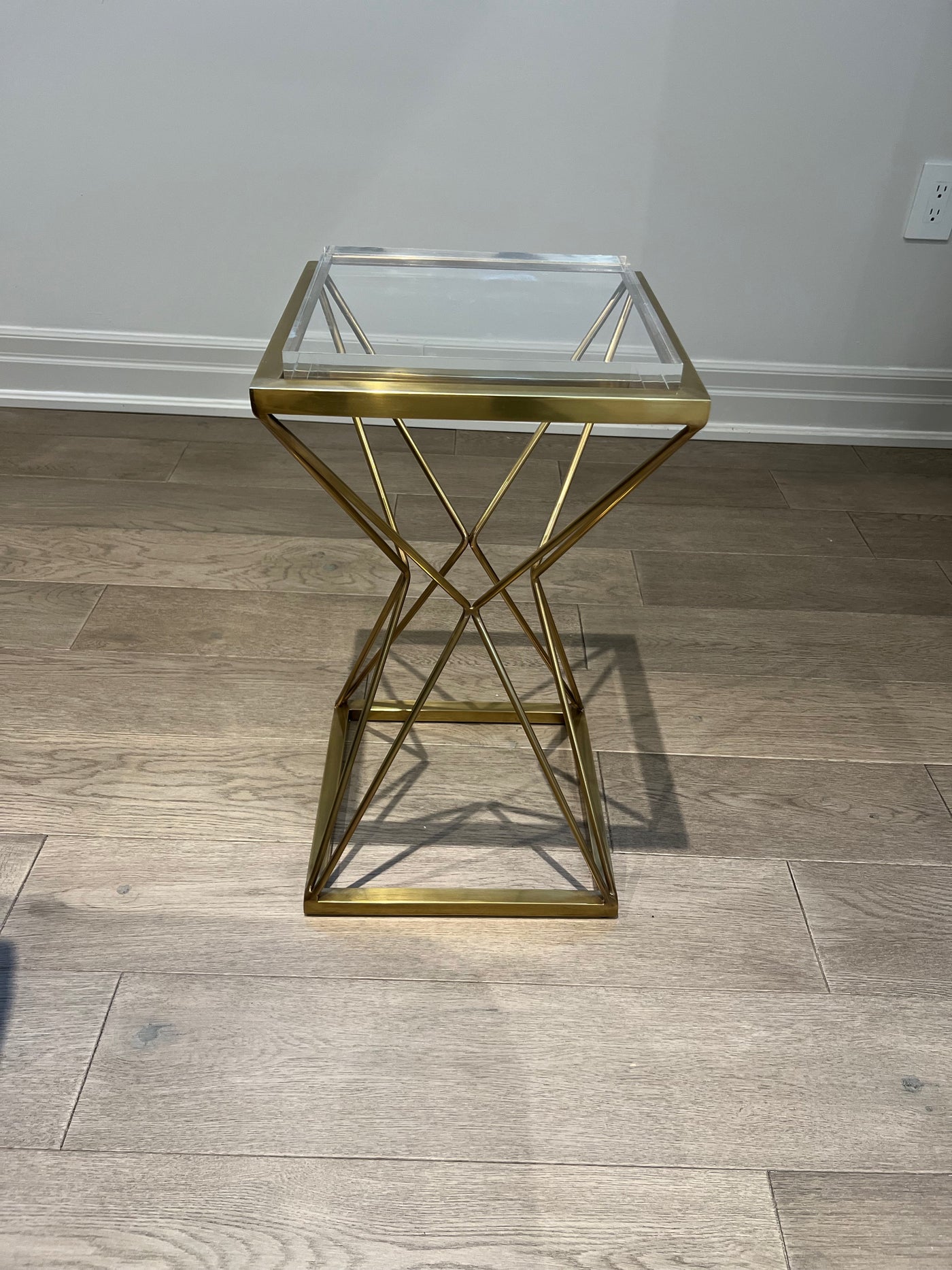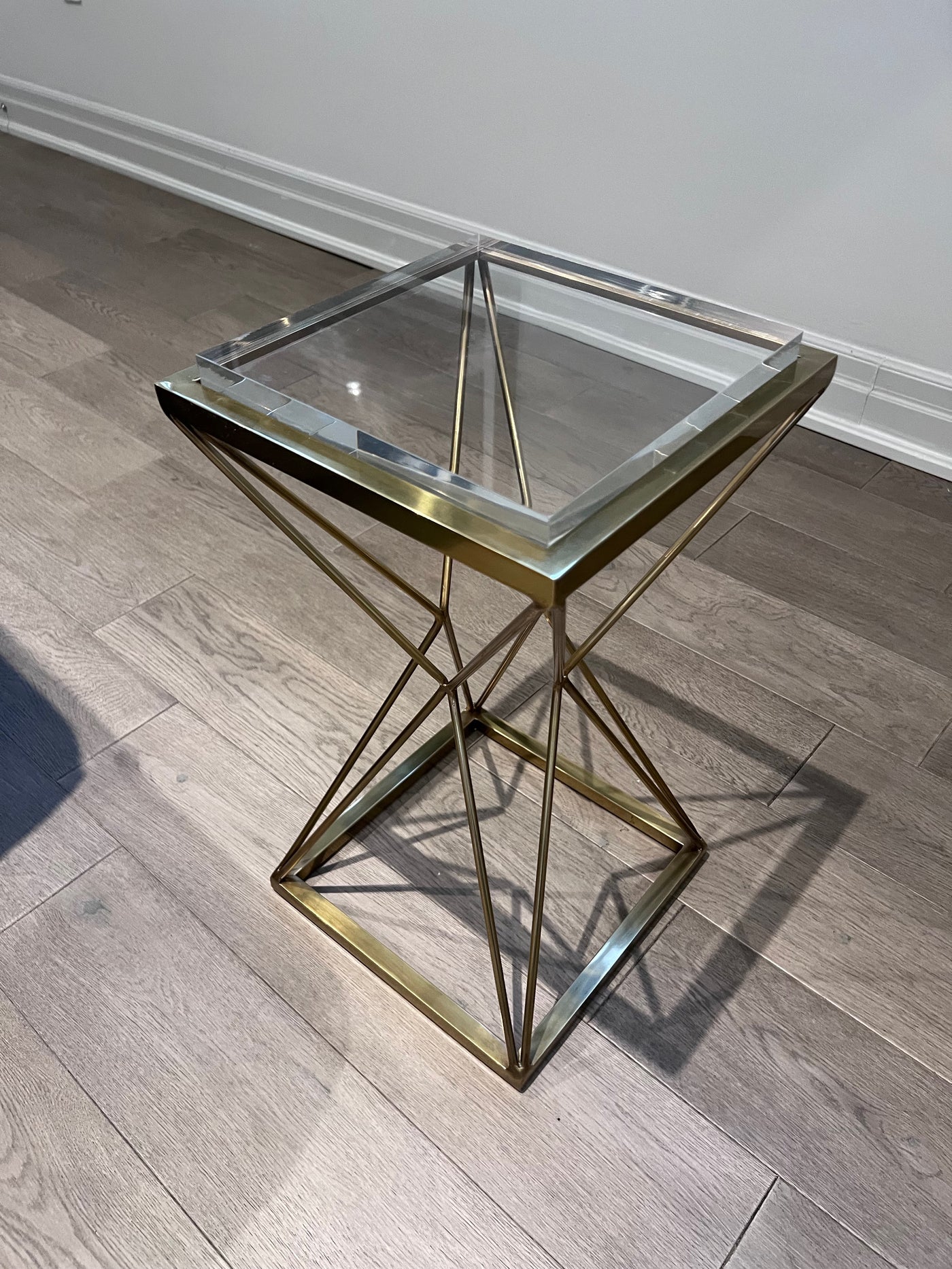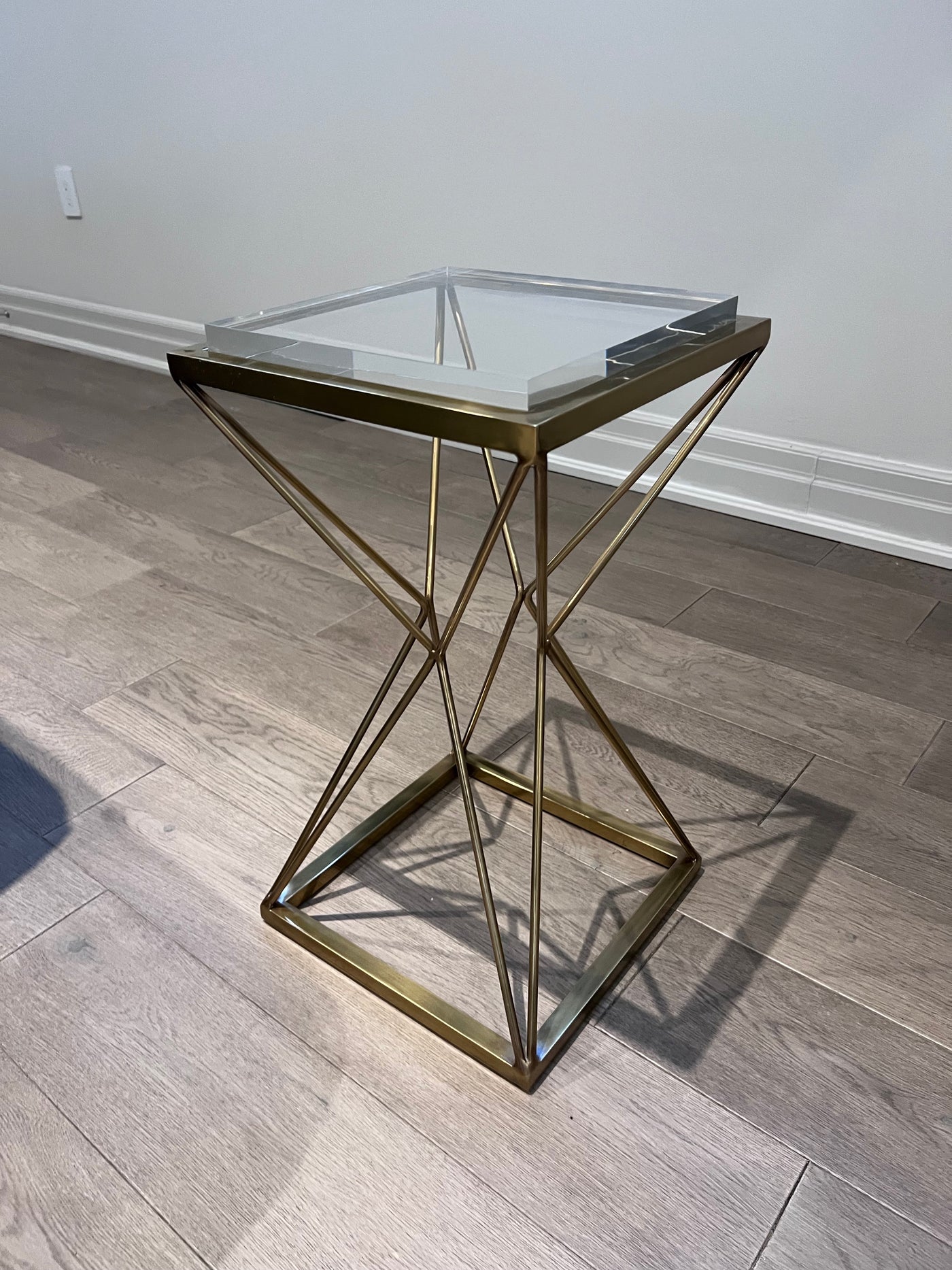 Clyde Geometric Martini Table in Antiqued Brass with Acrylic Top.