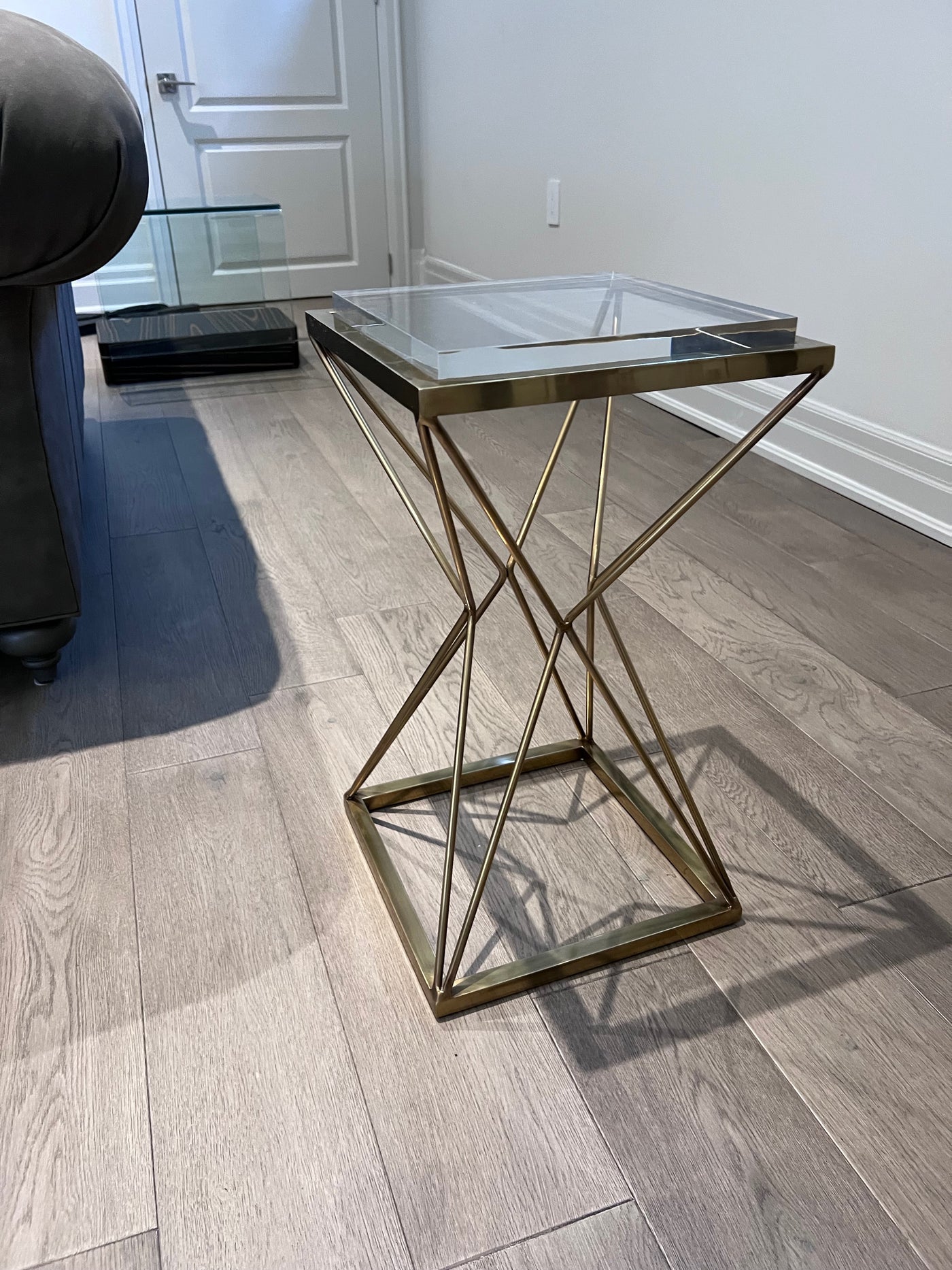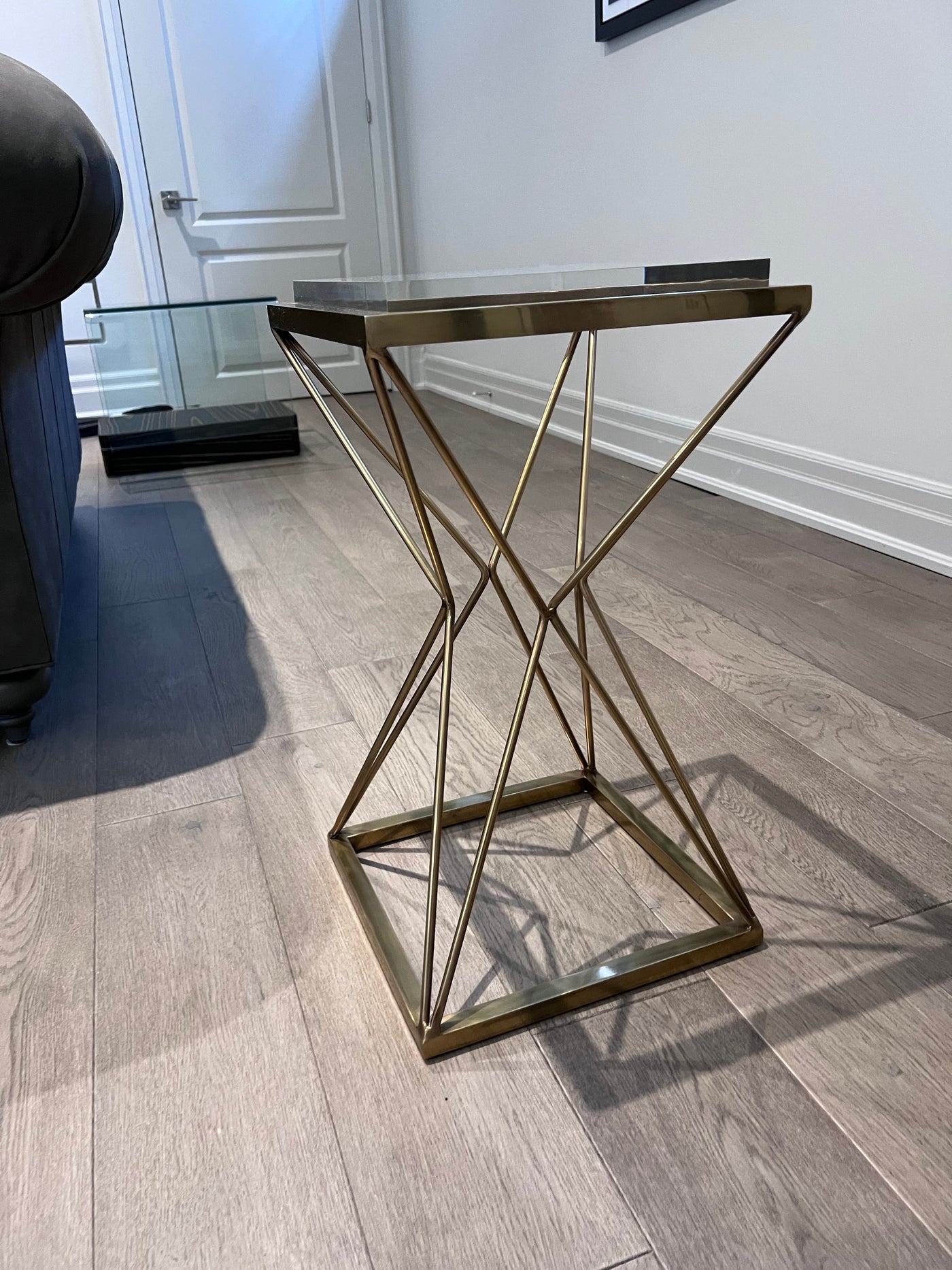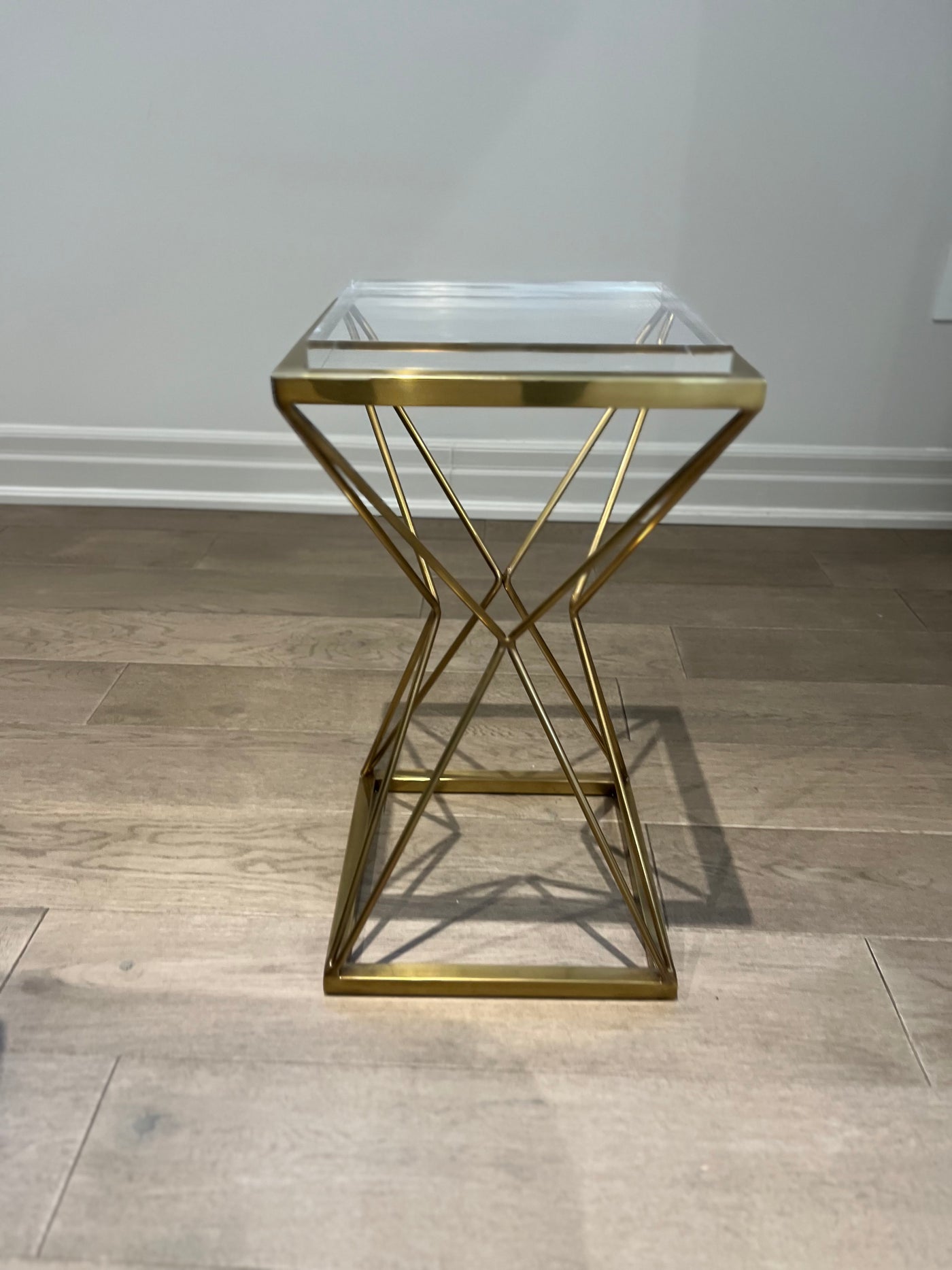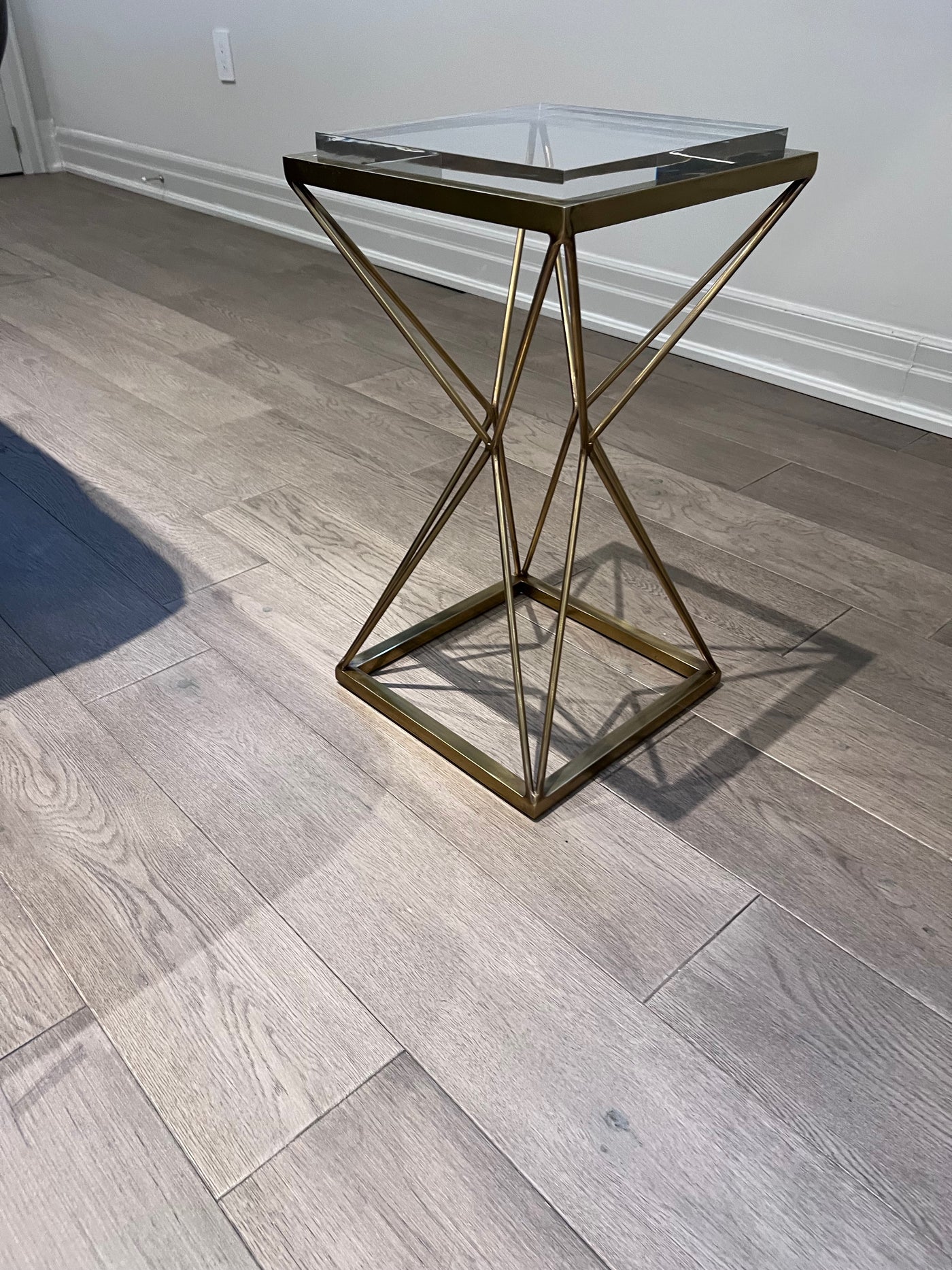 Clyde Geometric Martini Table in Antiqued Brass with Acrylic Top.