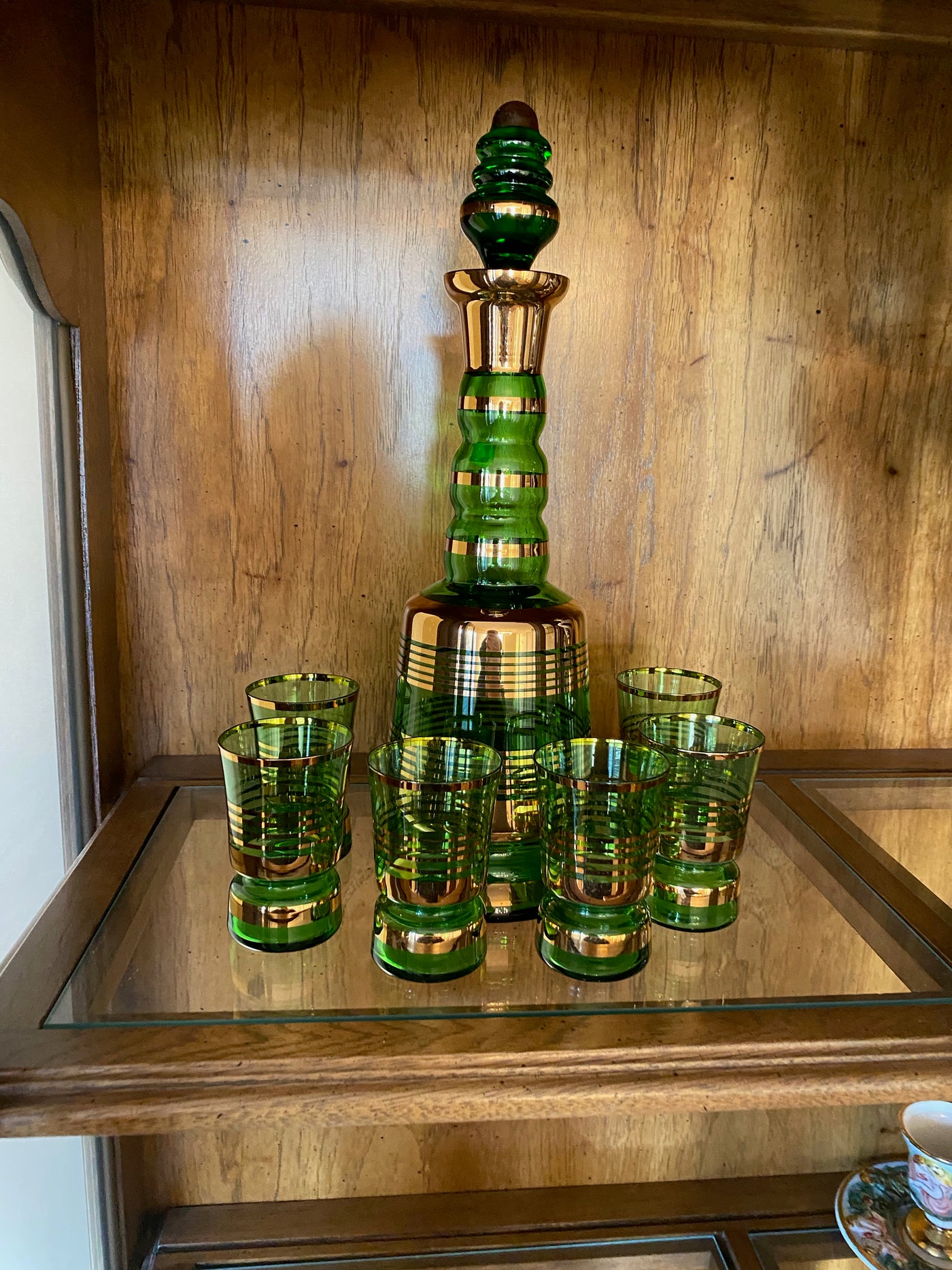 Green & Gold Glass Decanter + 6 Shot Glasses.