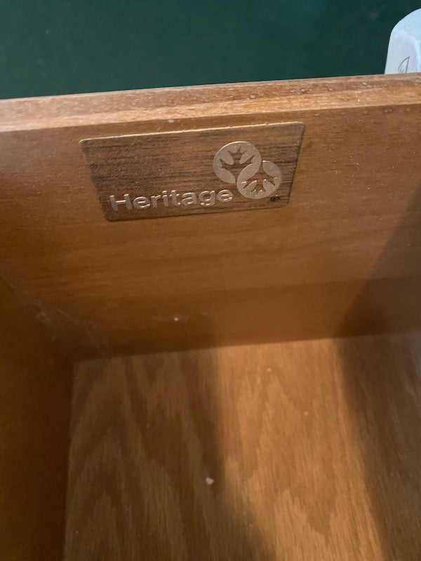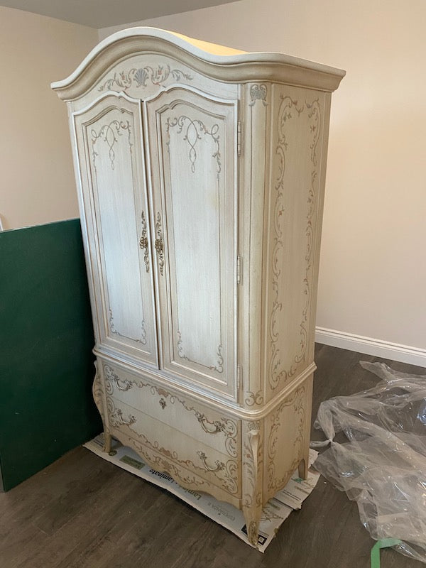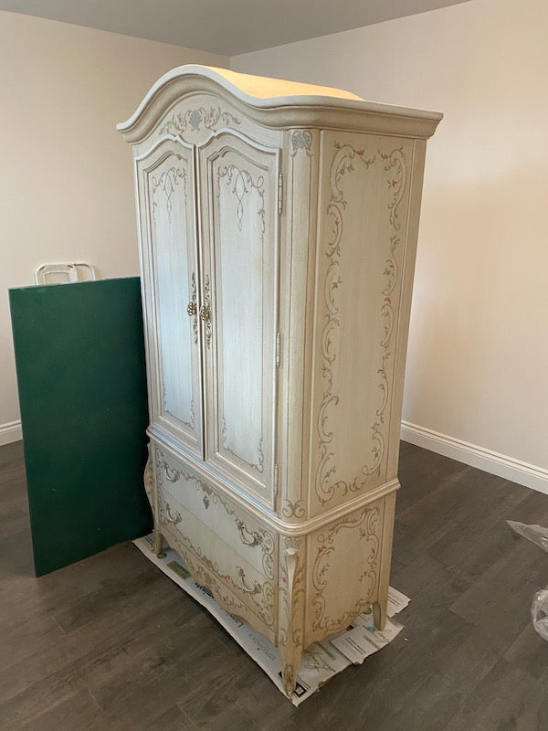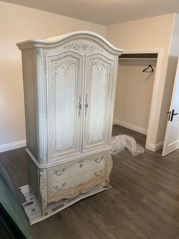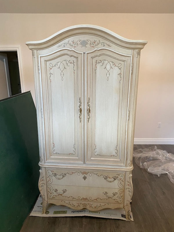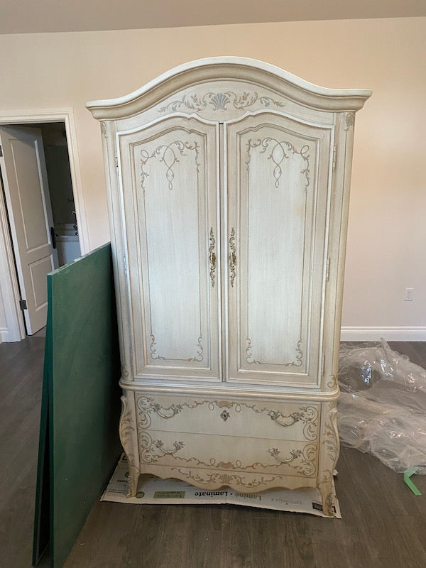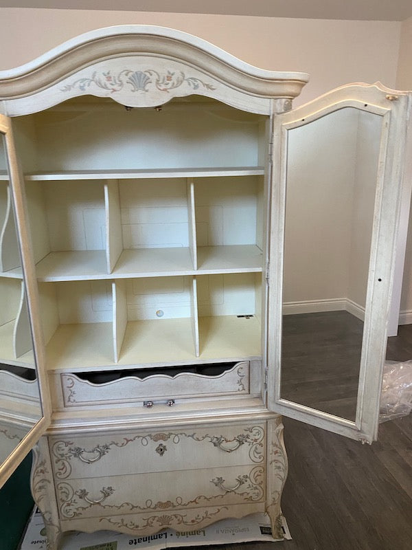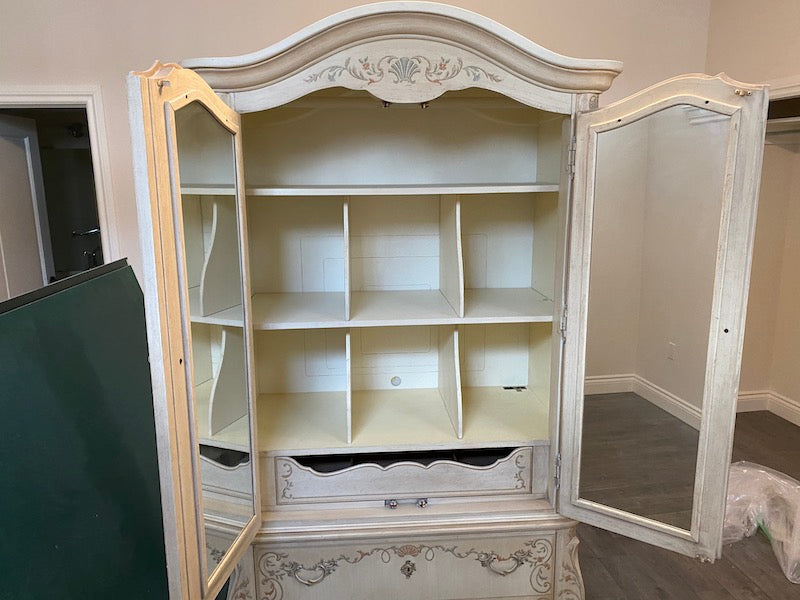 Drexel Heritage White Armoire with painted accents. Interior has 1 drawers and multiple cubes of shelving, with mirrors on the inside of either door. The bottom has 2 drawers.
