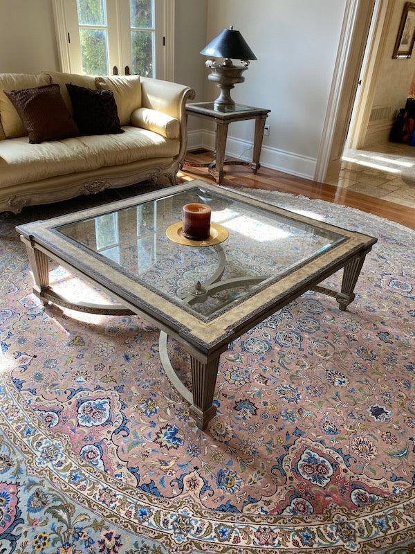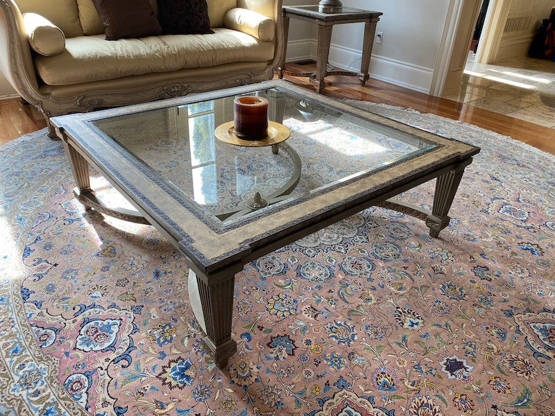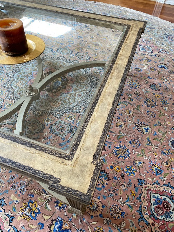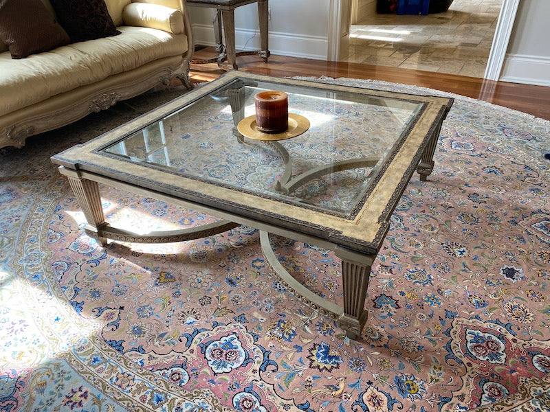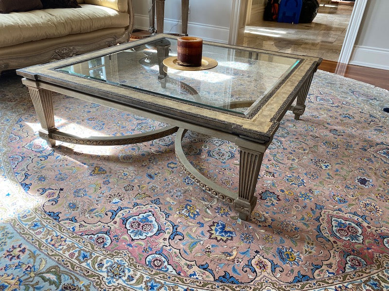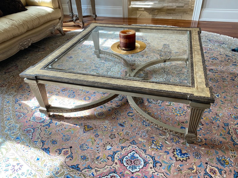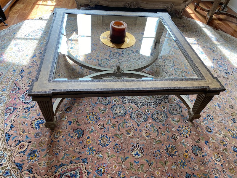 Large Coffee Table- Glass Insert, Wood Frame. Large solid base, thick cut glass with a double half-moon base. In excellent condition!! Purchased from a designer store in Toronto.