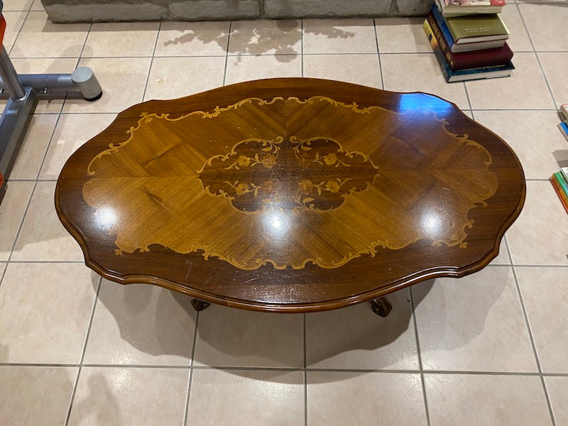 Vintage Italian Rococo Style Inlaid Coffee Table, Carved Base.