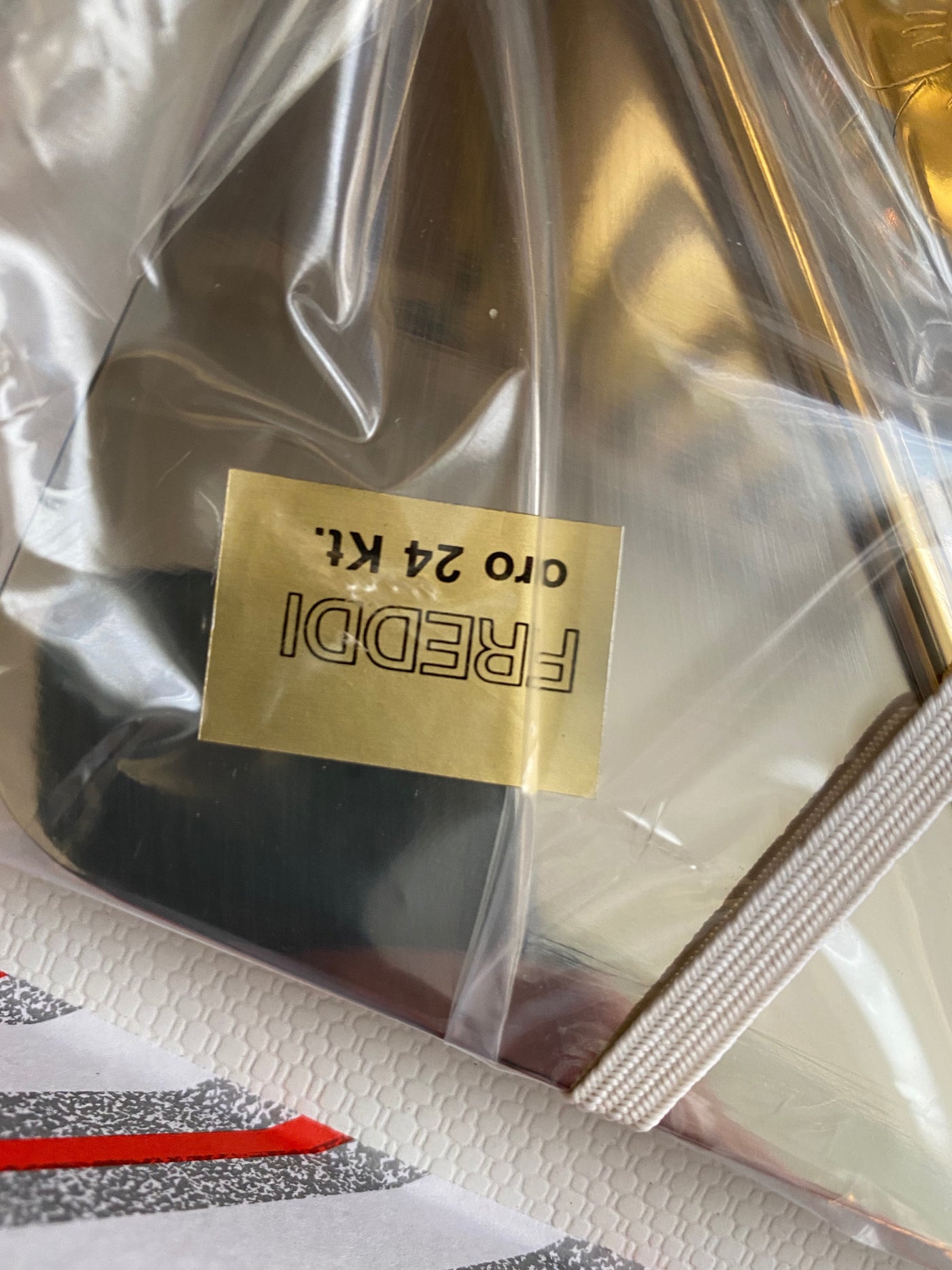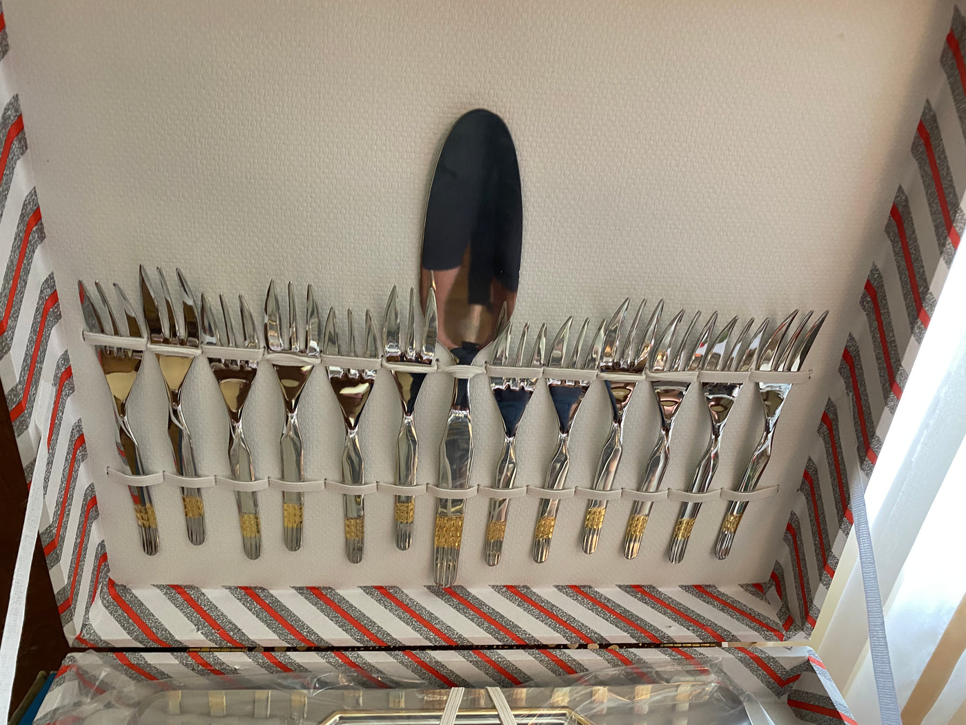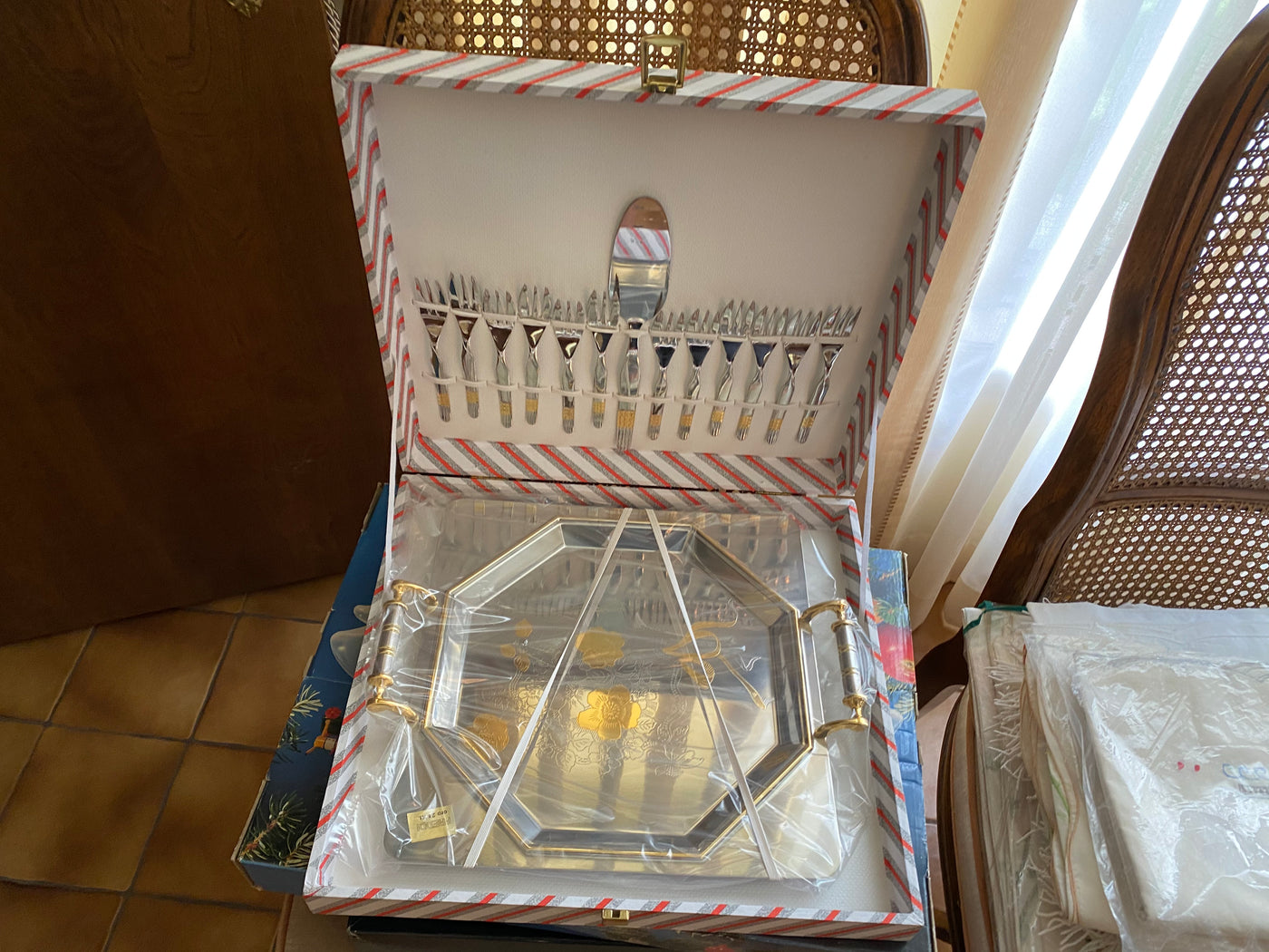 Freddi Oro 24kt Stainless Steel Cake Plate + Forks and Cake Knife.