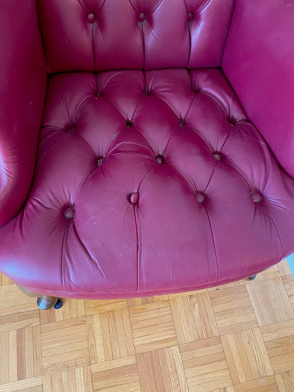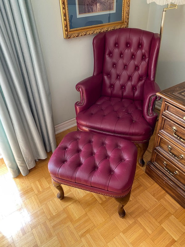 2 Red Leather Wingback Chairs + 1 Ottoman.