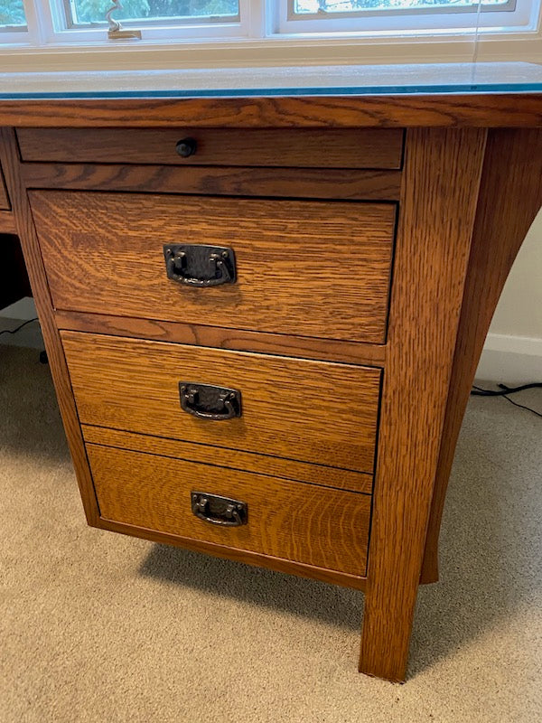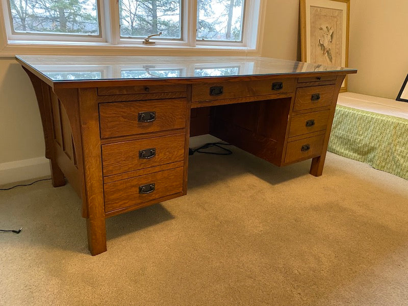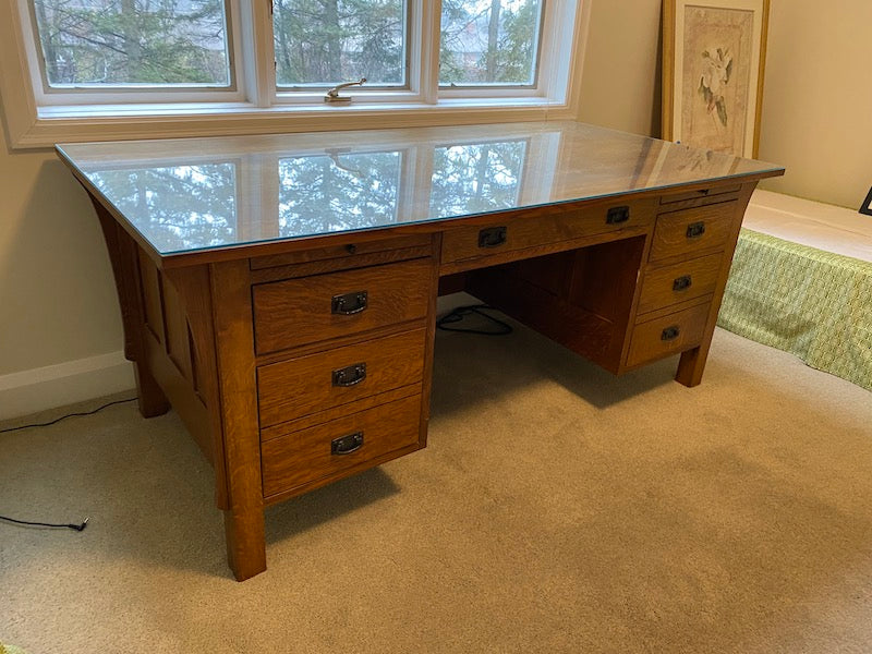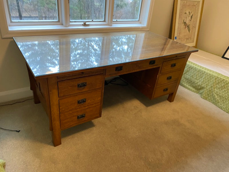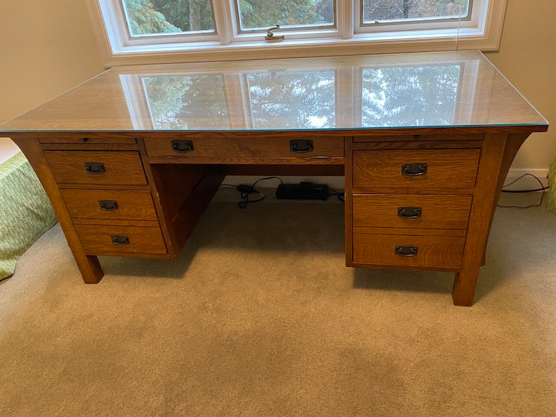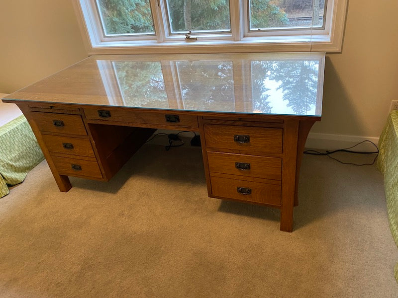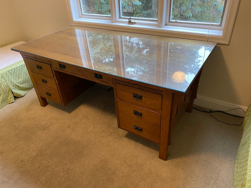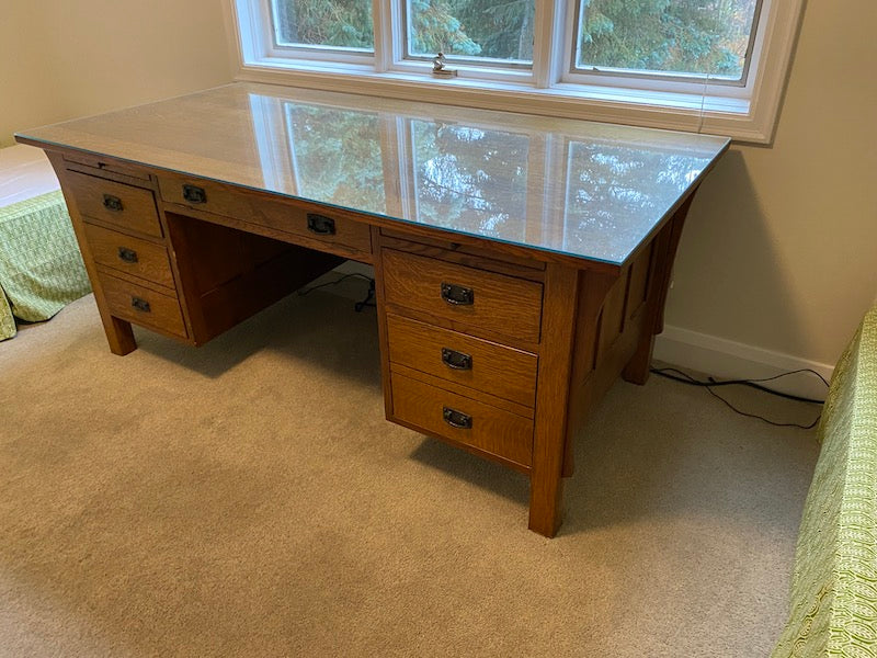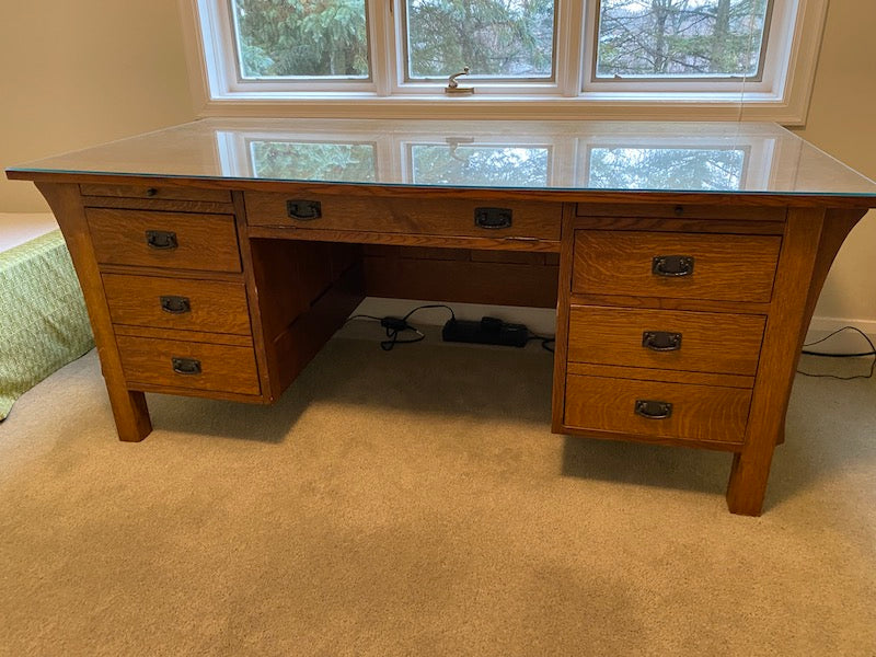 Harvest House, Mission Collection Double Pedestal Executive Desk. There is a protective glass top. This is an authentic Harvest House piece.