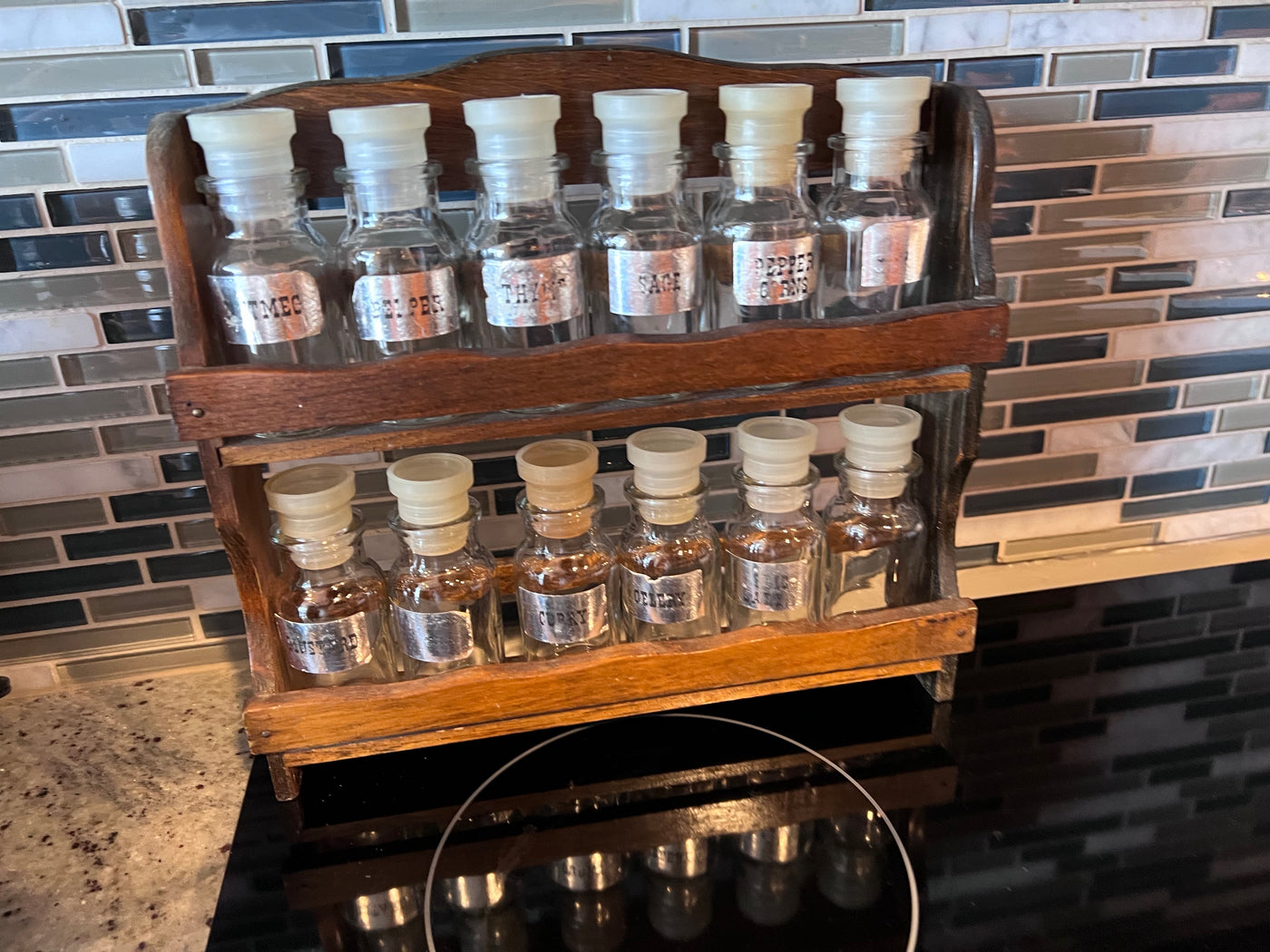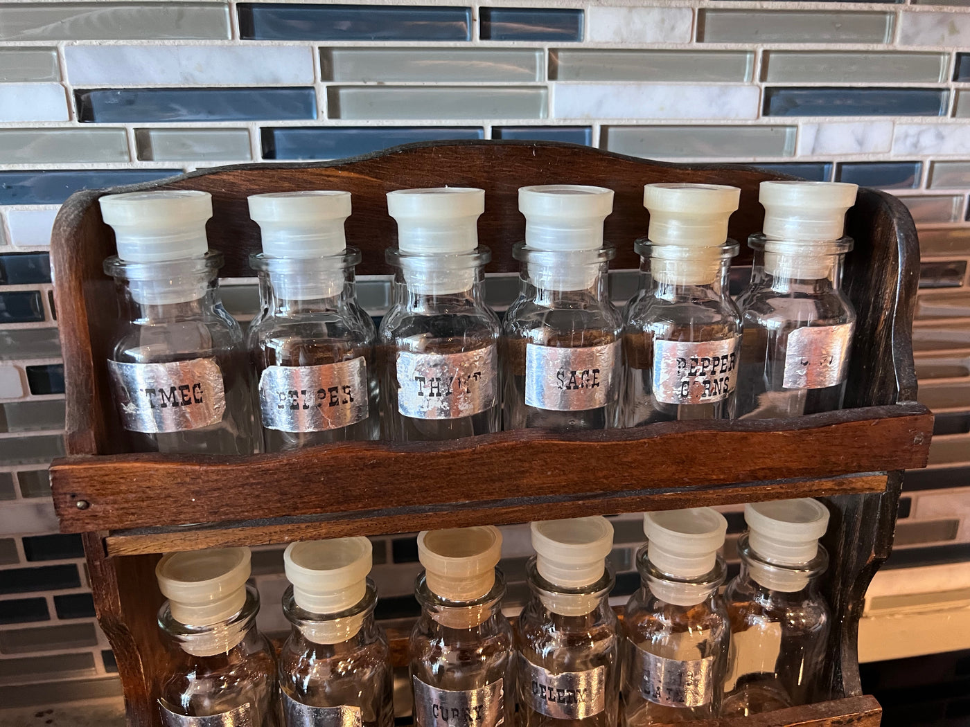 Vintage Spice Rack- Glass Bottles, Wood Rack.