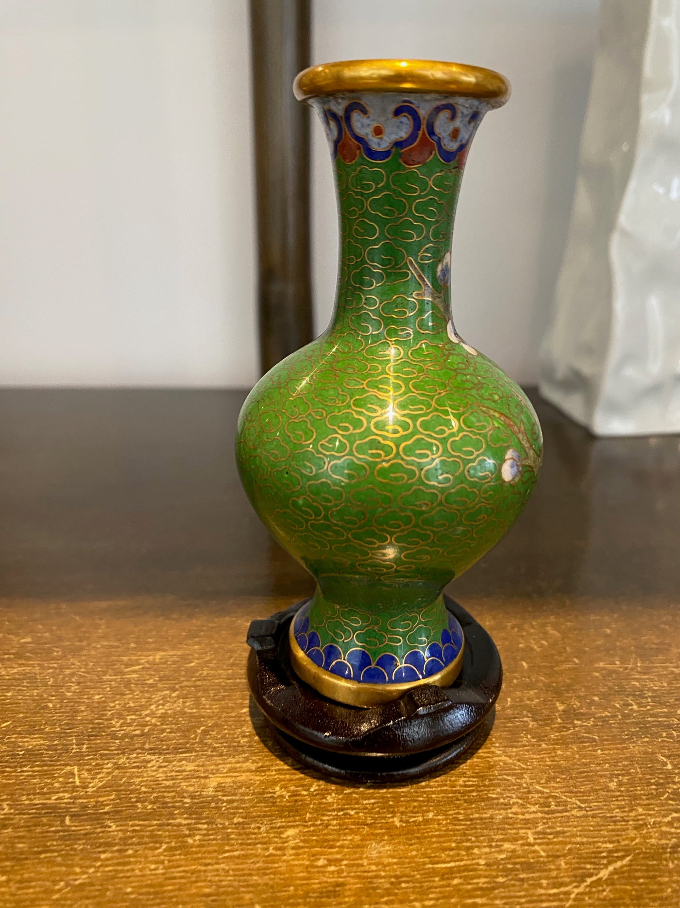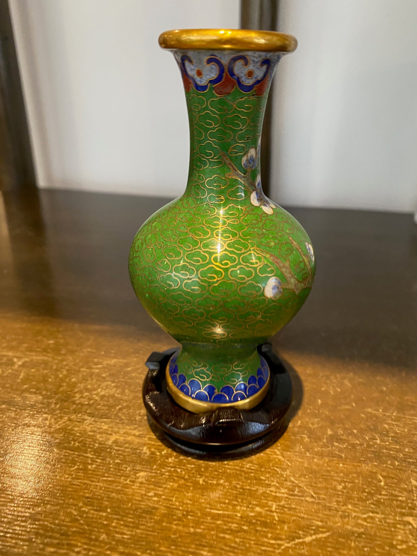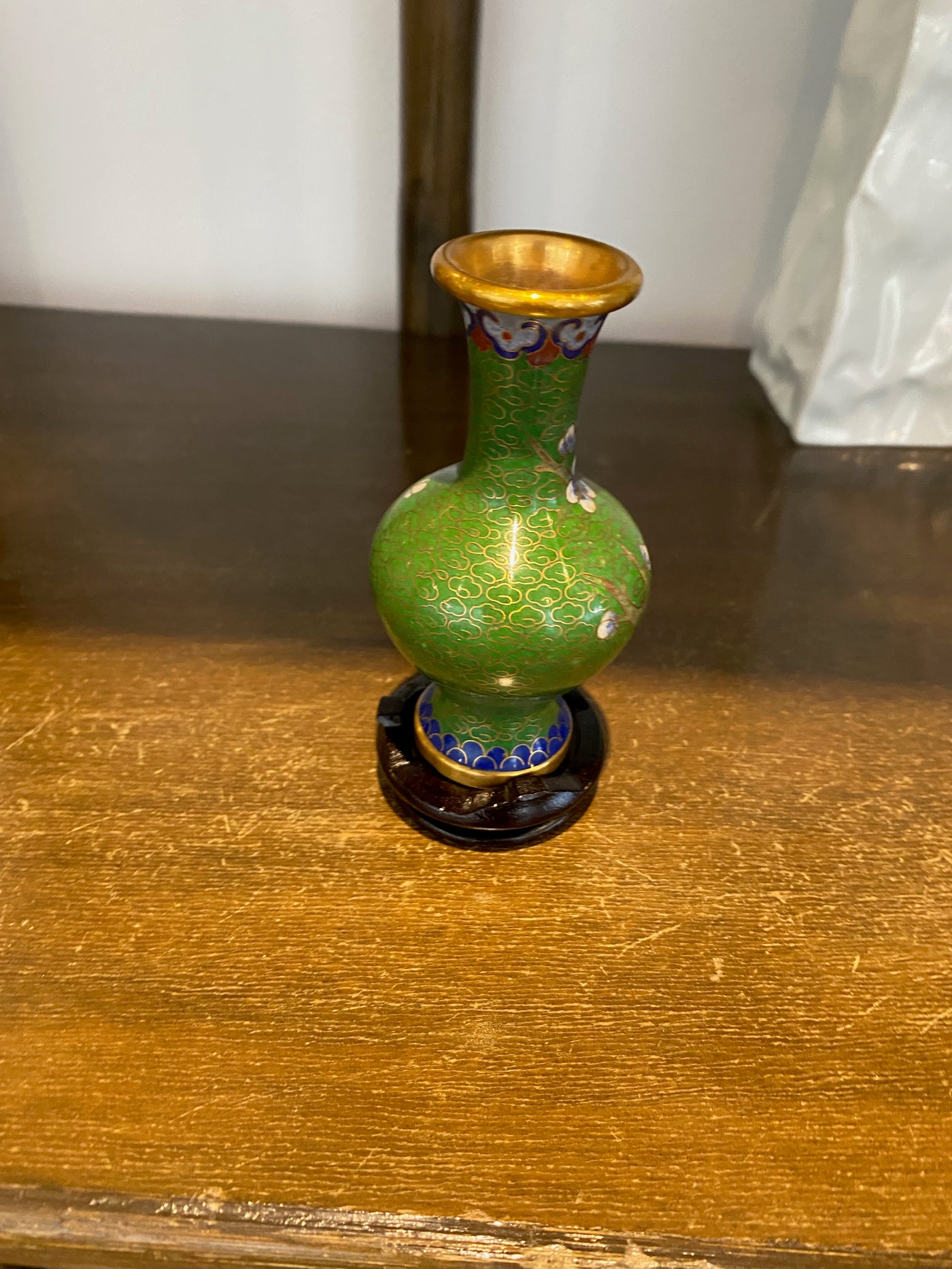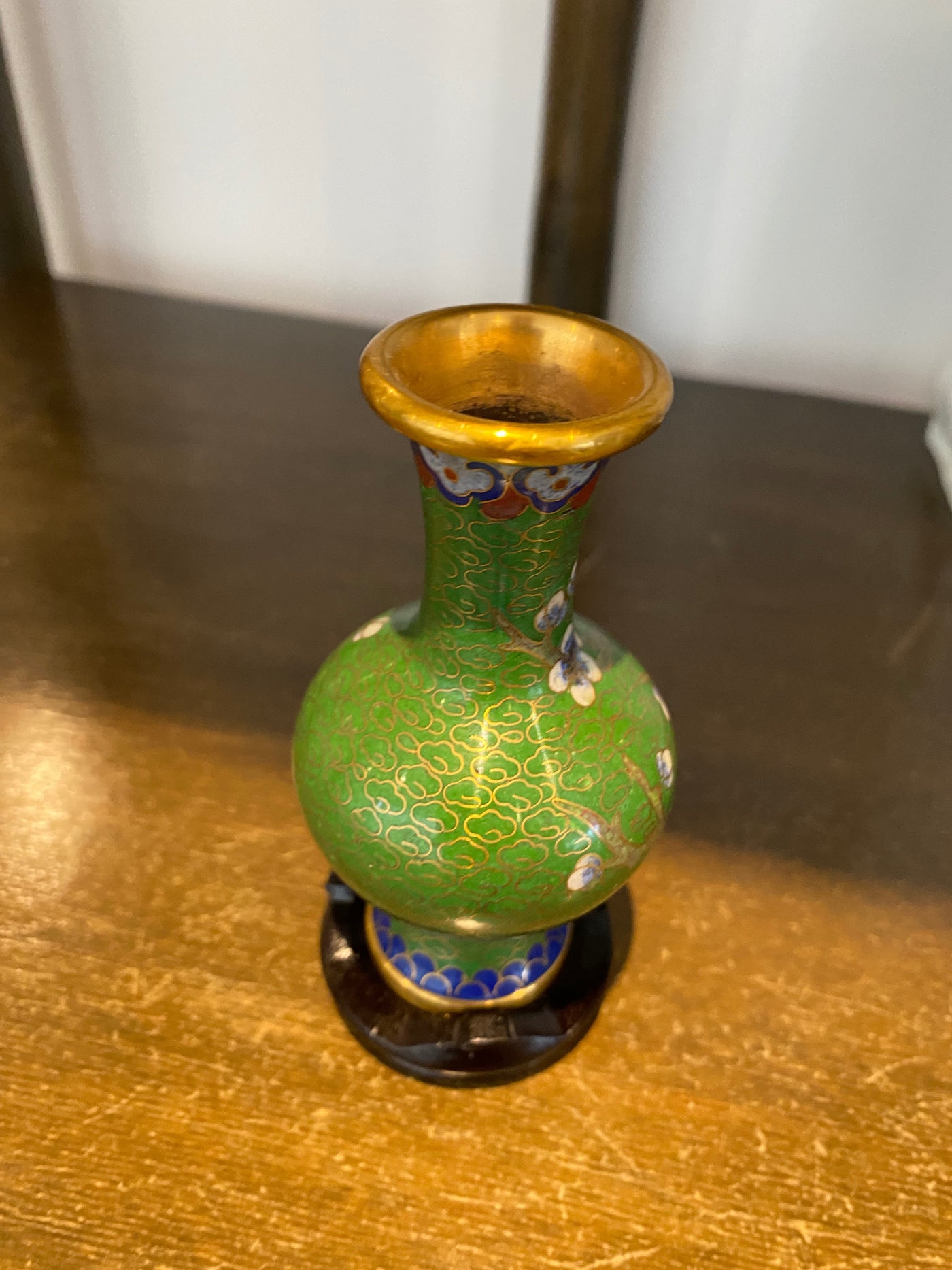 Small Brass Cloisonné Vase with Stand, 5"H.