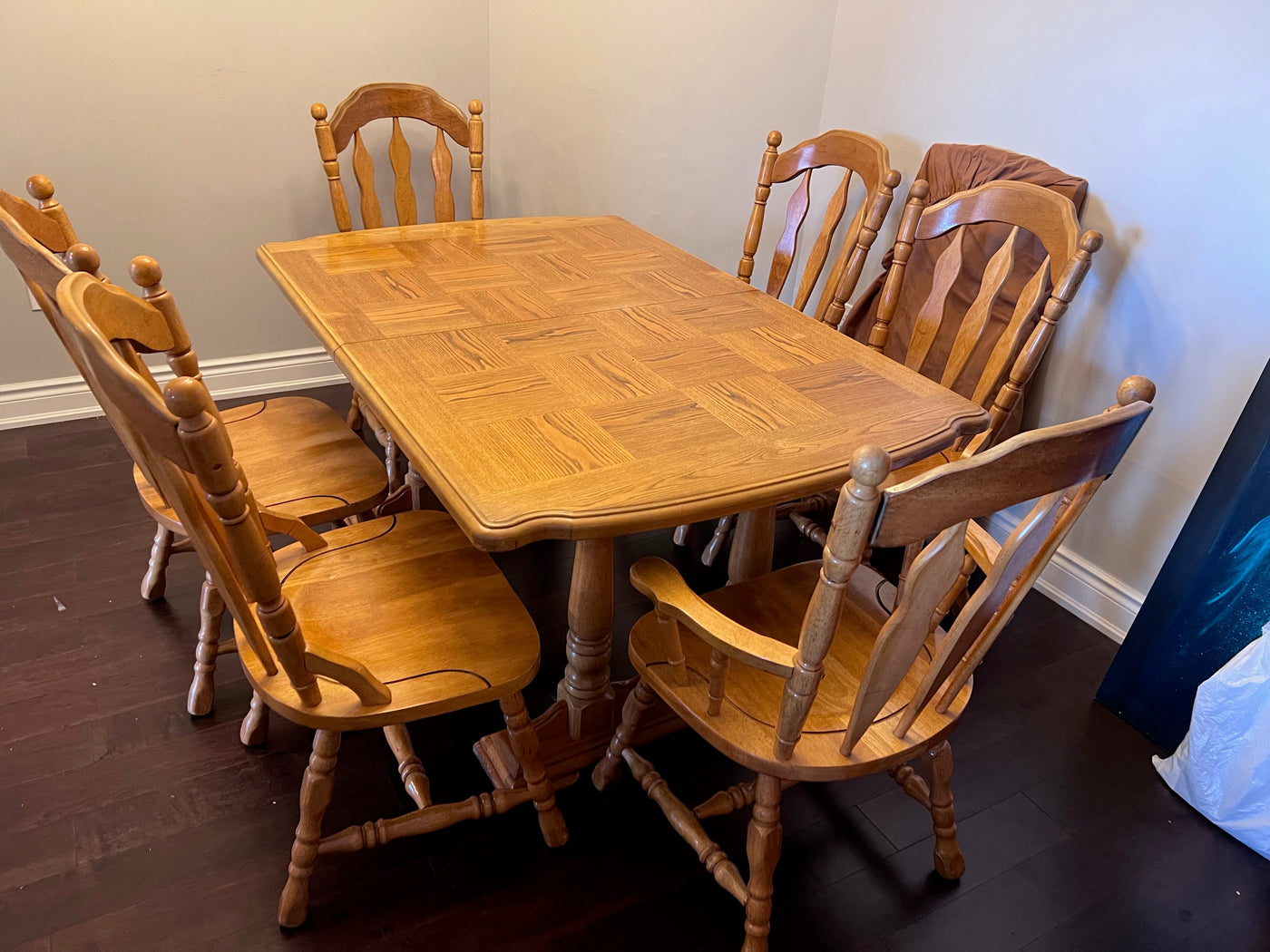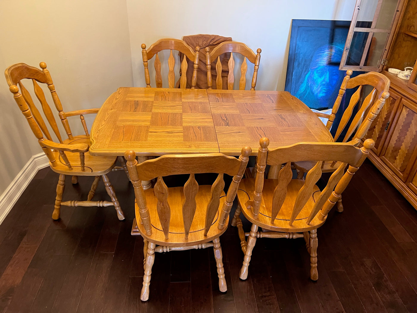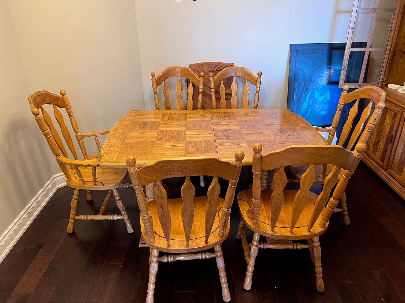 Solid Wood Dining Table & 6 Chairs (+ extra leaf).