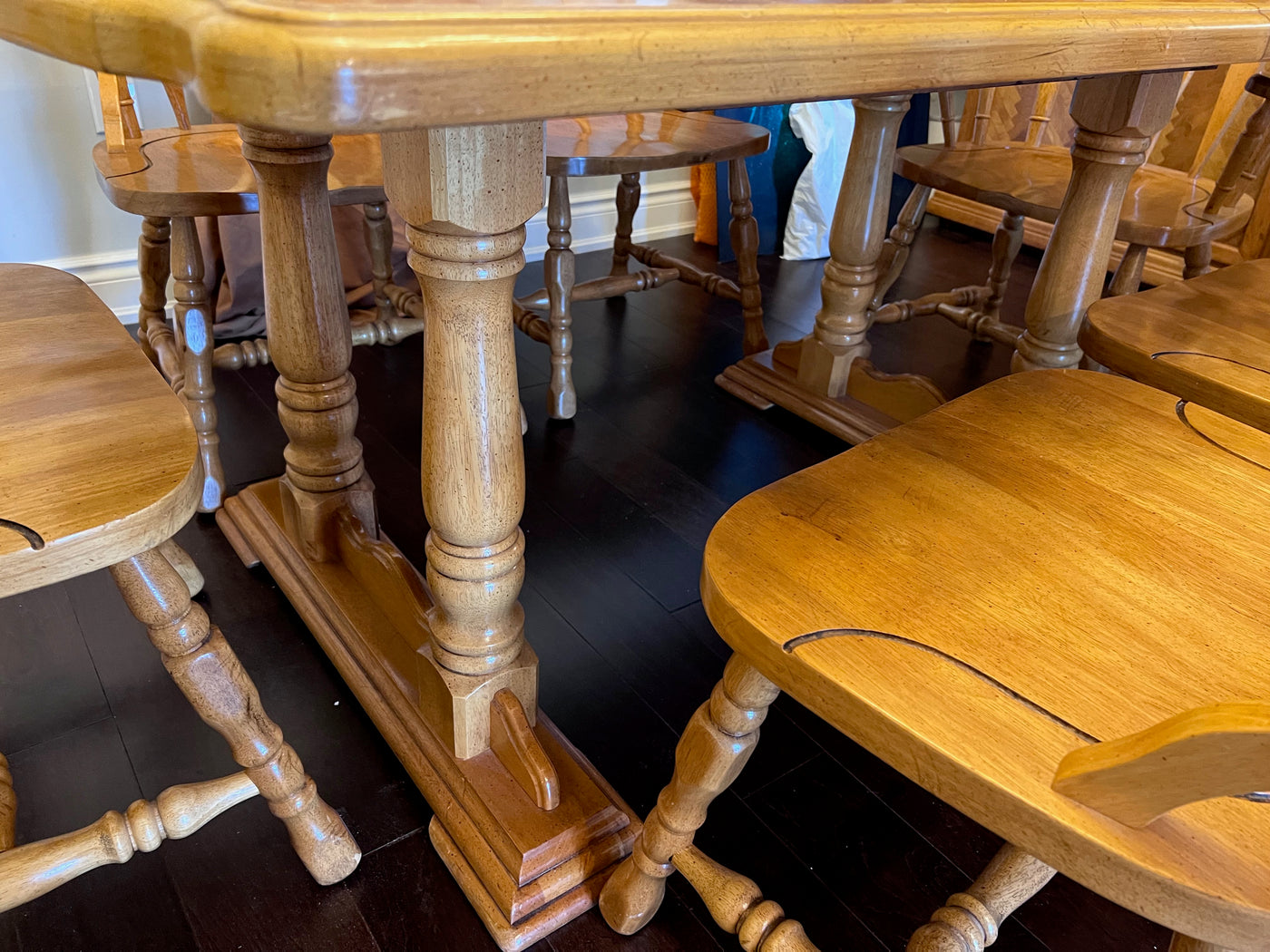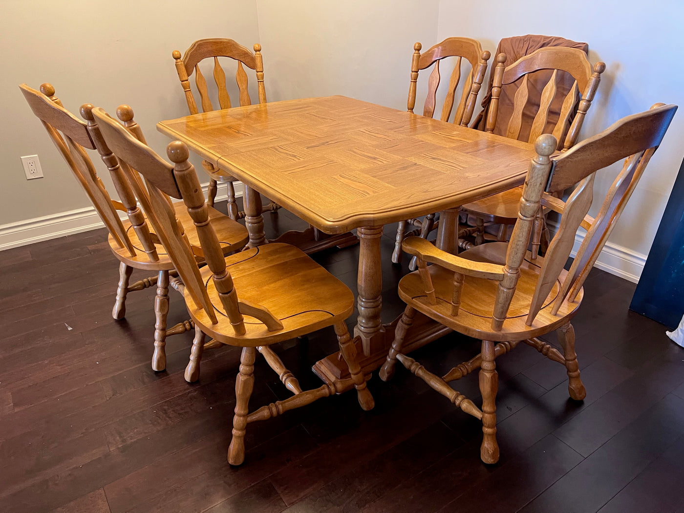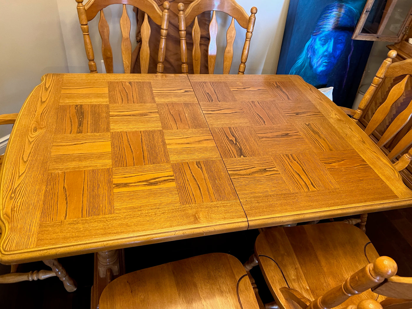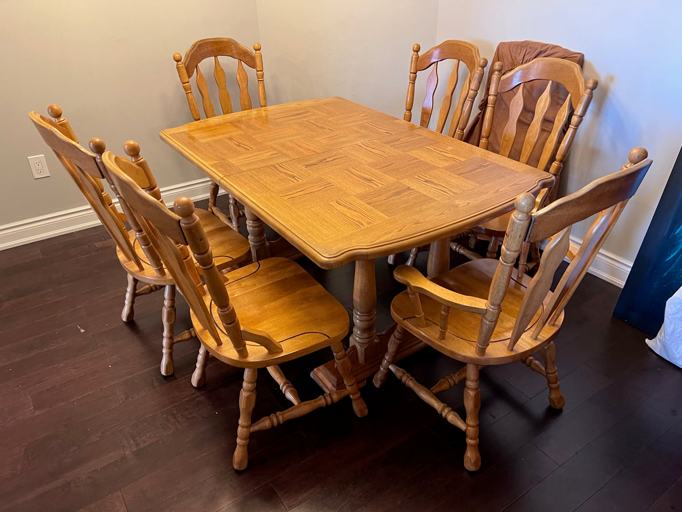 Solid Wood Dining Table & 6 Chairs (+ extra leaf).