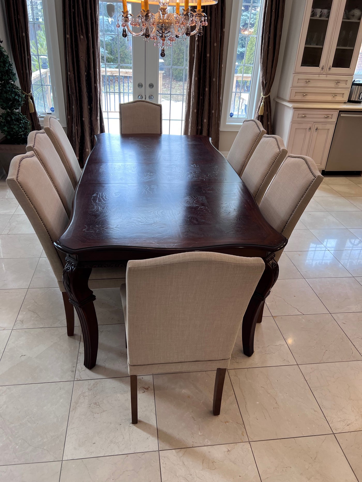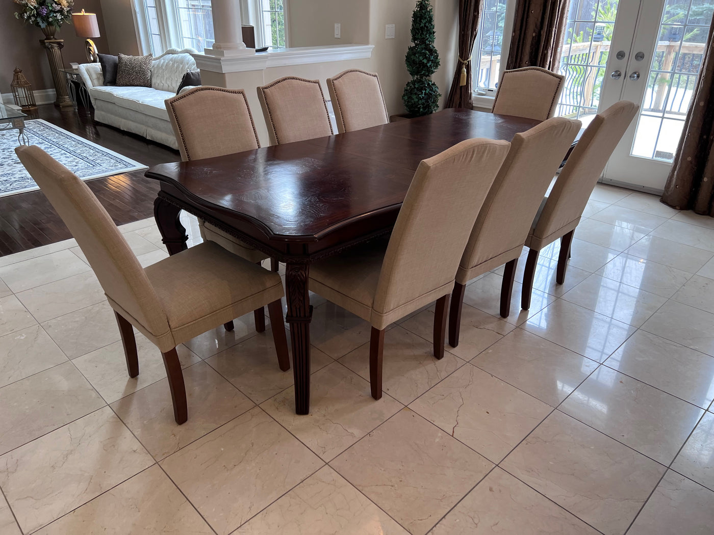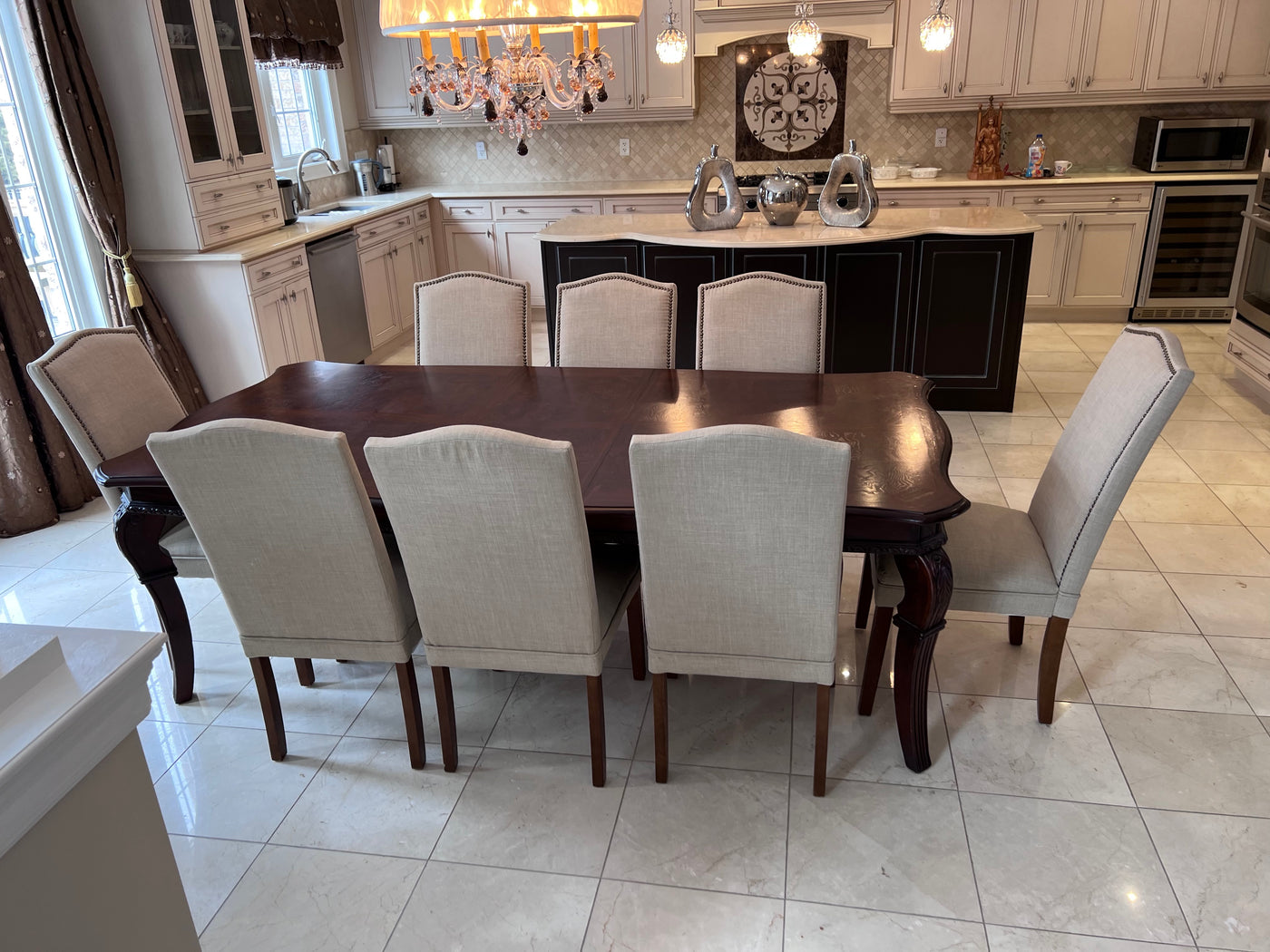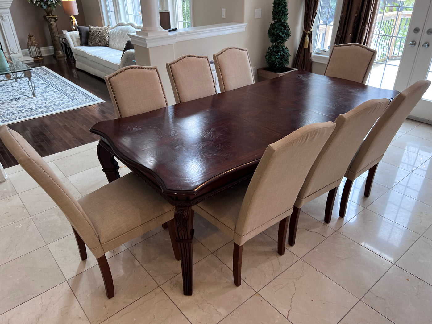 Starwood Furniture Wood Dining Table + 8 Beige Linen Chairs.