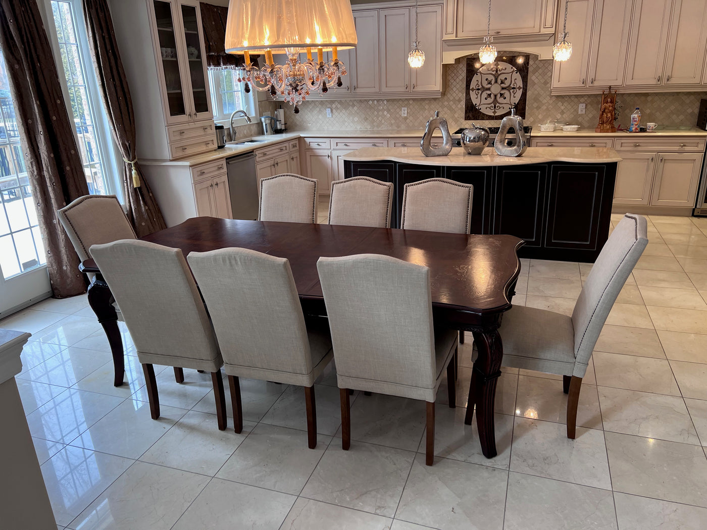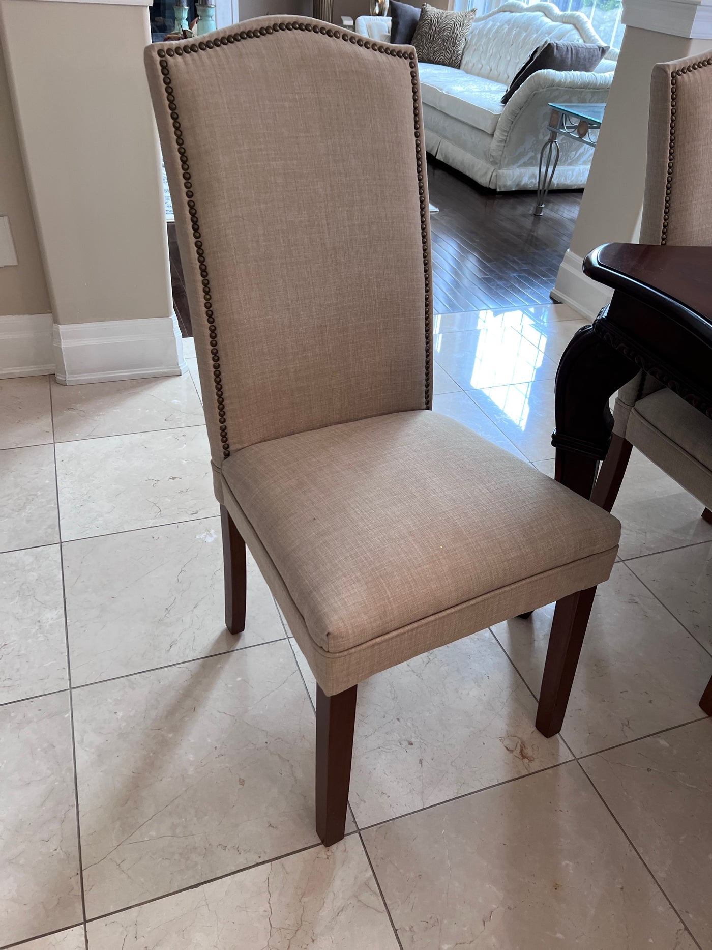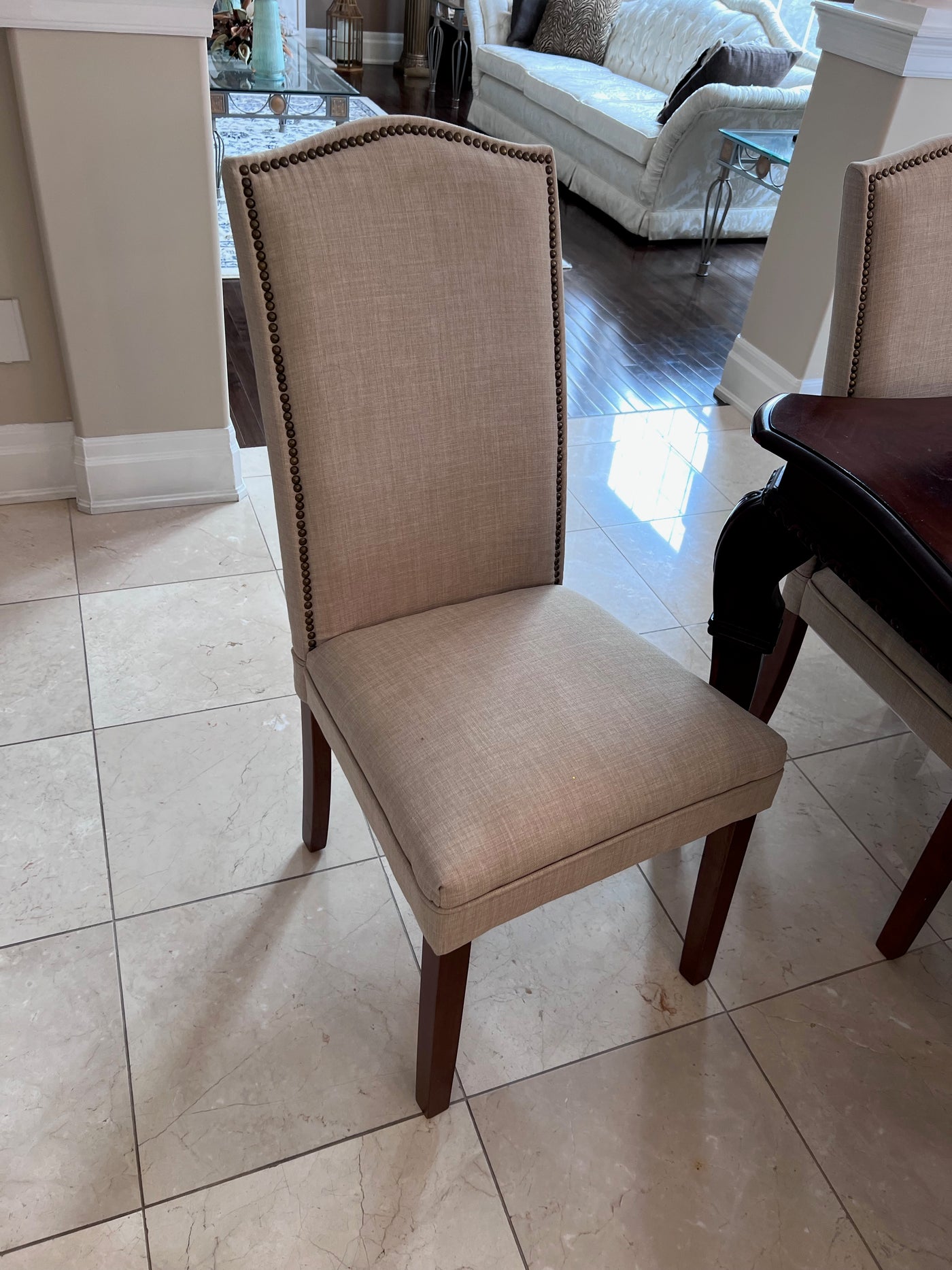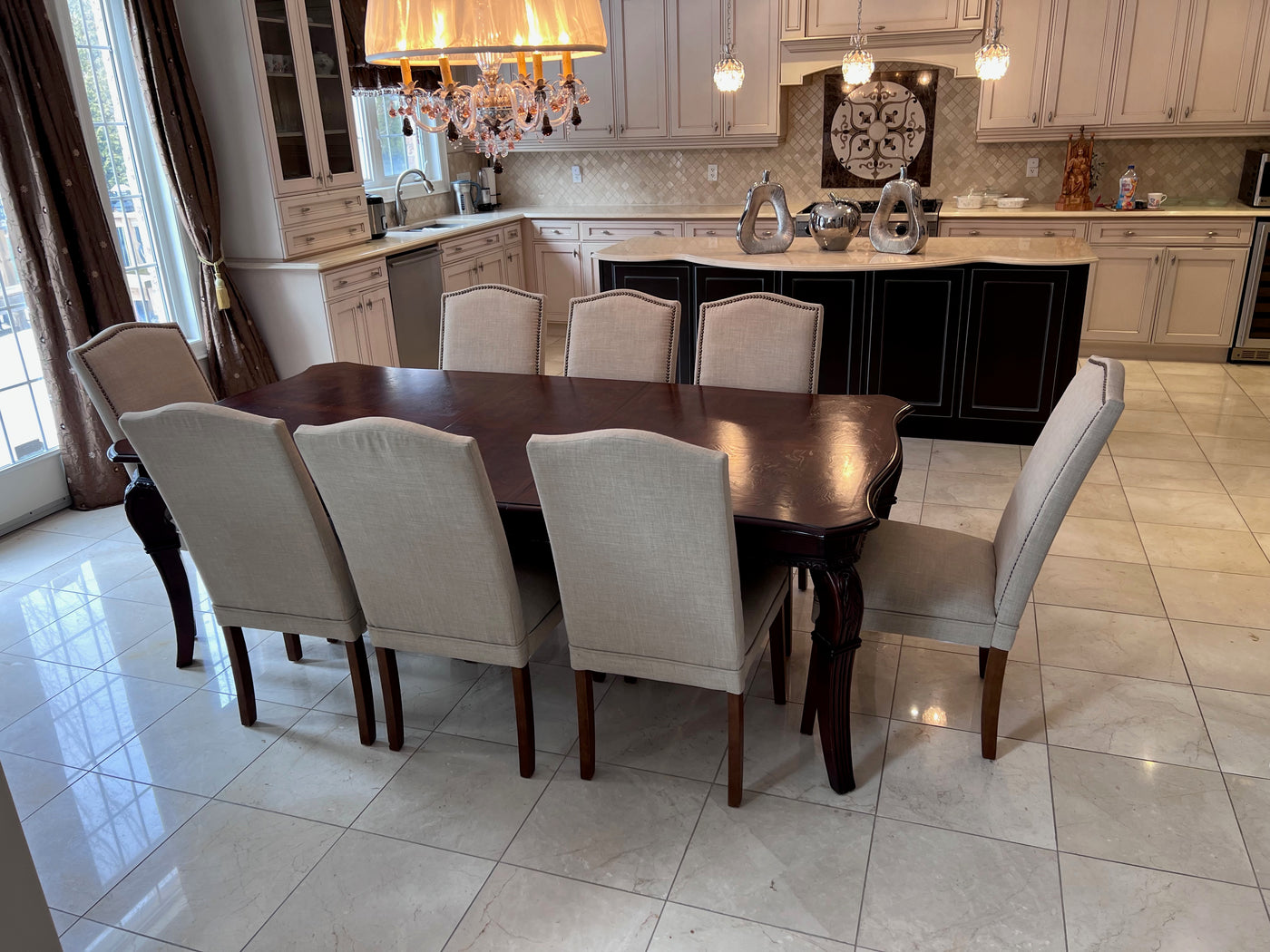 Starwood Furniture Wood Dining Table + 8 Beige Linen Chairs.