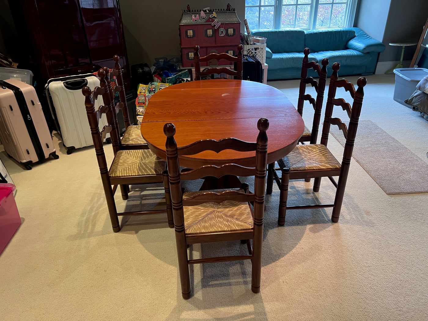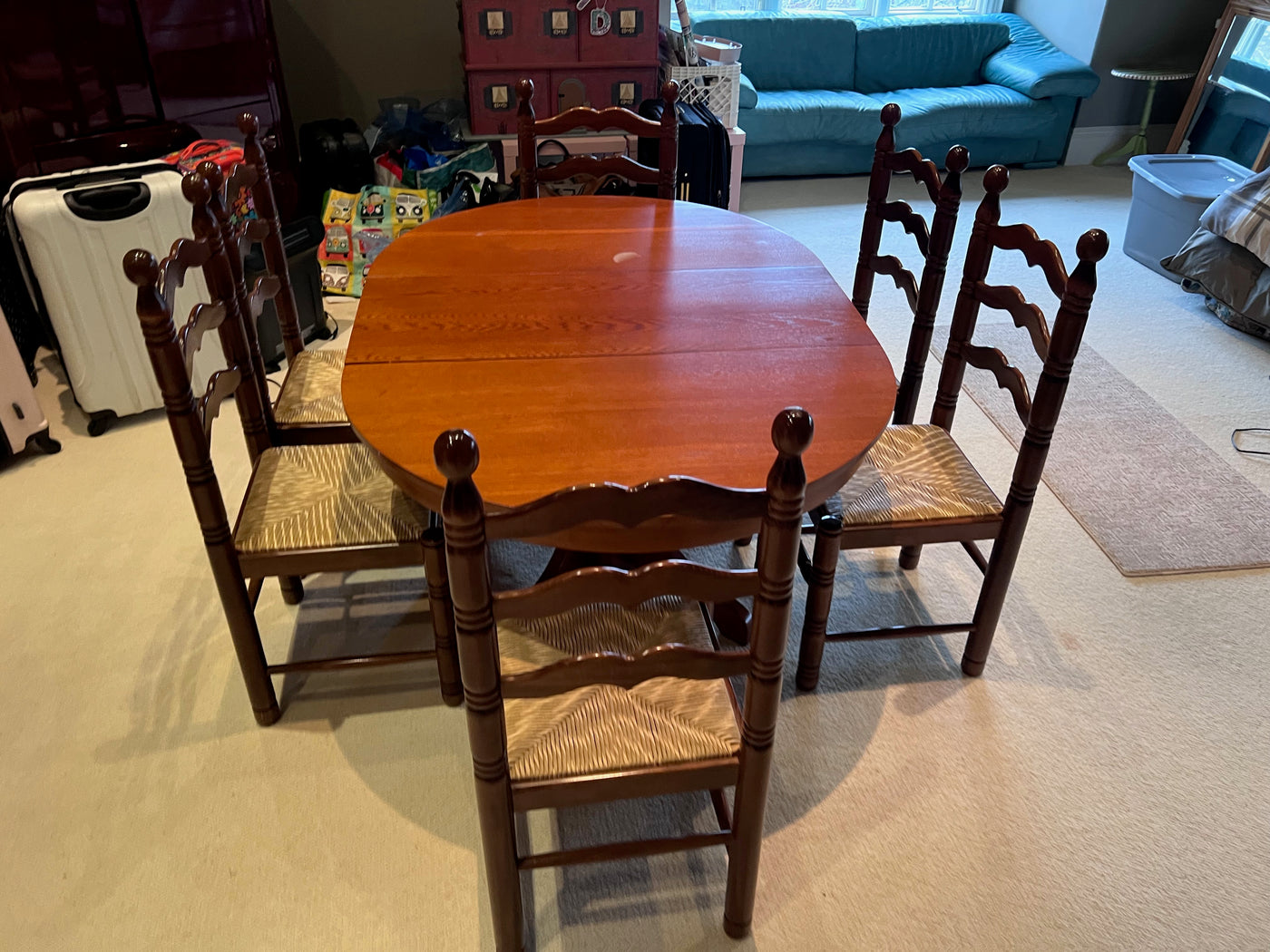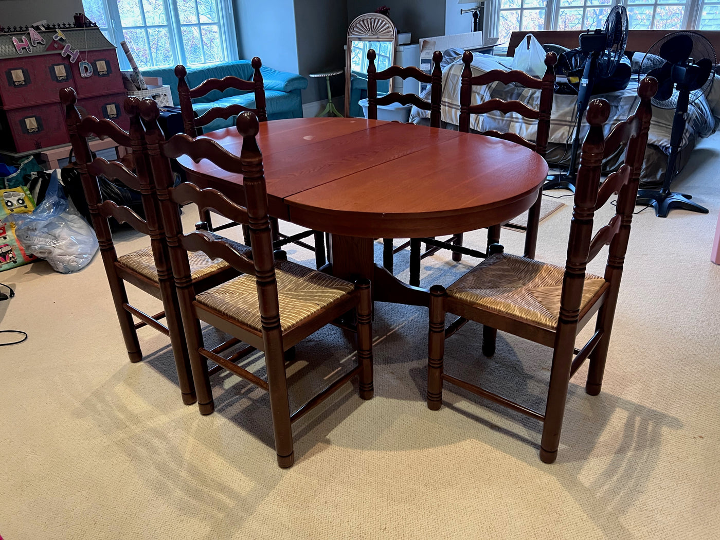 Solid Wood Pedestal Dining Table + 6 Chairs.