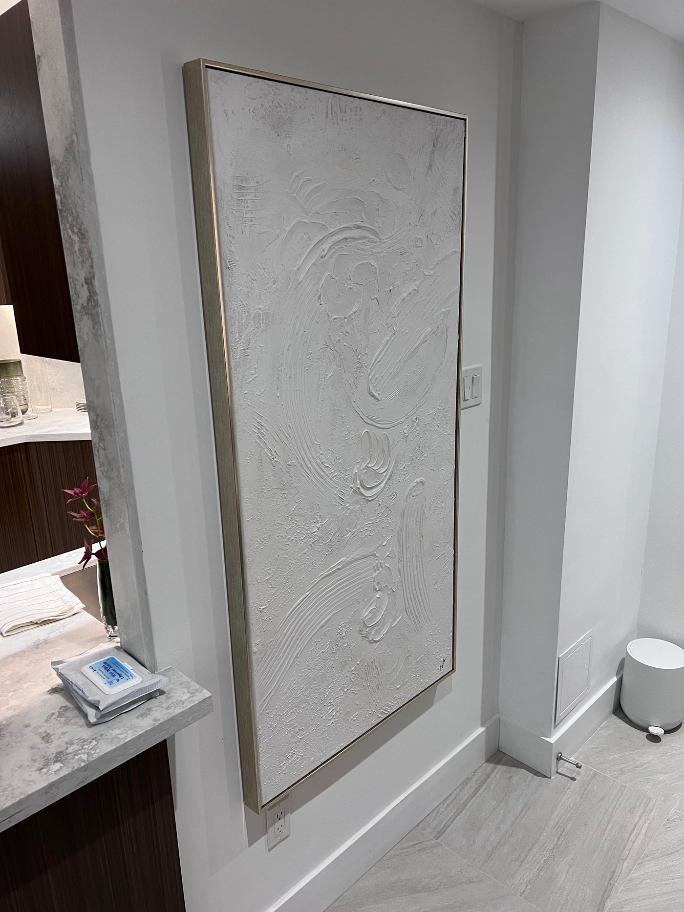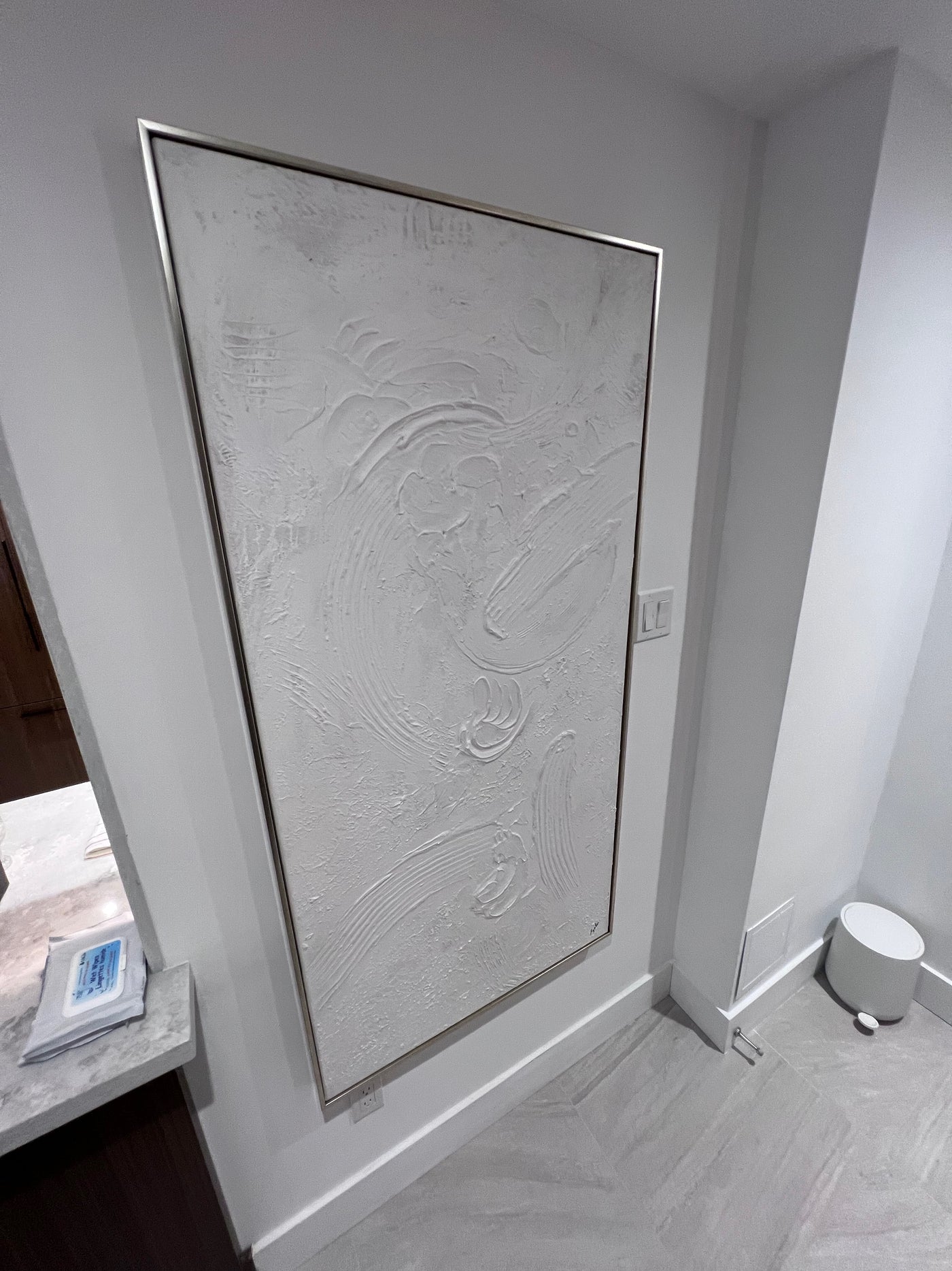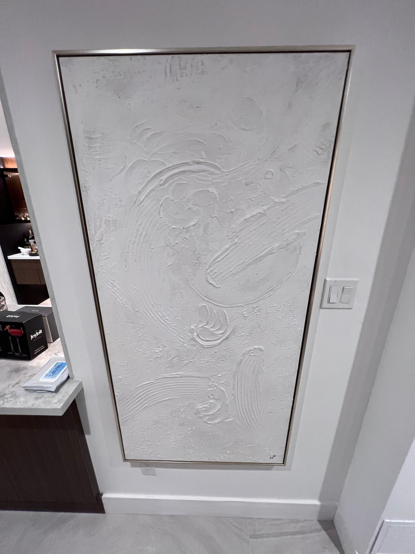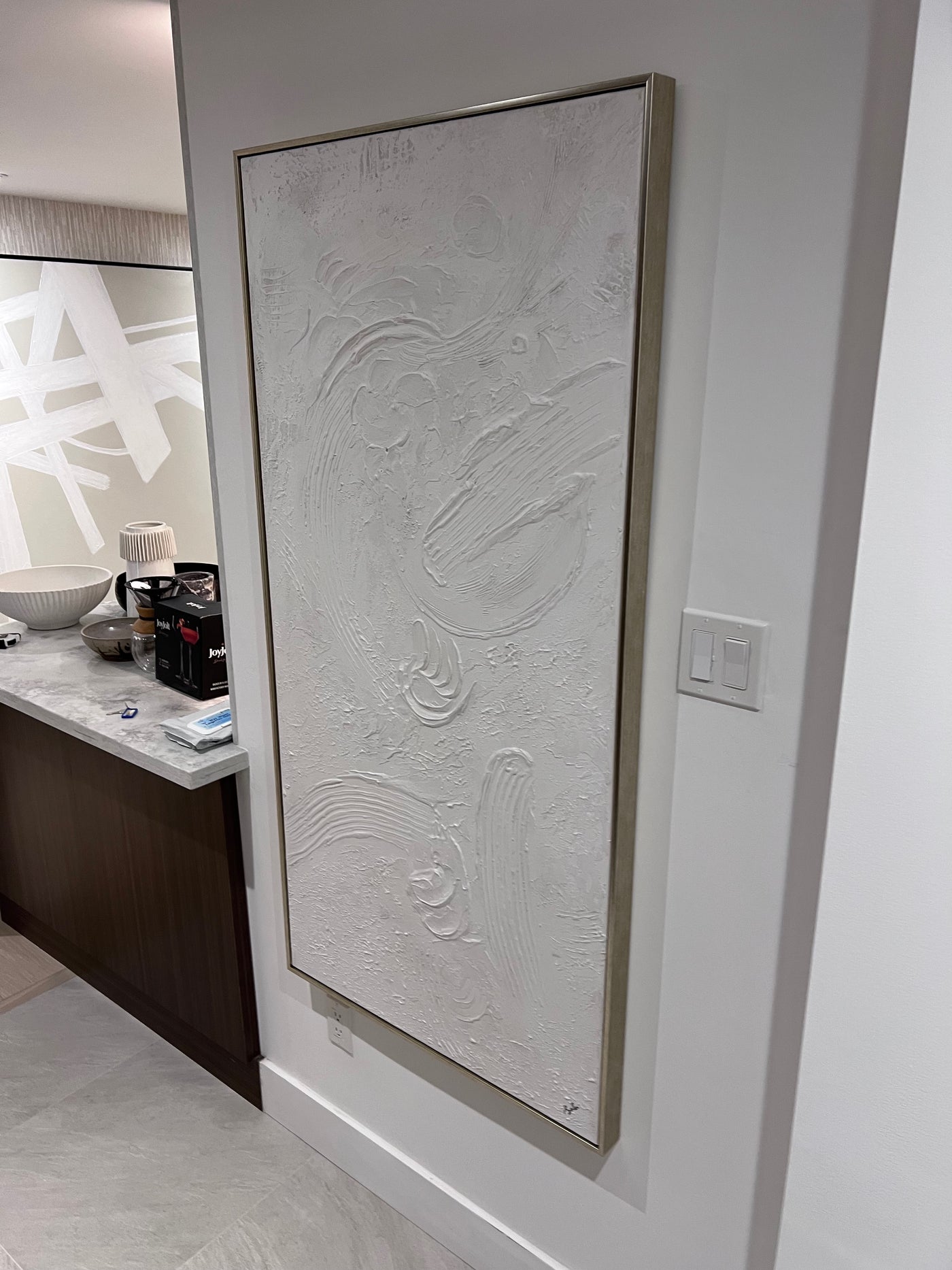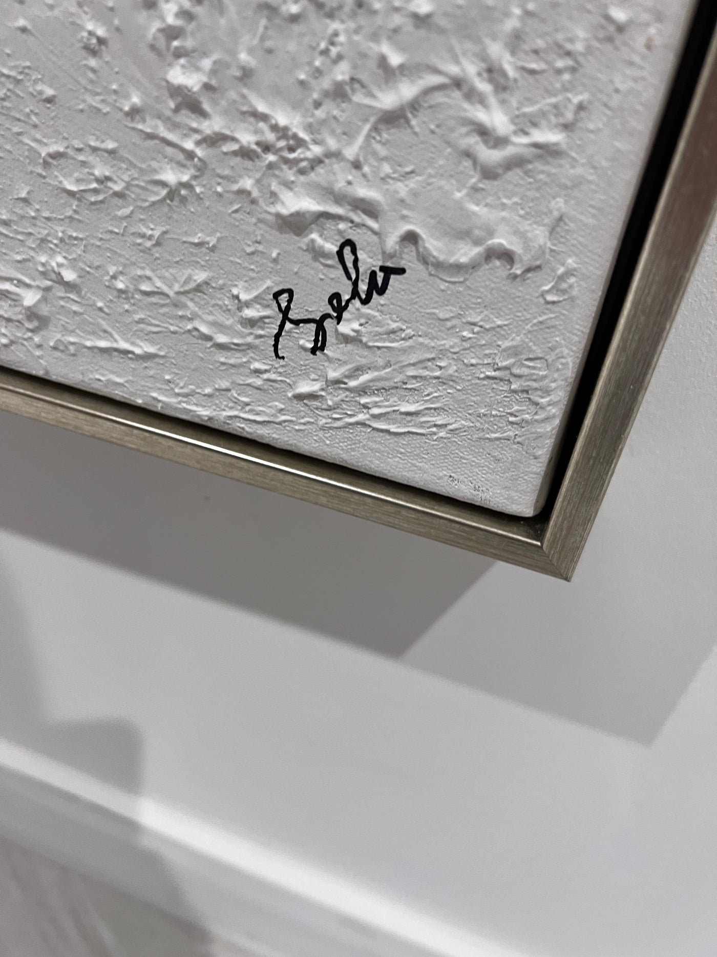 Yanno Artwork brings tonal texture to your space. Hand-painted by Artist Lola, on canvas with heavy texture and a matte finish in a burnished silver floating frame