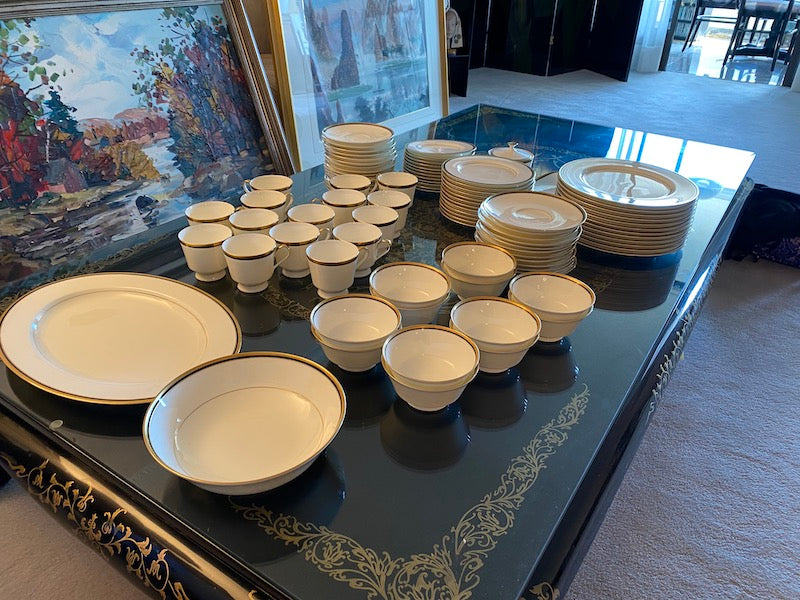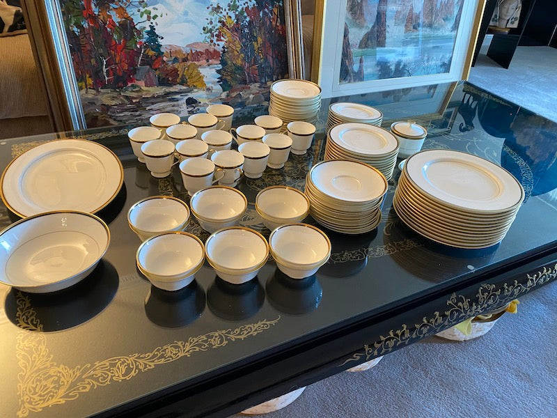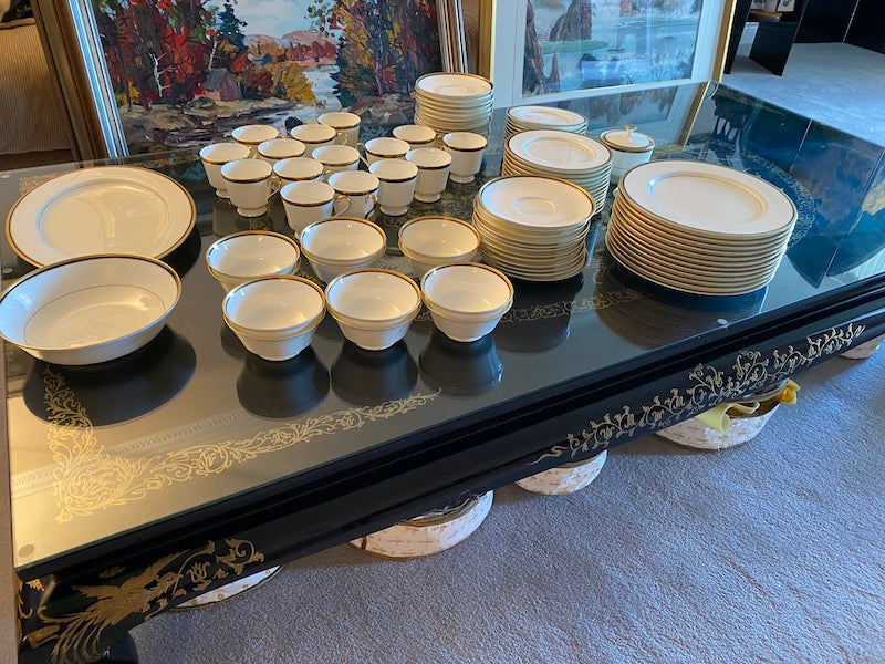 12 dinner plates12 side plates12 bread and butter plates12 cups12 saucers12 soup bowls12 soup saucersSugar dishGravy BoatServing BowlServing Platter