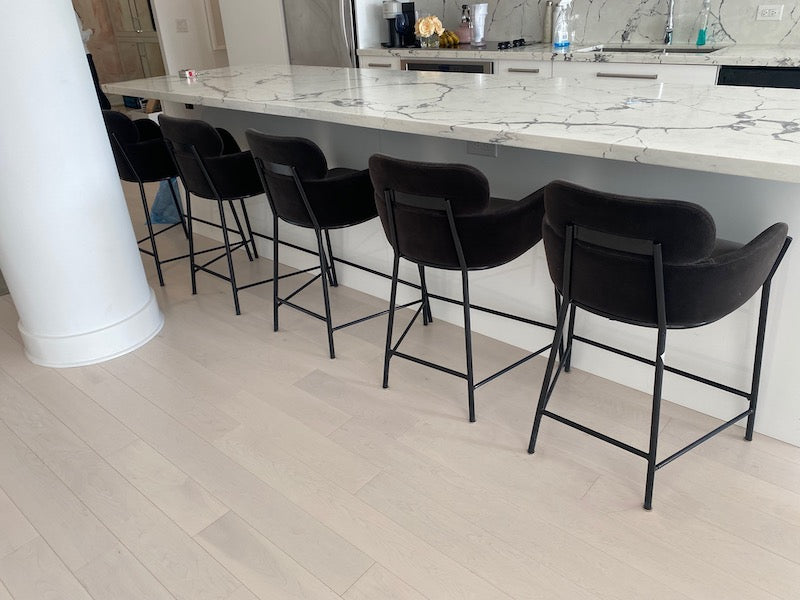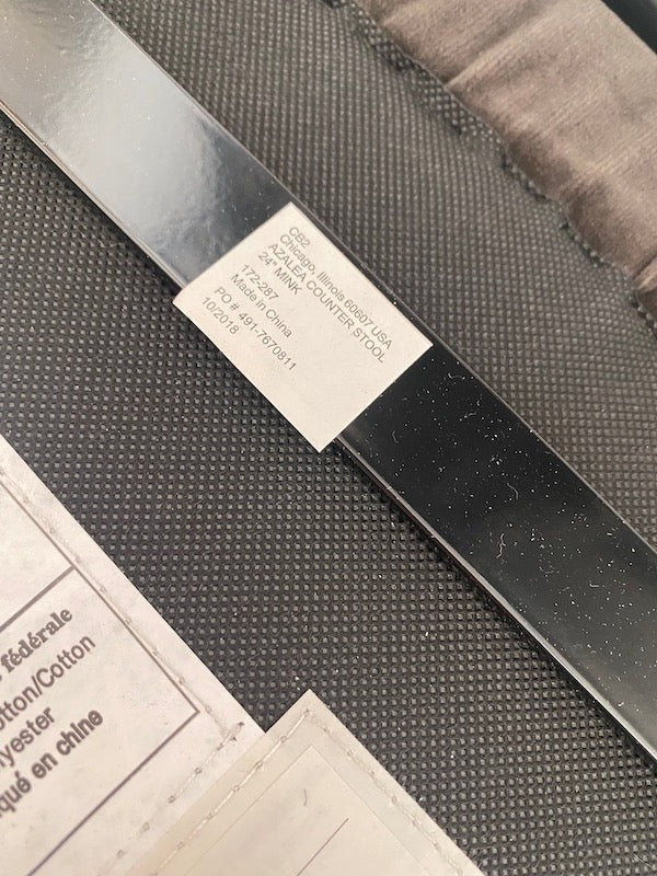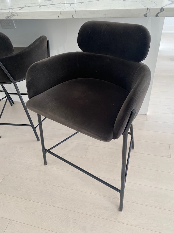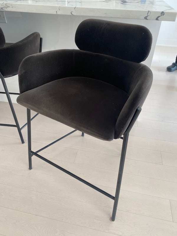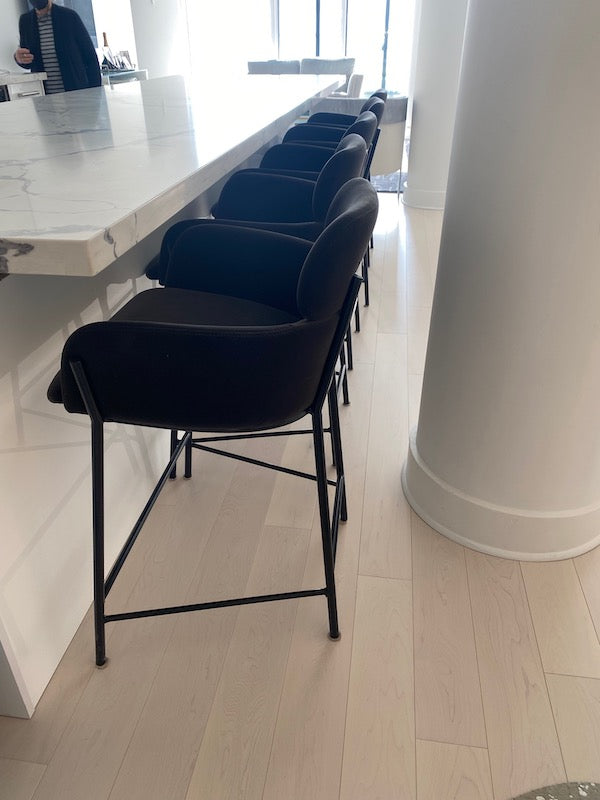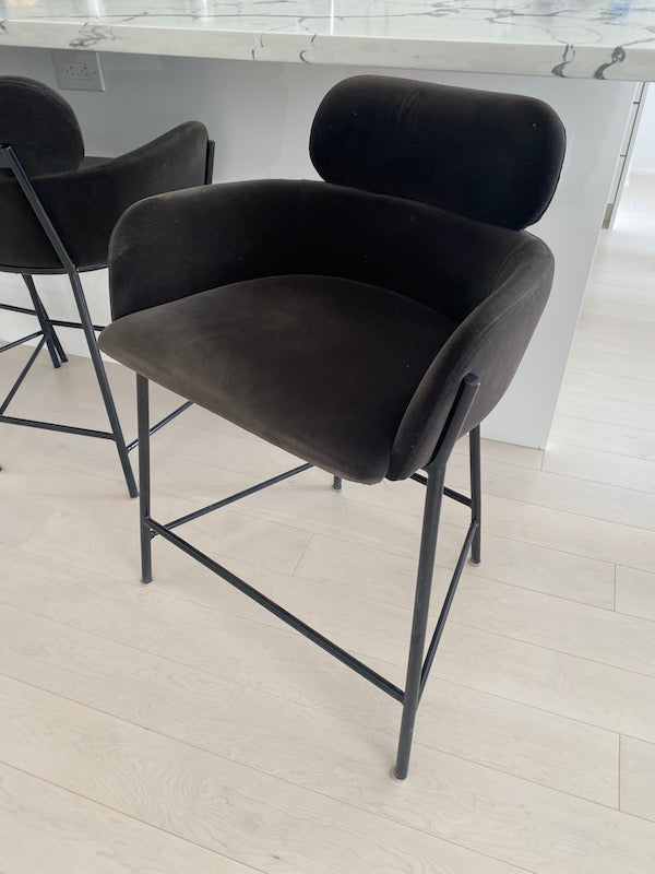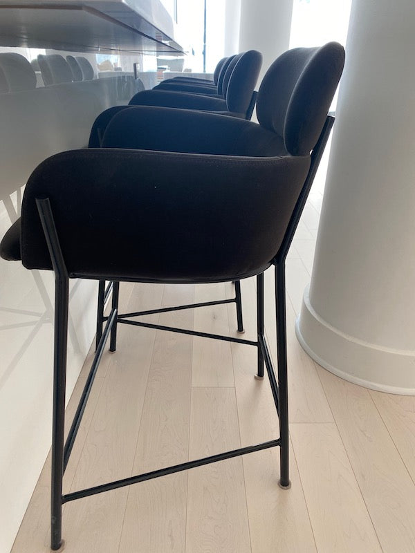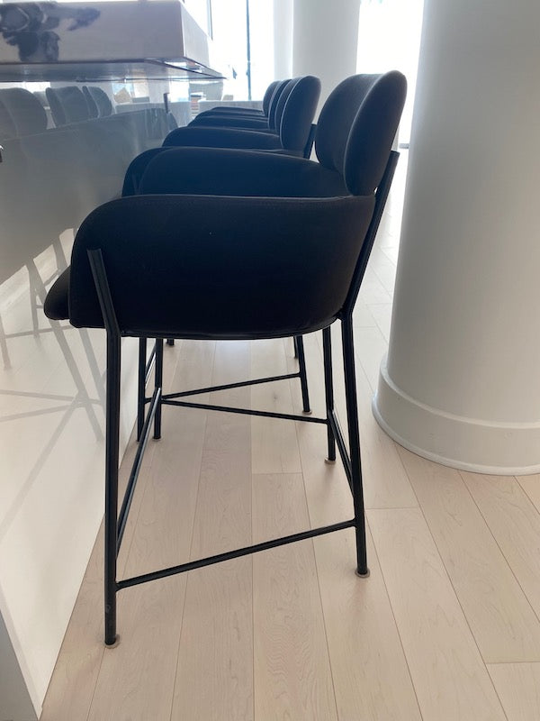 5 Black 'AZALEA MINK COUNTER STOOLS' from CB2. Wrap around. Designed by Caleb Zipperer and curved with two tiers of comfort. Mink stool invites guests to stay a while. Sits plush with bottom tier sized right for arm resting