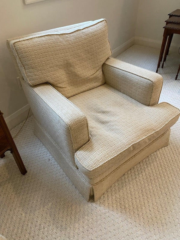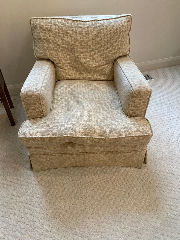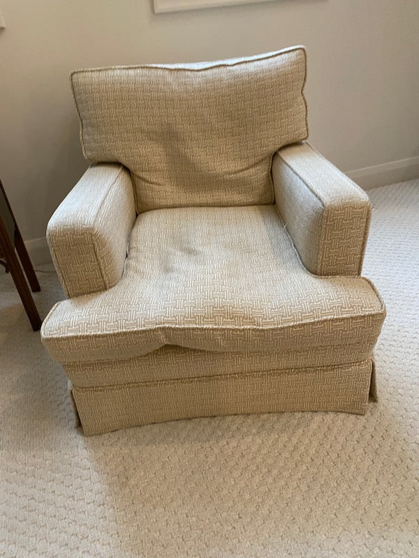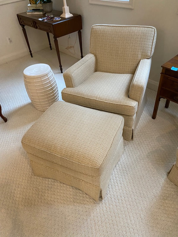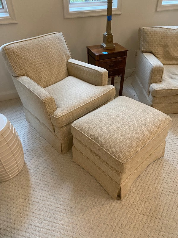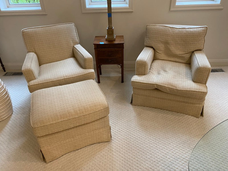 2 Beige Upholstered Armchairs + 1 Ottoman.