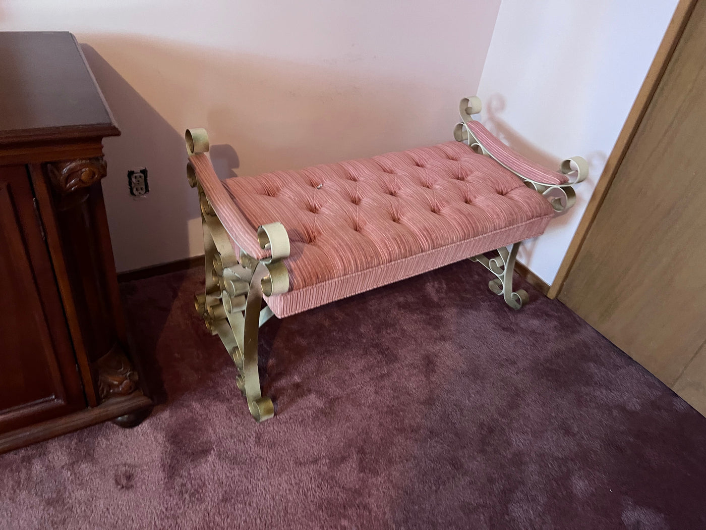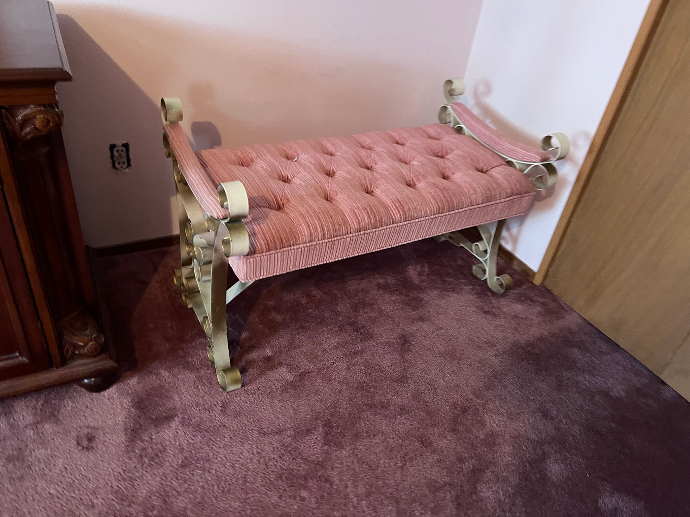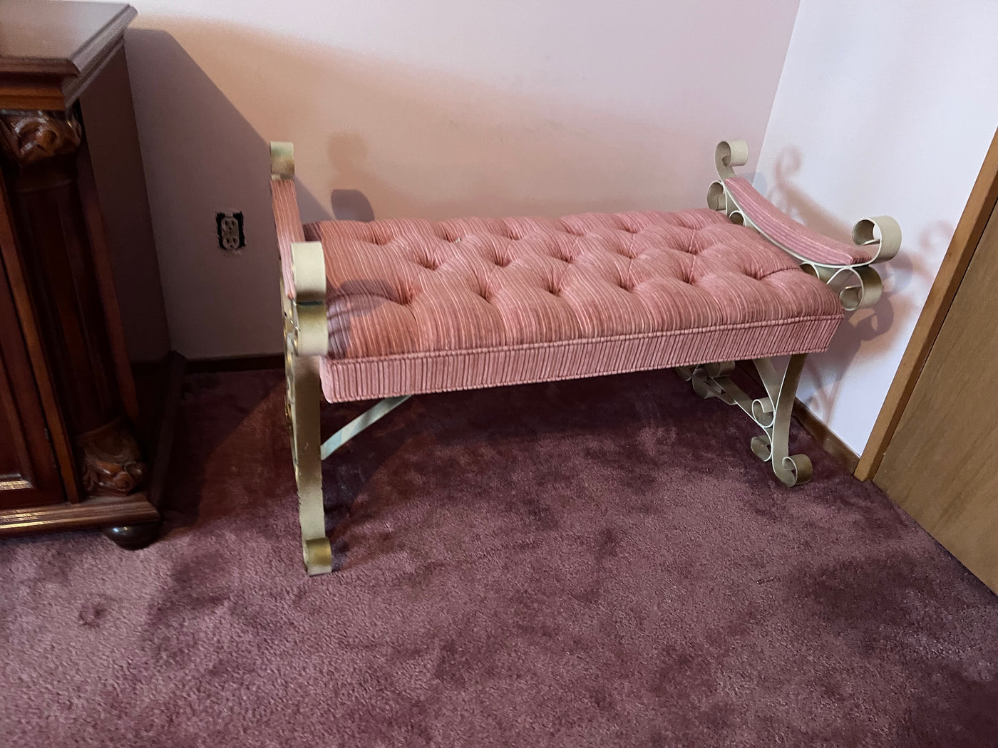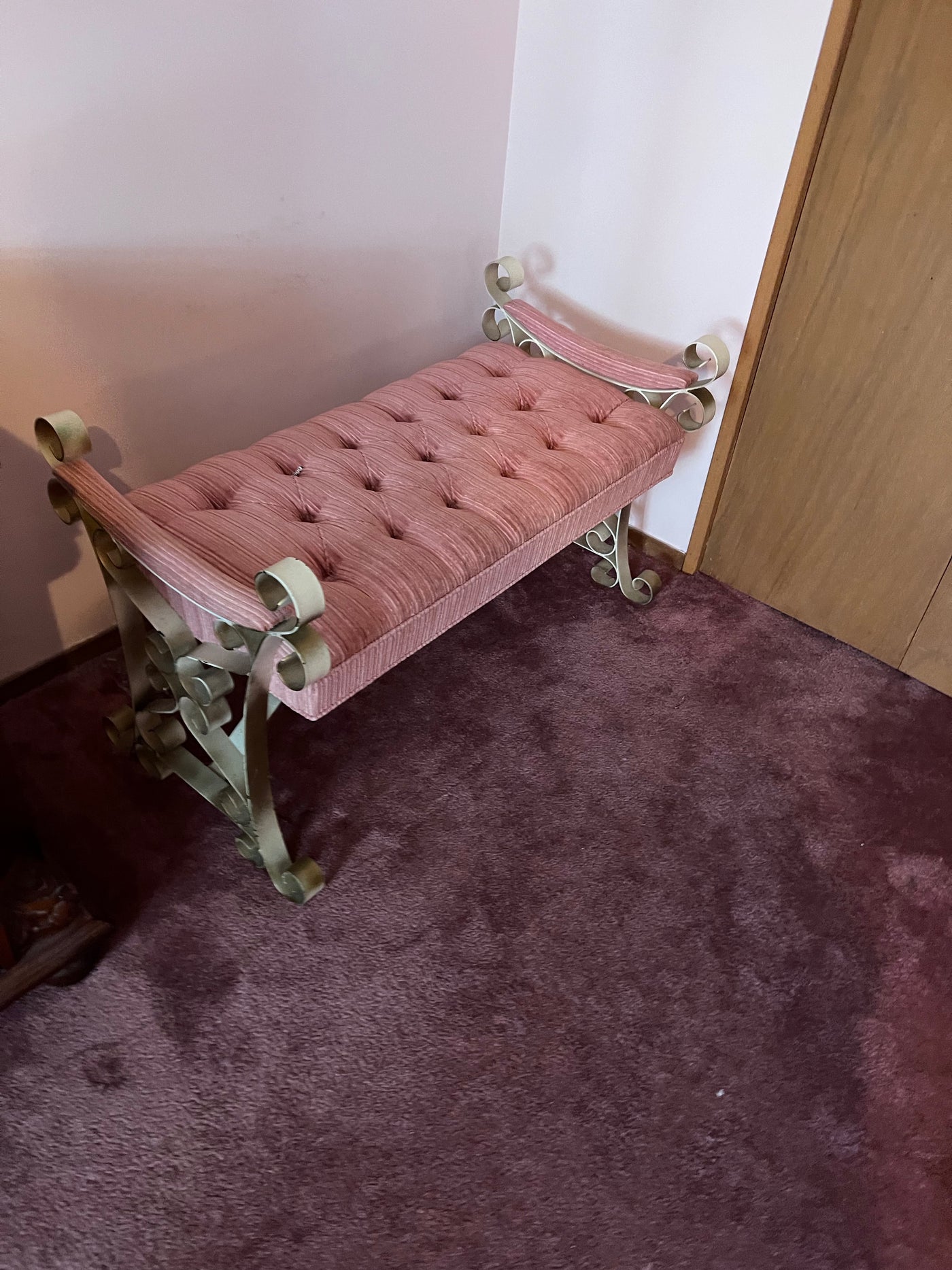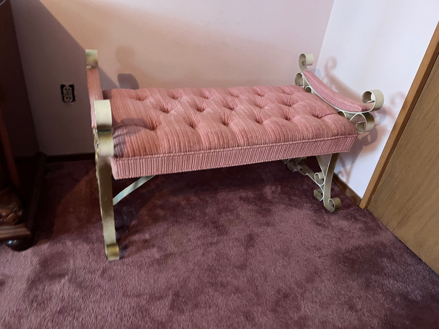 Vintage Pink Tufted Bench, Metal Frame.